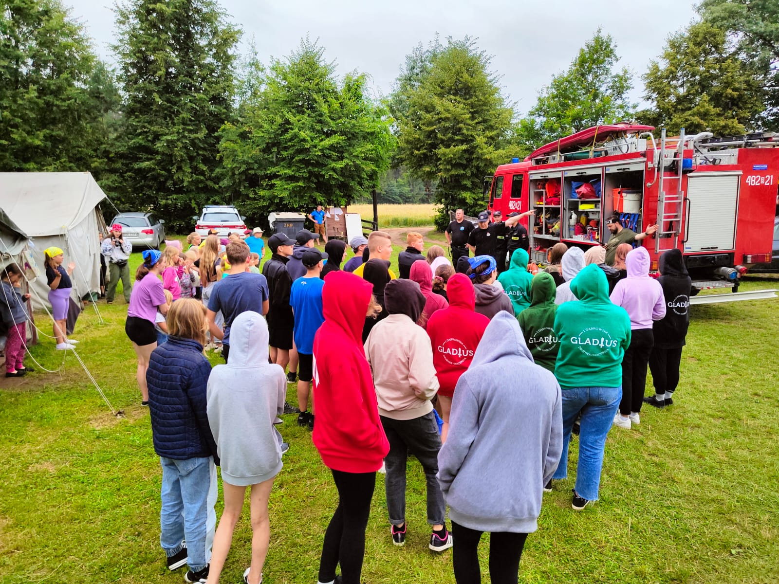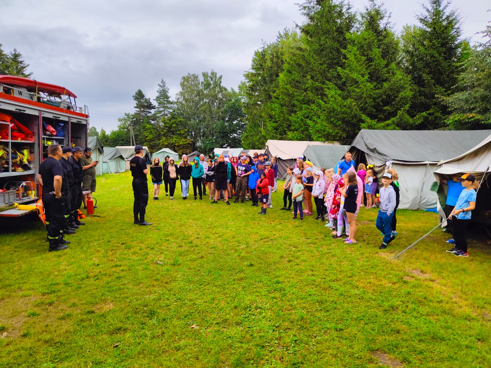 Realizując działania edukacyjne w ramach prewencji społecznej, strażacy PSP przeprowadzili również pogadankę dotyczącą zasad bezpieczeństwa podczas letniego wypoczynku nad wodą i w lesie, omówili zasady postępowania na wypadek powstania pożaru lub innego miejscowego zagrożenia na terenie obozu ze szczególnym uwzględnieniem niebezpiecznych zjawisk atmosferycznych, użycia podręcznego sprzętu gaśniczego i alarmowania służb przy wykorzystaniu numeru alarmowego 112. Zaprezentowano i omówiono również sprzęt znajdujący się na wyposażeniu wozu bojowego Posterunku JRG Sokółka w Dąbrowie Białostockiej.