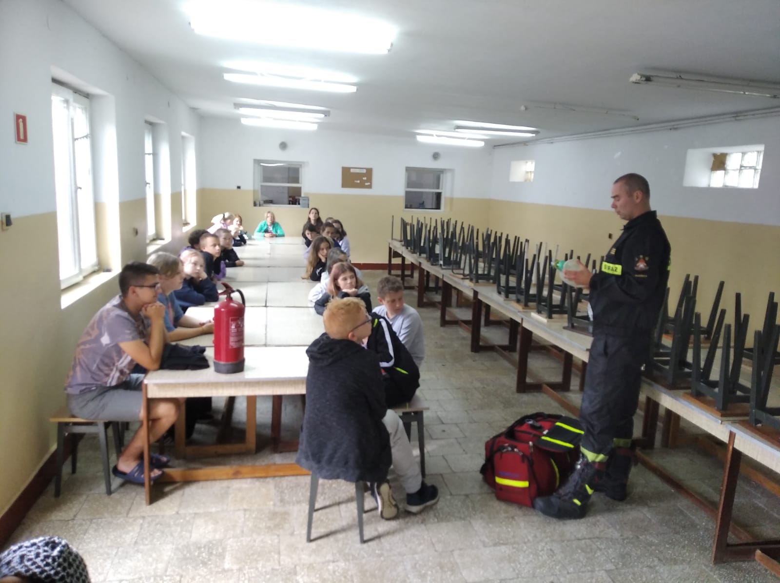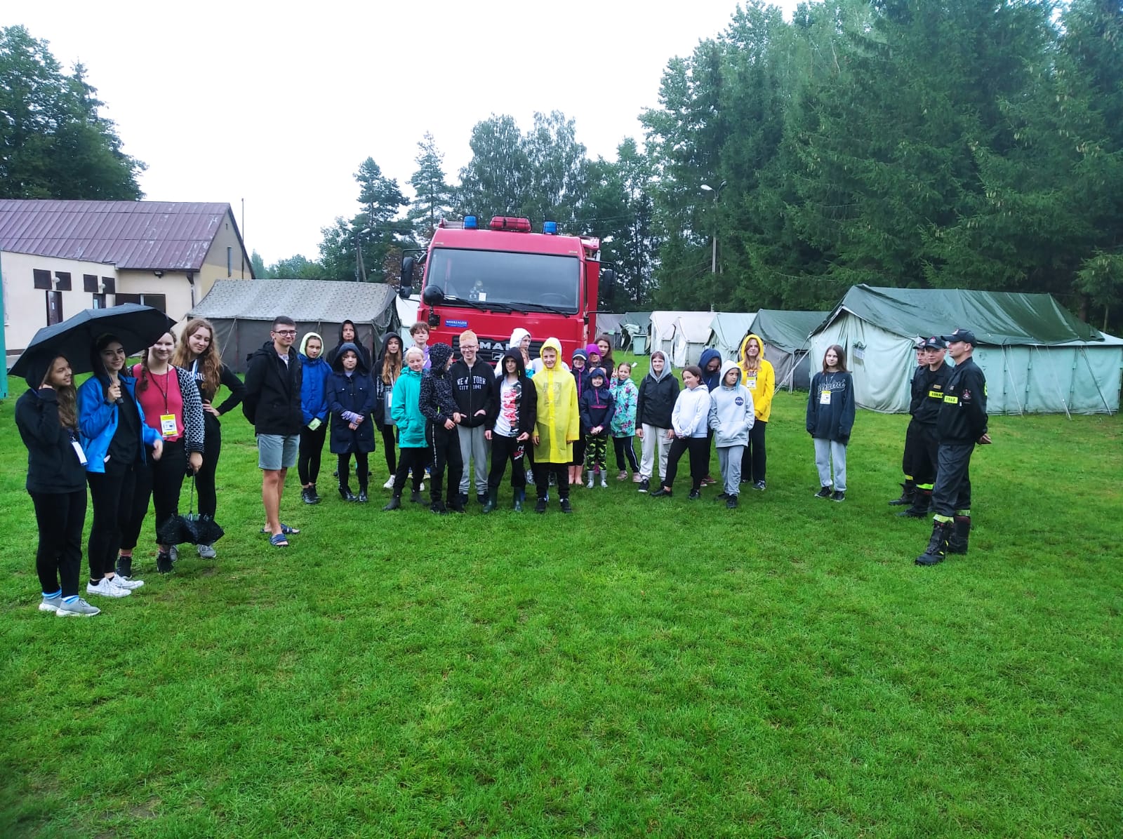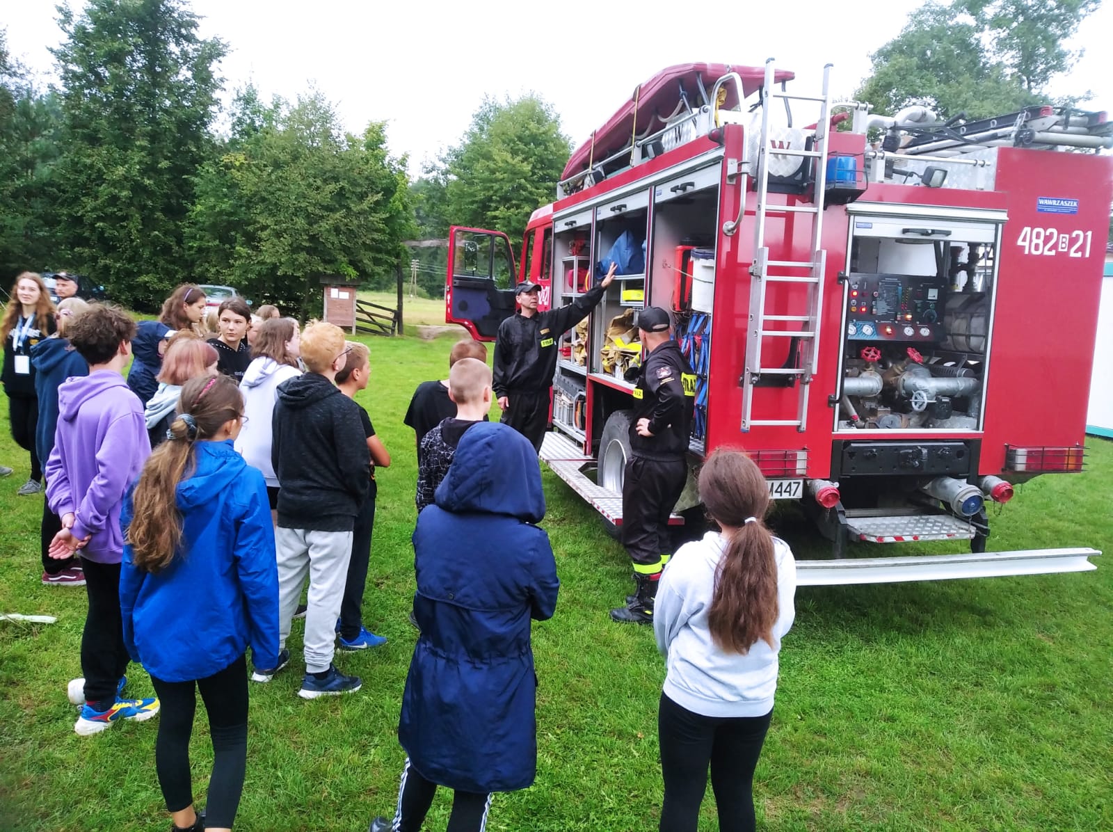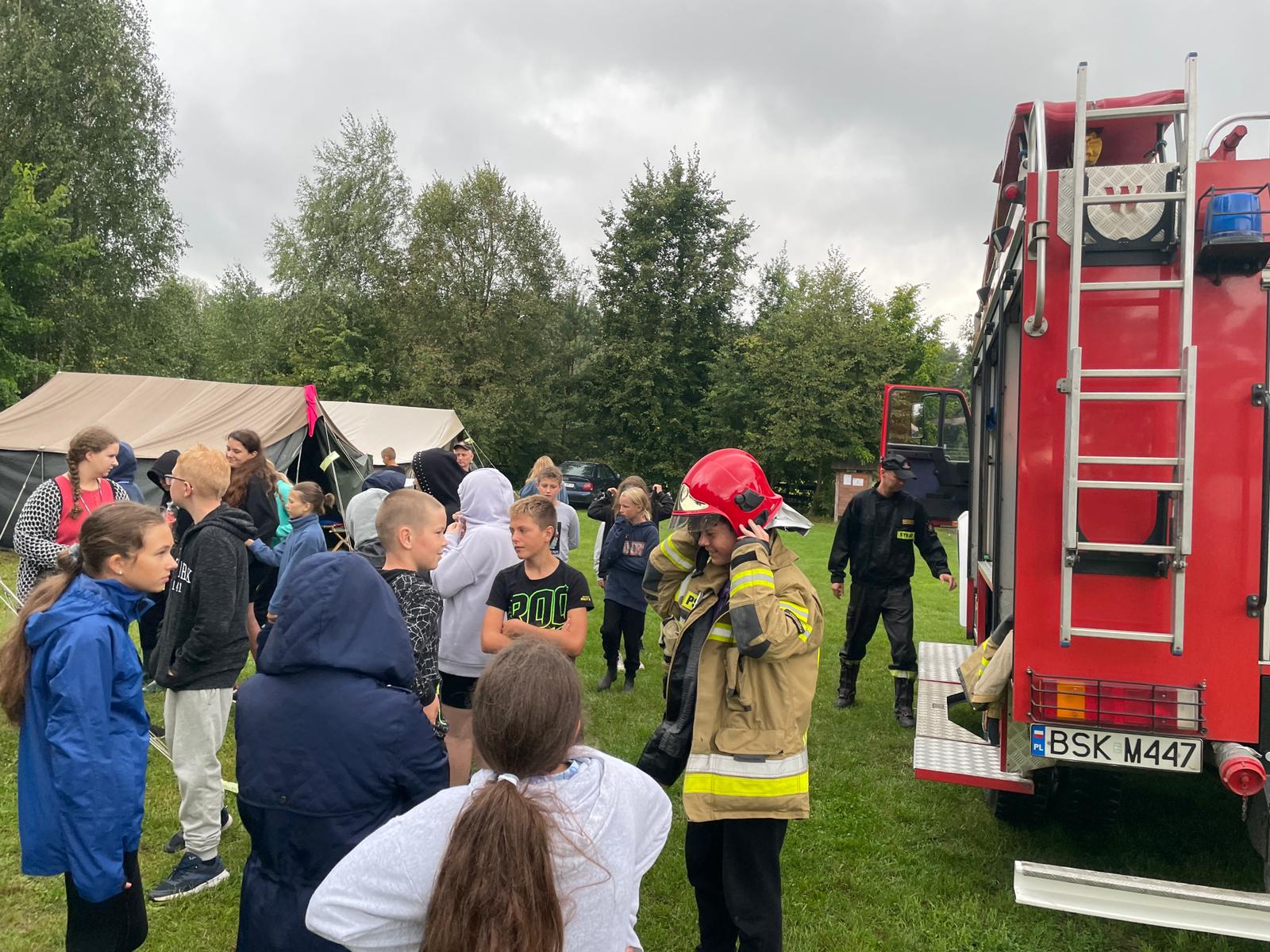 Realizując działania edukacyjne w ramach prewencji społecznej, strażacy Państwowej Straży Pożarnej przeprowadzili również pogadankę dotyczącą zasad bezpieczeństwa podczas letniego wypoczynku nad wodą i w lesie, omówili zasady postępowania na wypadek powstania pożaru lub innego miejscowego zagrożenia na terenie obozu ze szczególnym uwzględnieniem niebezpiecznych zjawisk atmosferycznych, użycia podręcznego sprzętu gaśniczego i alarmowania służb przy wykorzystaniu numeru alarmowego 112. Przeprowadzono również pokaz udzielania pierwszej pomocy przedmedycznej, a także zaprezentowano i omówiono sprzęt znajdujący się na wyposażeniu wozu bojowego Posterunku JRG Sokółka w Dąbrowie Białostockiej.