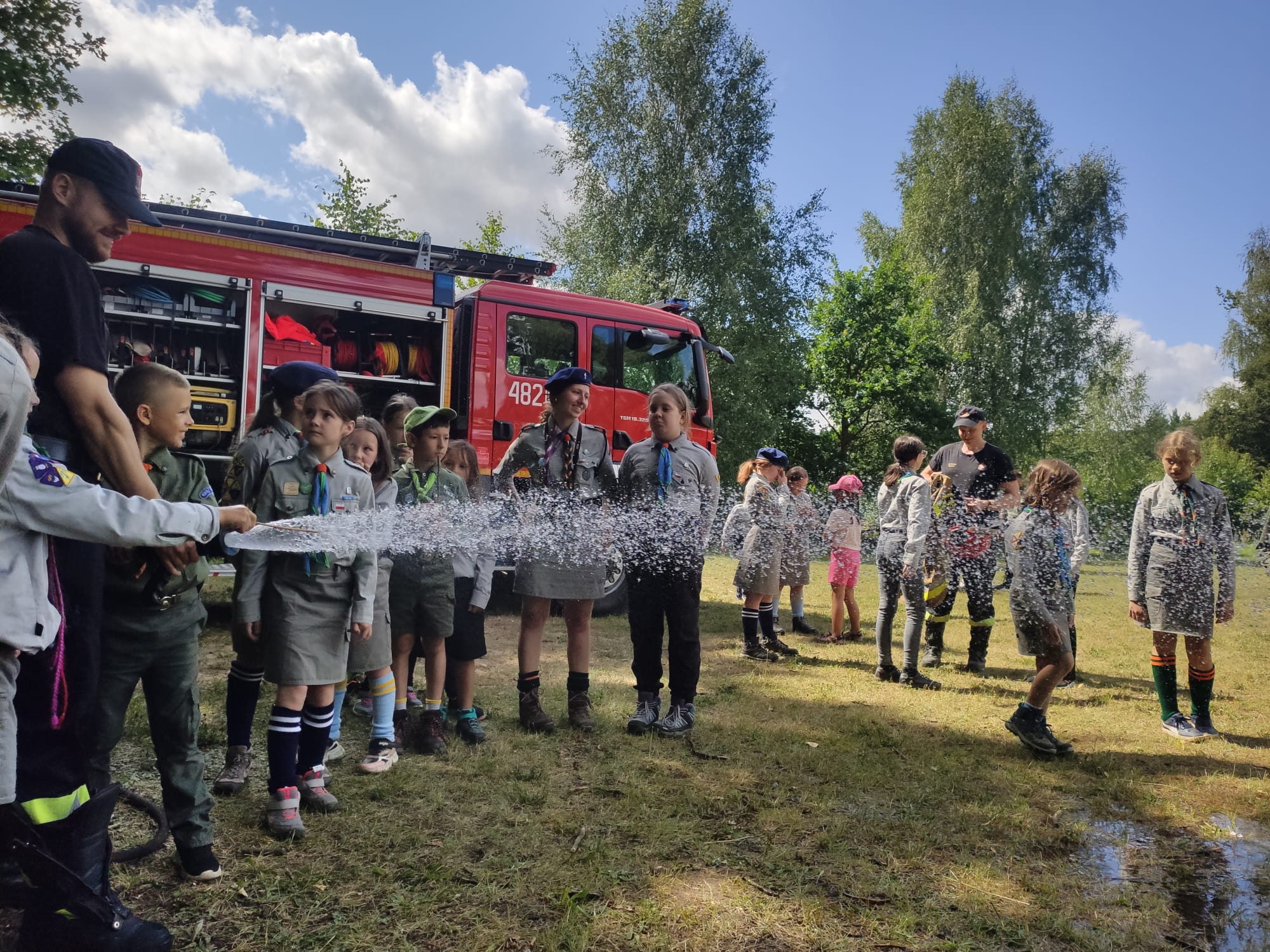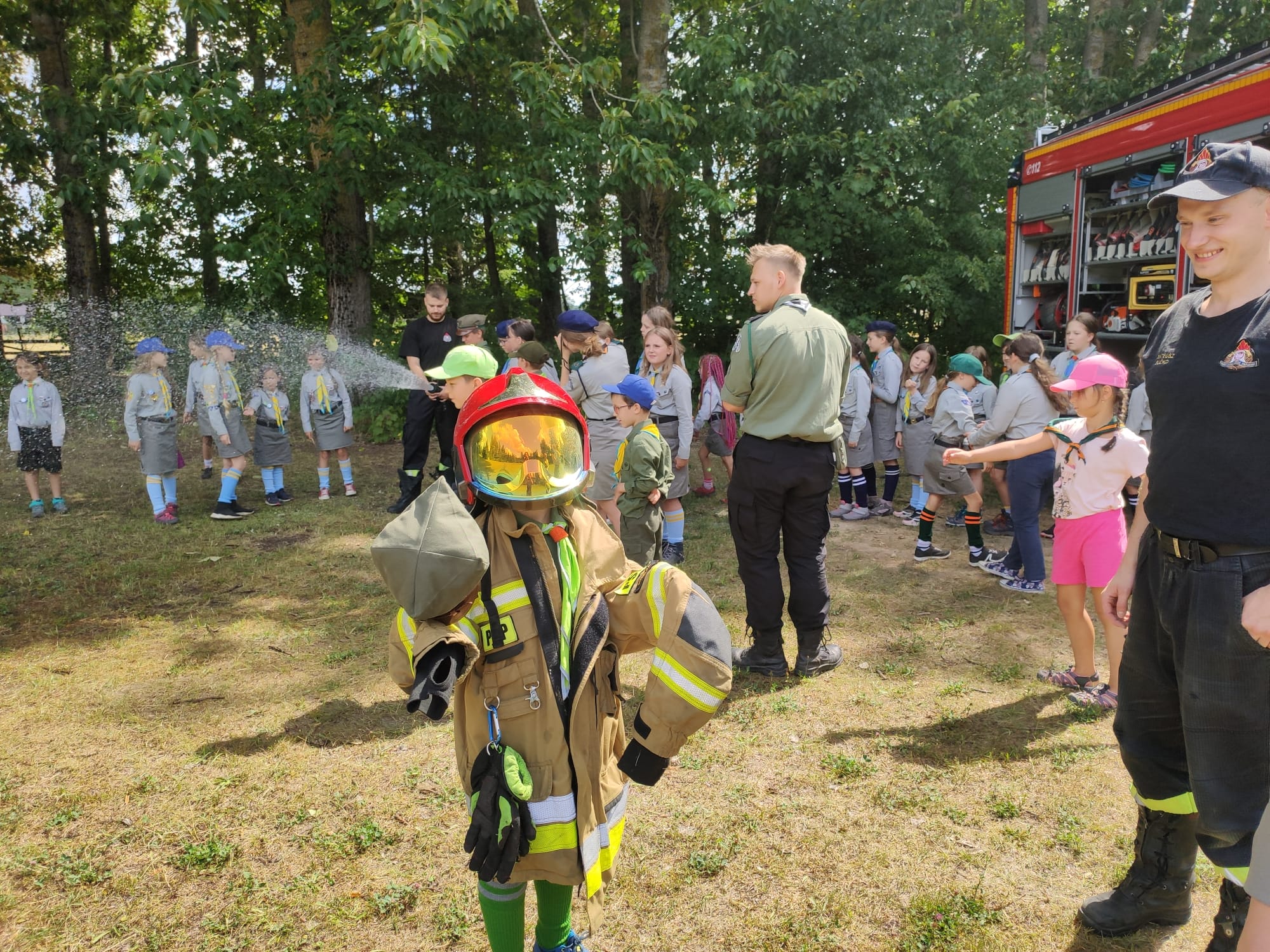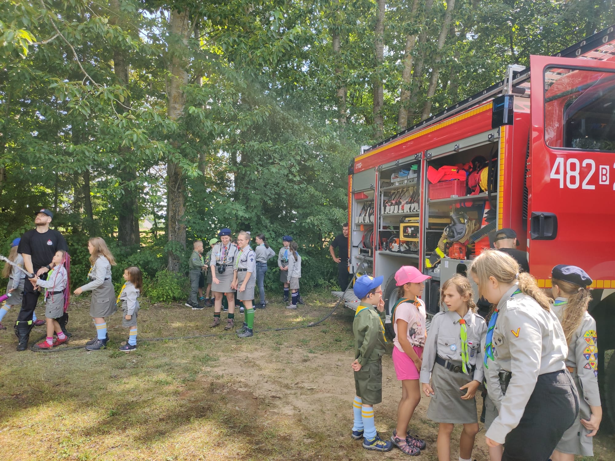 Realizując działania edukacyjne w ramach prewencji społecznej, strażacy PSP przeprowadzili również pogadankę dotyczącą zasad bezpieczeństwa podczas letniego wypoczynku nad wodą i w lesie, omówili zasady postępowania na wypadek powstania pożaru lub innego miejscowego zagrożenia na terenie obozu ze szczególnym uwzględnieniem niebezpiecznych zjawisk atmosferycznych, użycia podręcznego sprzętu gaśniczego i alarmowania służb przy wykorzystaniu numeru alarmowego 112. Zaprezentowano i omówiono również sprzęt znajdujący się na wyposażeniu wozu bojowego Posterunku JRG Sokółka w Dąbrowie Białostockiej.