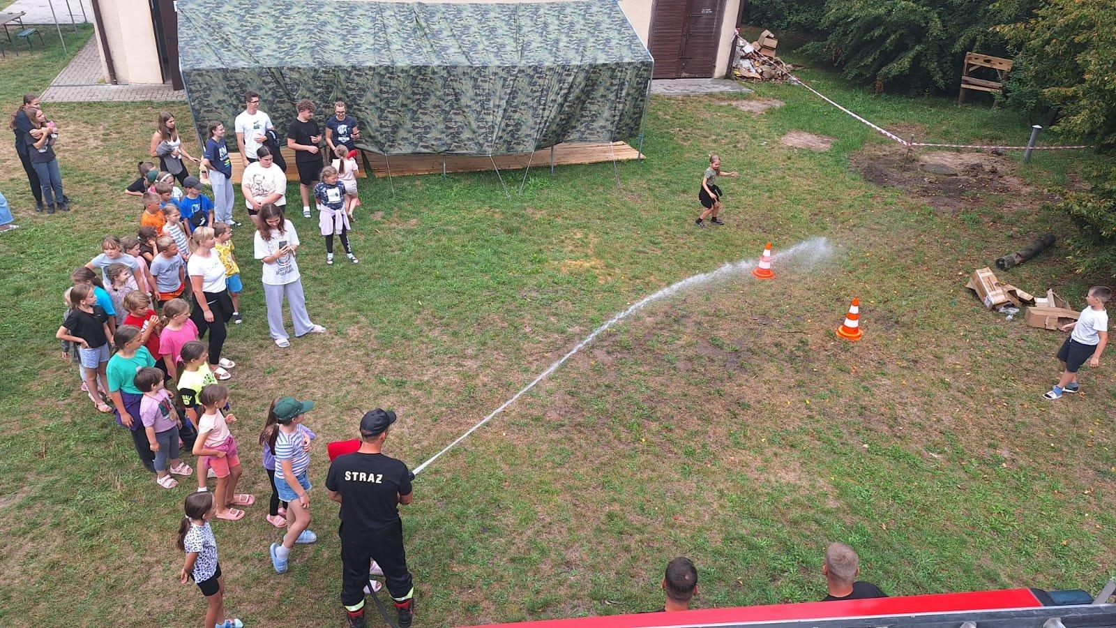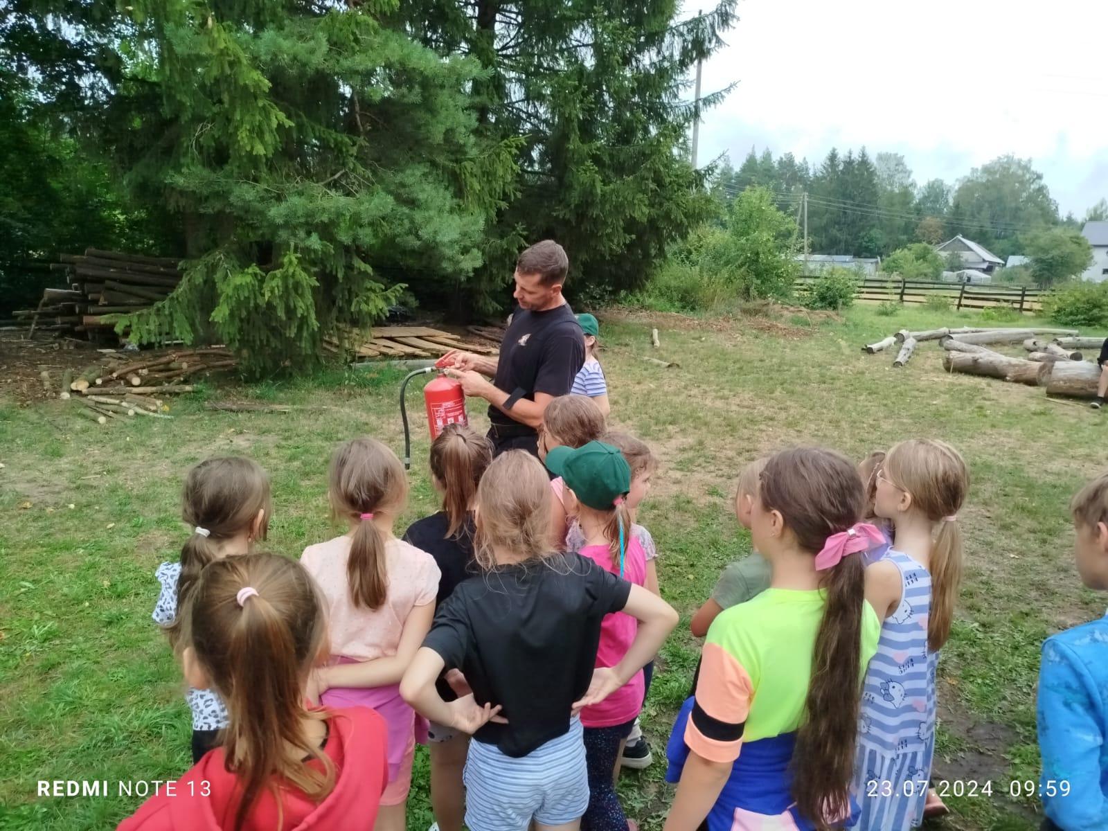 Realizując działania edukacyjne w ramach prewencji społecznej, strażacy PSP przeprowadzili również pogadankę dotyczącą zasad bezpieczeństwa podczas letniego wypoczynku nad wodą i w lesie, omówili zasady postępowania na wypadek powstania pożaru lub innego miejscowego zagrożenia na terenie obozu ze szczególnym uwzględnieniem niebezpiecznych zjawisk atmosferycznych, użycia podręcznego sprzętu gaśniczego i alarmowania służb przy wykorzystaniu numeru alarmowego 112. Zaprezentowano i omówiono również sprzęt znajdujący się na wyposażeniu wozu bojowego Posterunku JRG Sokółka w Dąbrowie Białostockiej.