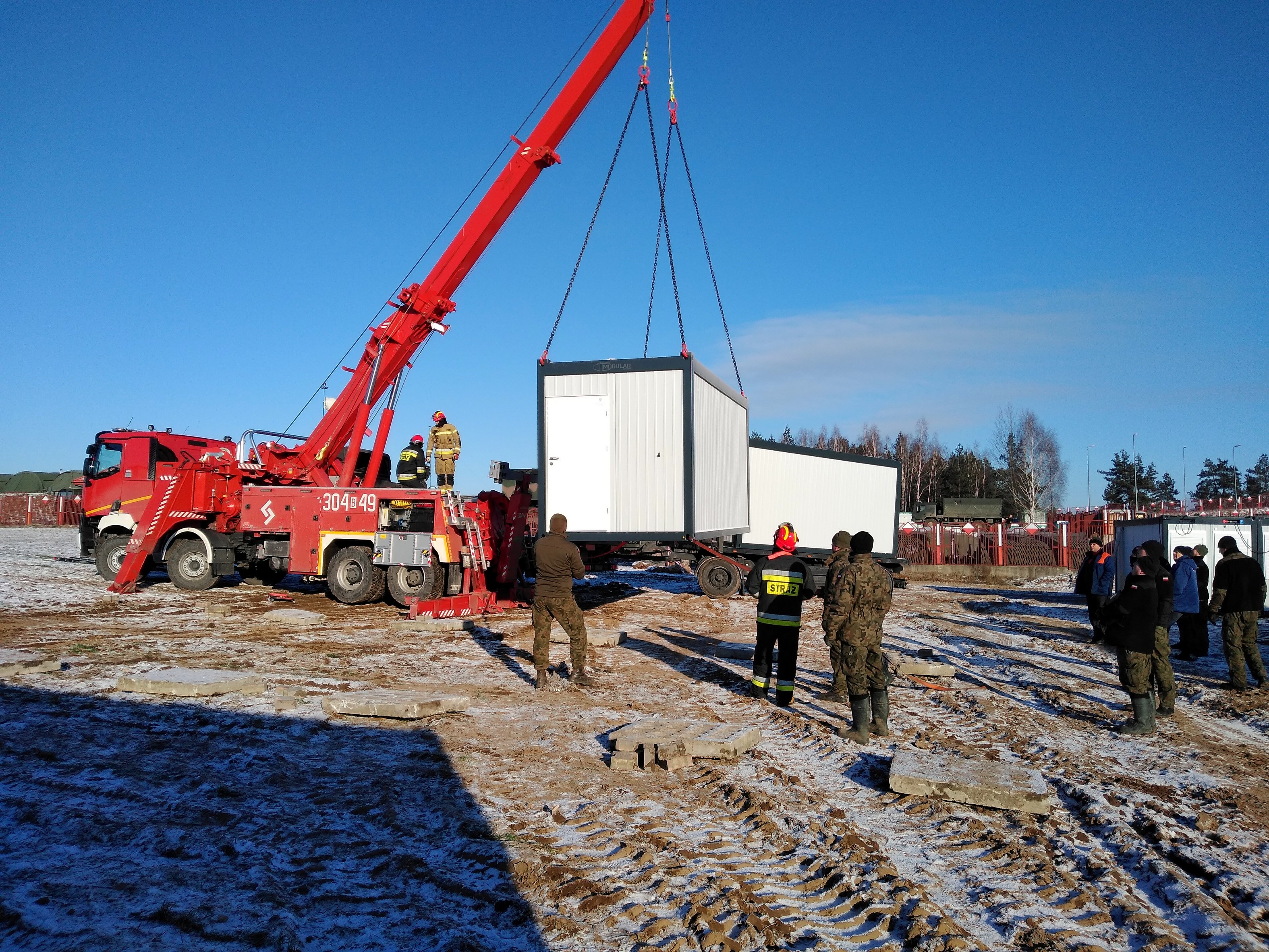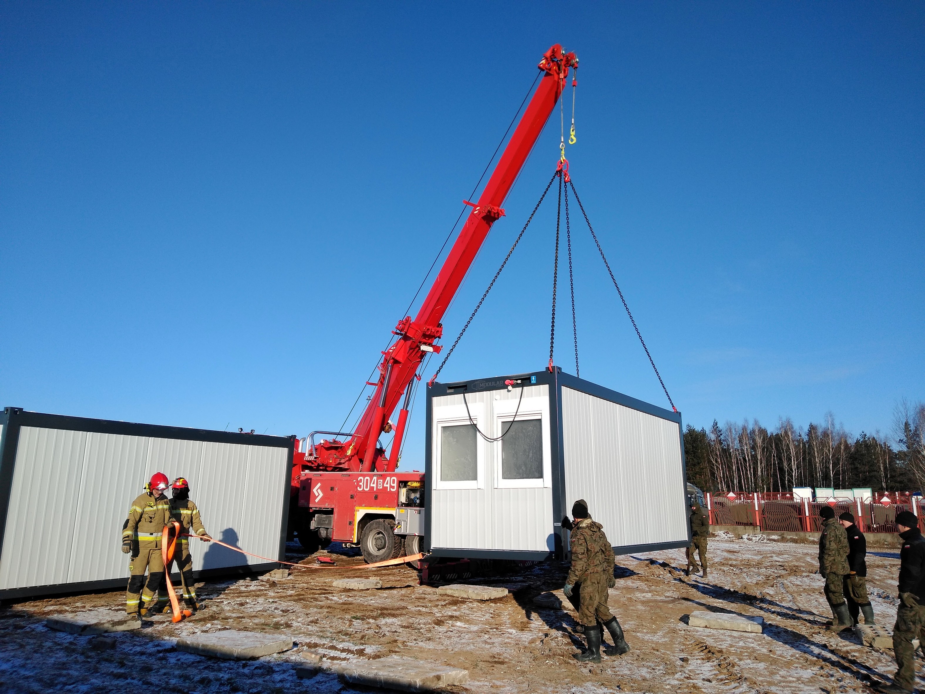W środę 22 grudnia br. strażacy powiatu sokólskiego i białostockiego oraz Grupa Operacyjna Komendanta Wojewódzkiego PSP, kolejny dzień wspierali działania służb mundurowych w zakresie rozładunku kontenerów mieszkalnych z samochodów ciężarowych przy pomocy SCRt typ MEGA-CITY ROTATOR i SCRt Scania z JRG nr 4 KM PSP w Białymstoku. Kontenery kwaterunkowe mają za zadanie poprawić komfort pełnienia służby na polsko- białoruskiej granicy w niekorzystnych warunkach atmosferycznych.