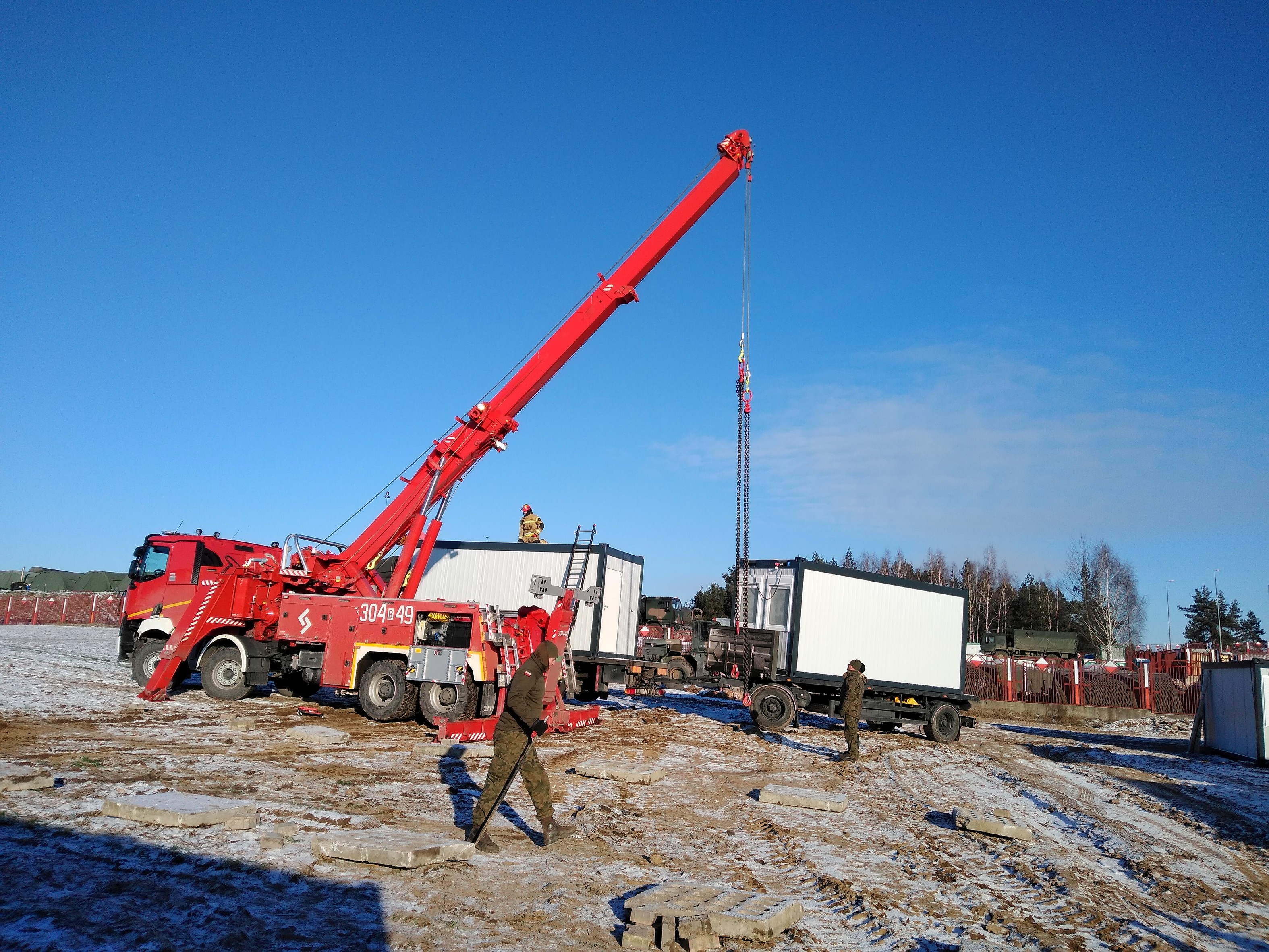 Działania polegały na rozładunku przy pomocy ww. sprzętu 12 kontenerów mieszkalnych i ustawieniu ich w miejscu wskazanym przez Wojsko Polskie.