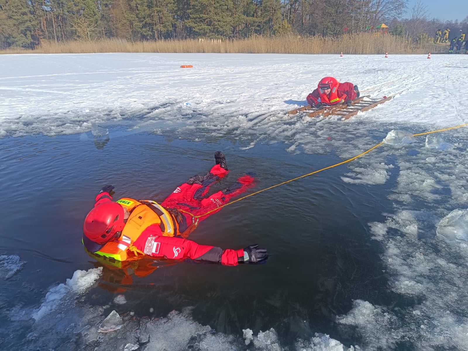W ćwiczeniach na zalewie wodnym w Krynkach uczestniczył zastęp z JRG Sokółka wraz z Instruktorem z zakresu ratownictwa lodowego oraz zastępy OSP KSRG Krynki, Szudziałowo, Zubrzyca Wielka, Kamionka Stara – łącznie 27 osób.