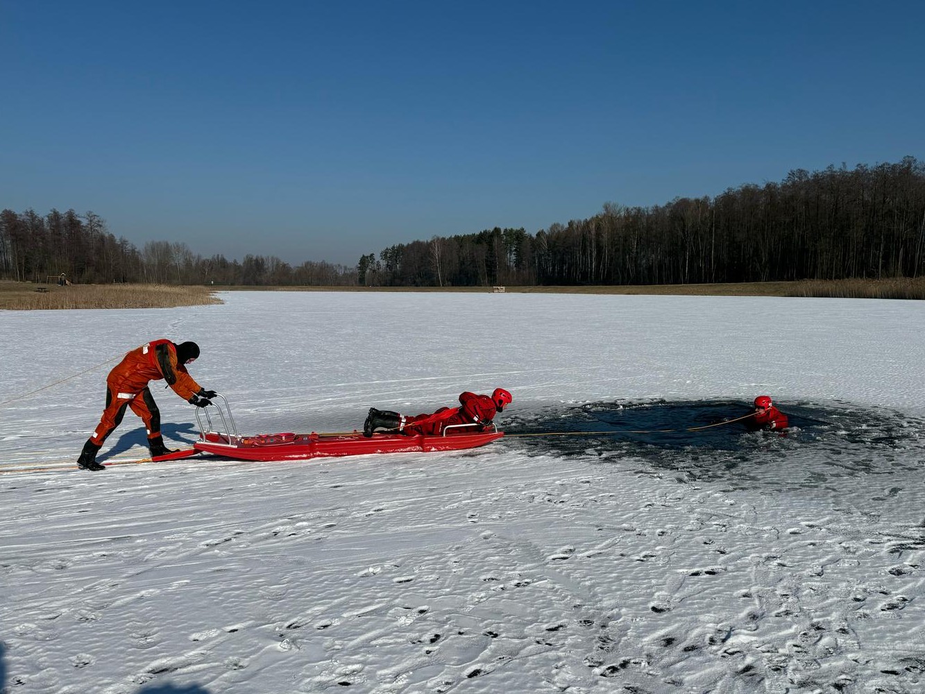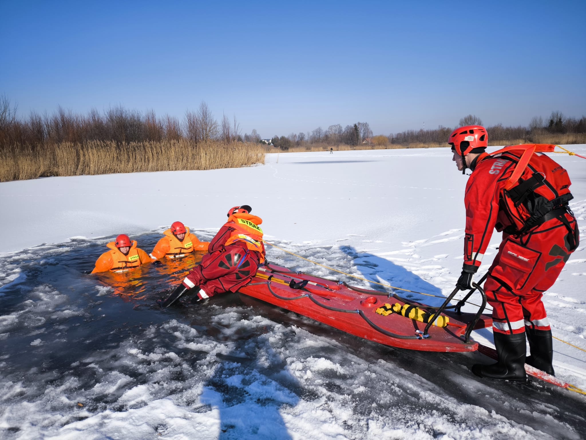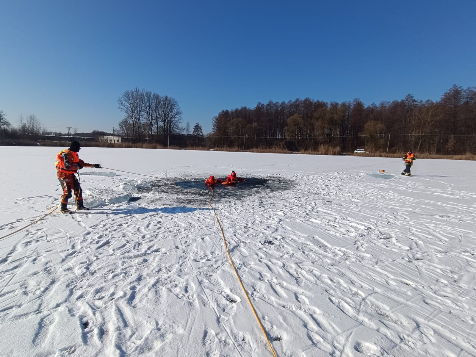 23 lutego 2025 r. na zalewach wodnych w Krynkach, Sidrze oraz Szumowie (gm. Korycin) przeprowadzono 3 ćwiczenia z zakresu ratownictwa lodowego jednostek krajowego systemu ratowniczo – gaśniczego powiatu sokólskiego.
