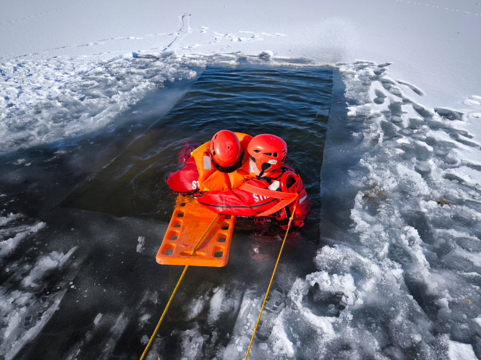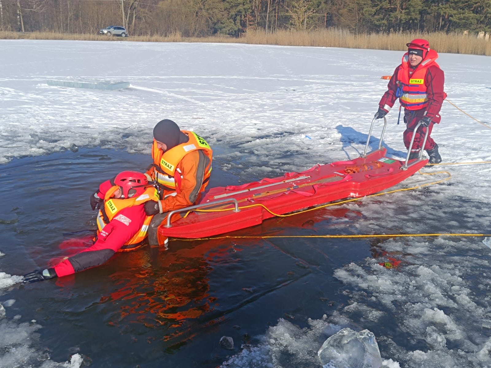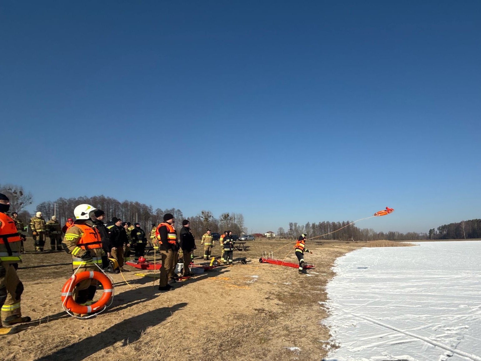 W trakcie zajęć prowadzonych przez dowództwo Jednostki Ratowniczo – Gaśniczej w Sokółce oraz Instruktorów z zakresu ratownictwa lodowego z JRG Sokółka zapoznano się z rodzajem, sposobem wykorzystania oraz parametrami sprzętu ratownictwa wodnego znajdującego się na wyposażeniu JRG i OSP, a następnie praktycznie ćwiczono techniki i warianty ratowania osób pod którymi załamał się lód.
