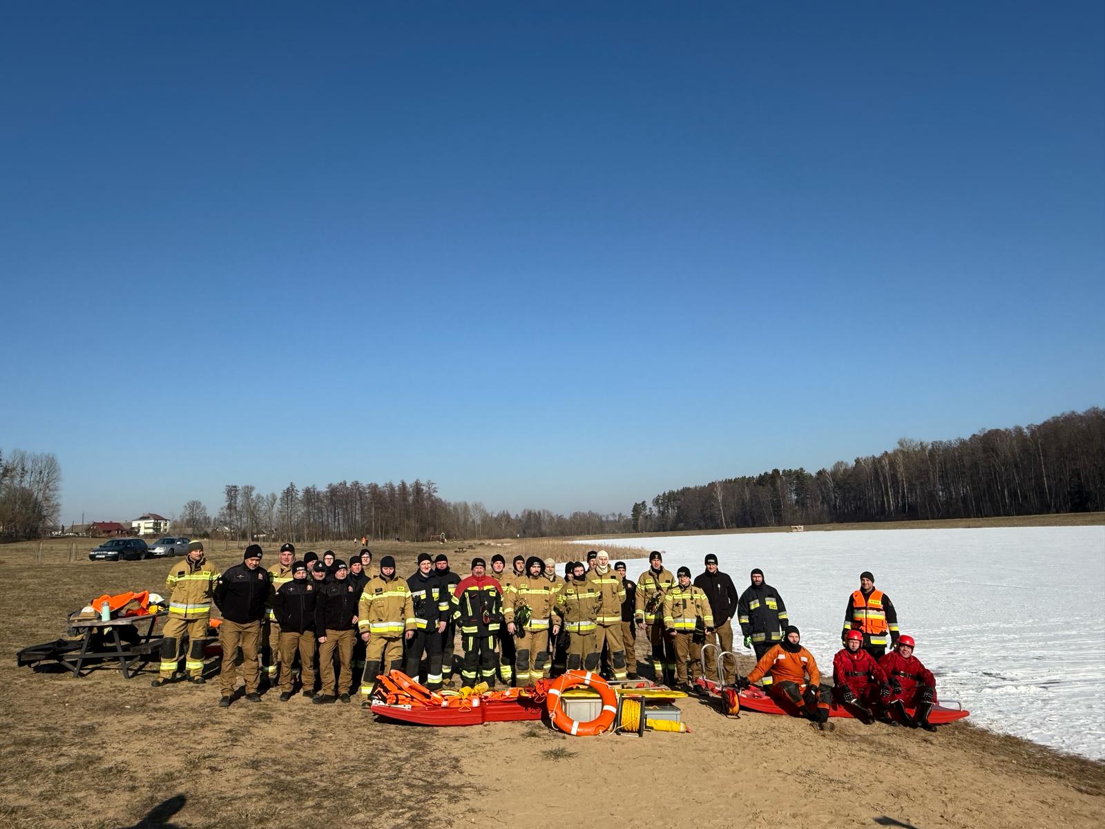 Niedzielny cykl ćwiczeń jednostek PSP i OSP z zakresu ratownictwa lodowego na zamarzniętych akwenach wodnych.