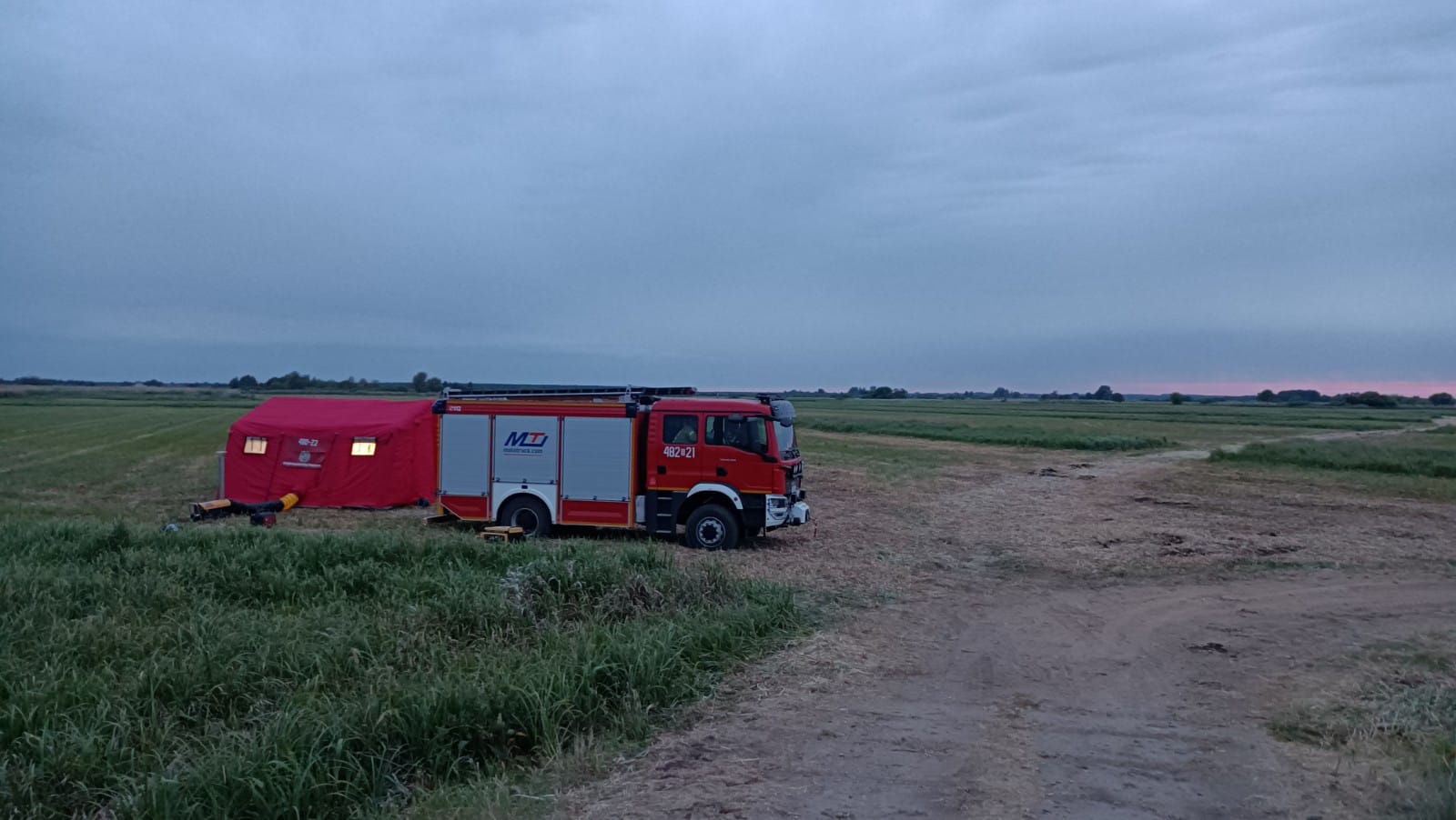 Ze względu na zbliżającą się porę nocną podjęto decyzję o całonocnym dozorze pogorzeliska przez dowództwo JRG Sokółka, zastęp Posterunku JRG w Dąbrowie Białostockiej oraz OSP z terenu gminy Suchowola. Zorganizowano zmianowy system dyżurów poszczególnych zastępów. Na miejsce zdarzenia zadysponowano SLKw z KP PSP Sokółka z namiotem pneumatycznym celem organizacji zaplecza logistycznego. W porze nocnej patrolowano teren przy użyciu pojazdów typu quad z JRG Sokółka i OSP Suchowola. Patrole sukcesywnie dogaszały wykrywane przy użyciu kamery termowizyjnej zarzewia - do działań wykorzystano motopompy pływające pobierające wodę z pobliskiej rzeki Brzozówka. O zdarzeniu powiadomiono PCZK w Sokółce oraz Burmistrza Suchowoli, który przybył na miejsce zdarzenia i zorganizował prowiant pracującym w okresie nocnym ratownikom.