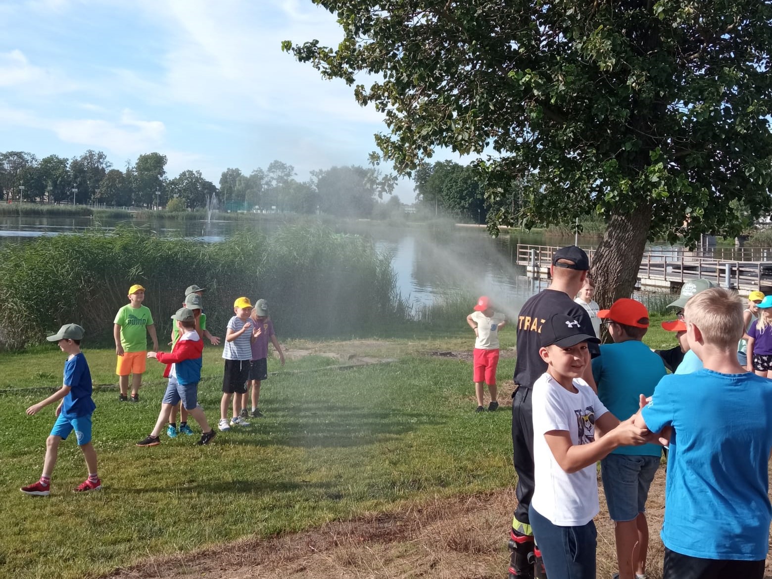 Nad zalewem wodnym w Sokółce strażacy Jednostki Ratowniczo – Gaśniczej w Sokółce przeprowadzili pogadankę o bezpieczeństwie, podczas której poinstruowali dzieci jak zachować się w obliczu różnego rodzaju niebezpieczeństw występujących podczas wakacji. Z uwagi na miejsce spotkania skupiono się na omówieniu sposobów bezpiecznego zachowania podczas wypoczynku nad wodą. Następnie zaprezentowano i omówiono uczestnikom spotkania sprzęt znajdujący się na wyposażeniu wozów bojowych, zapoznano dzieci ze specyfiką pracy strażaka, jego rolą w systemie bezpieczeństwa oraz profilaktyką w zakresie bezpieczeństwa pożarowego w życiu codziennym. Nie lada atrakcją stała się również możliwość zajęcia miejsca w kabinie załogi samochodu ratowniczo-gaśniczego.