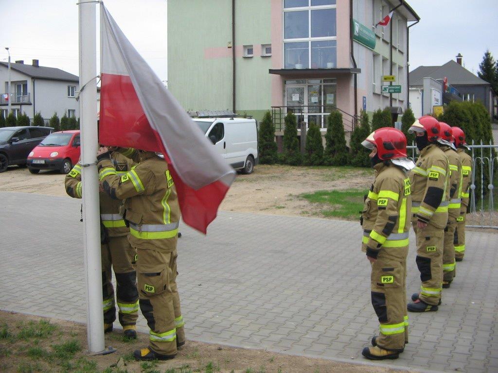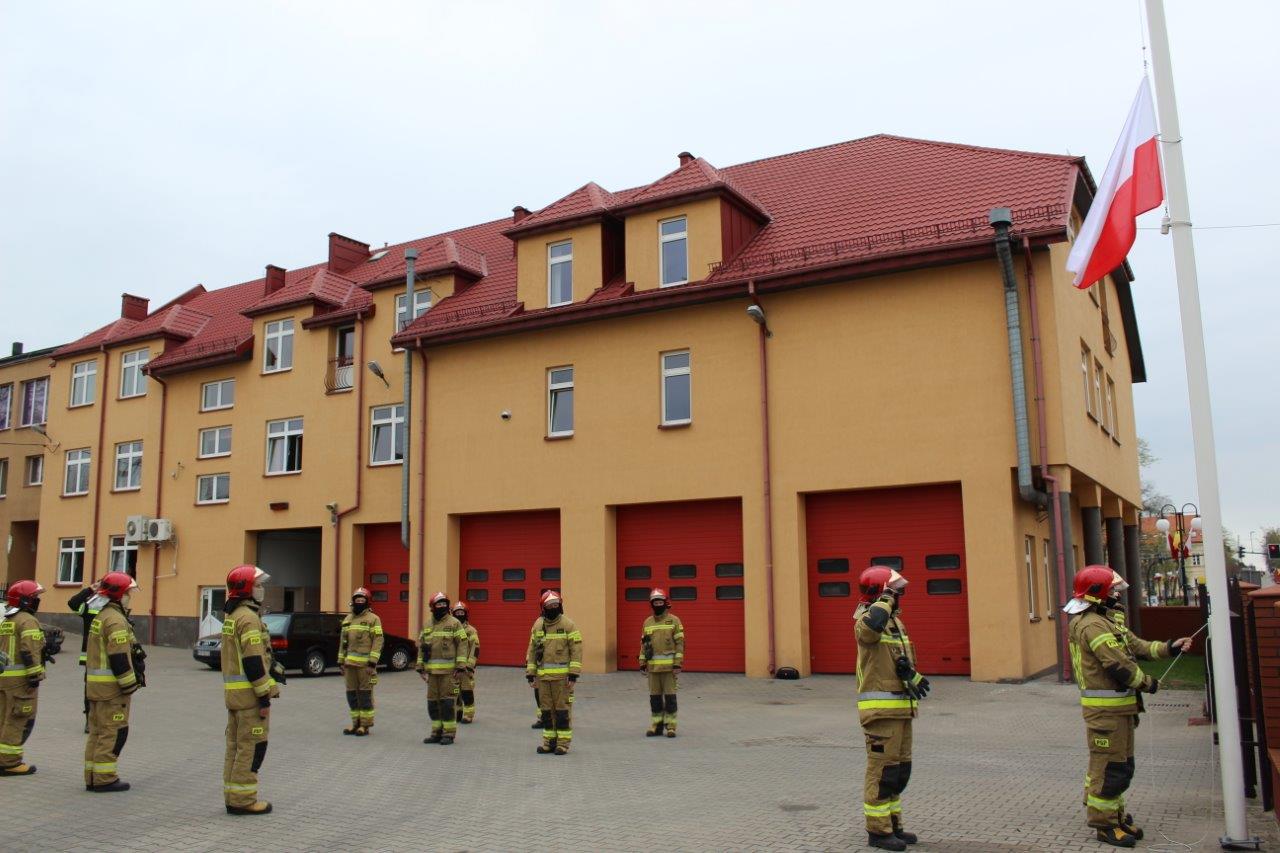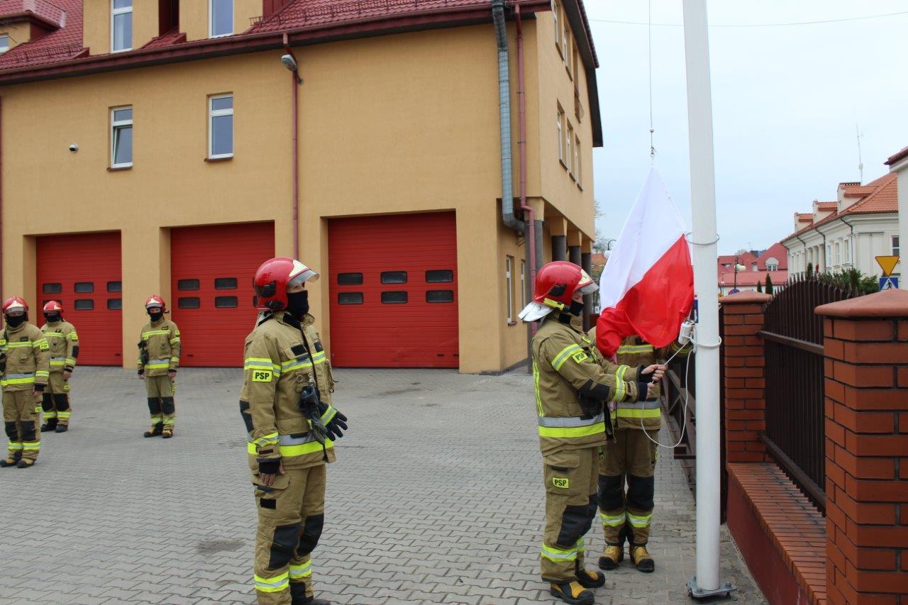 Strażacy Państwowej Straży Pożarnej uczcili w ten sposób Dzień Flagi Rzeczypospolitej Polskiej, wyrażając szacunek do symboli narodowych.