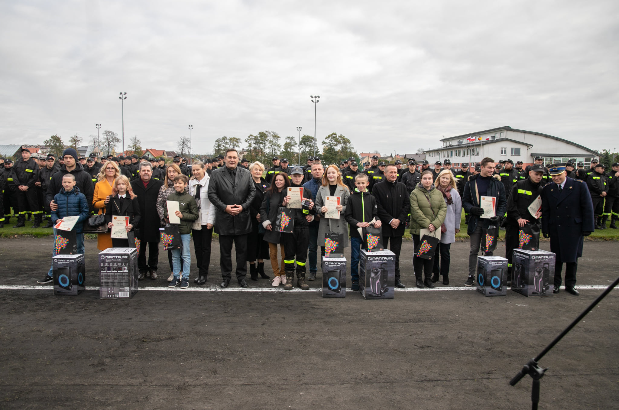 W trakcie uroczystości nastąpiło również wręczenie nagród zwycięzcom “Powiatowego Konkursu Wiedzy Pożarniczej” dla młodzieży szkół podstawowych i średnich, który przeprowadzono w dniu 15 października 2021 roku.