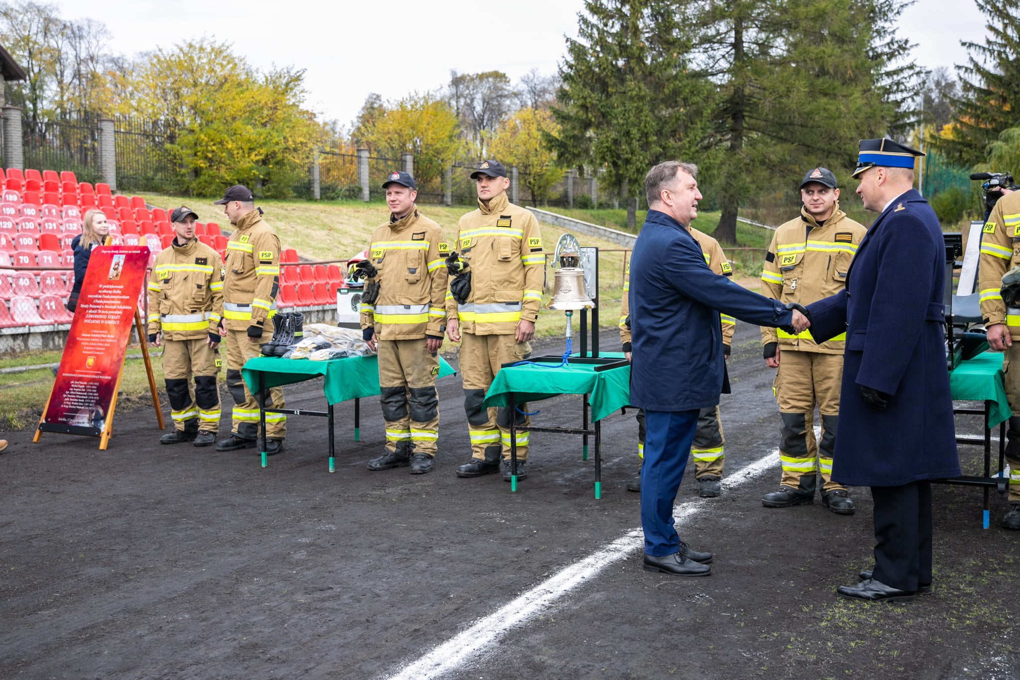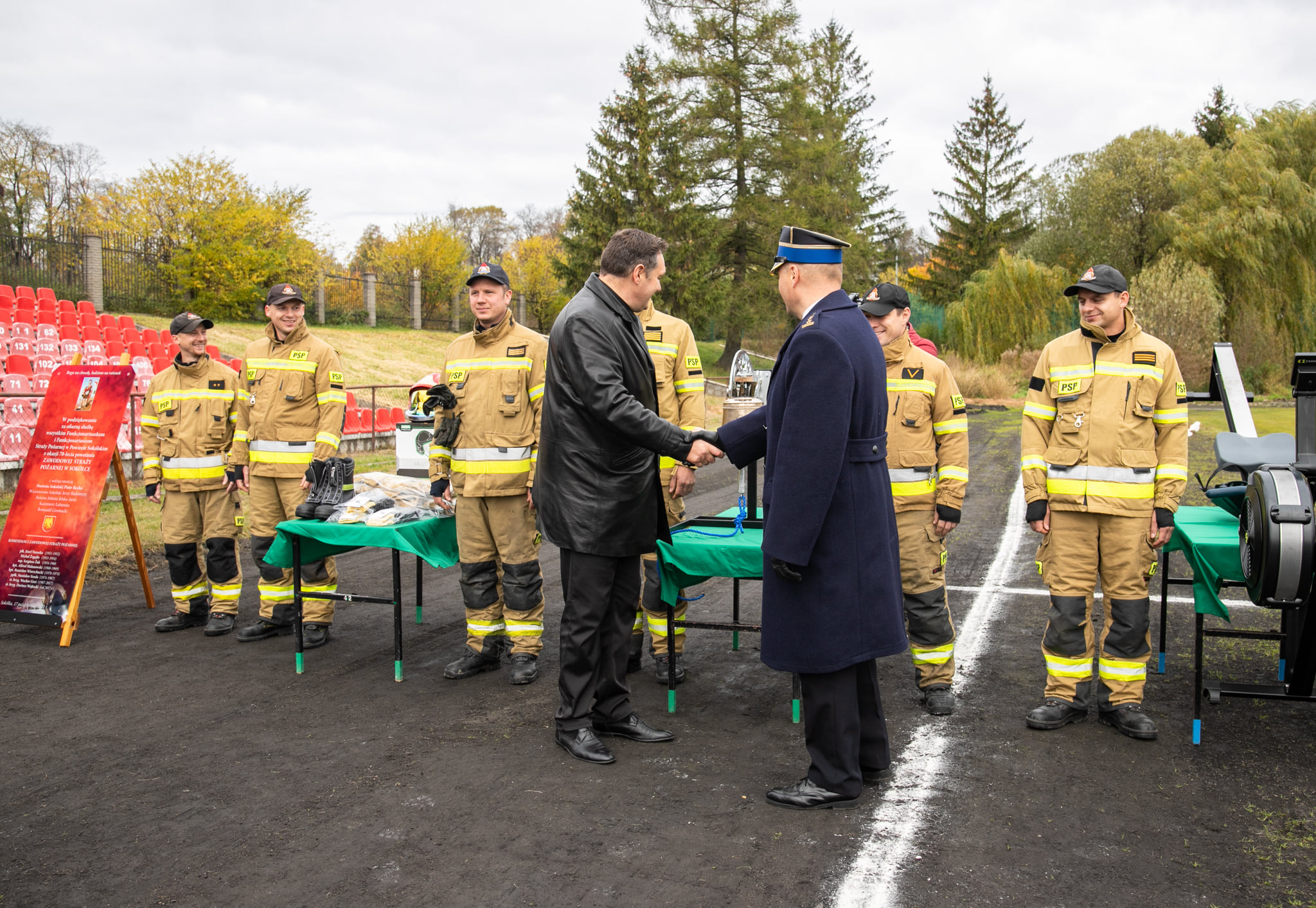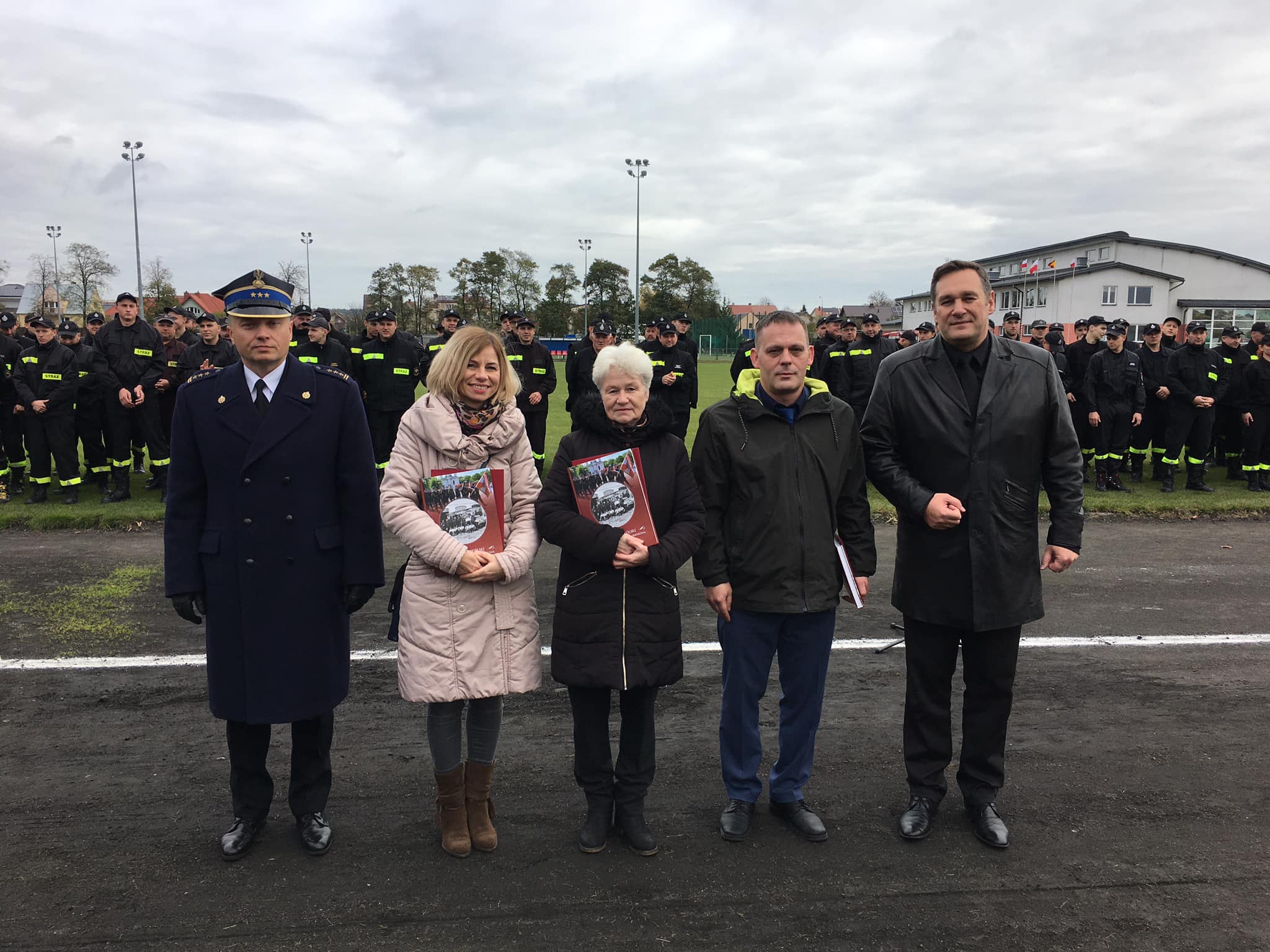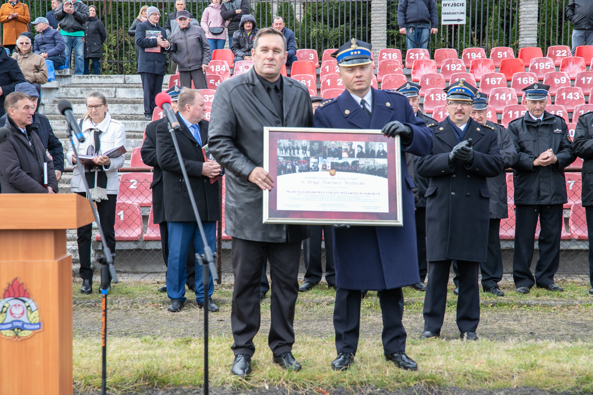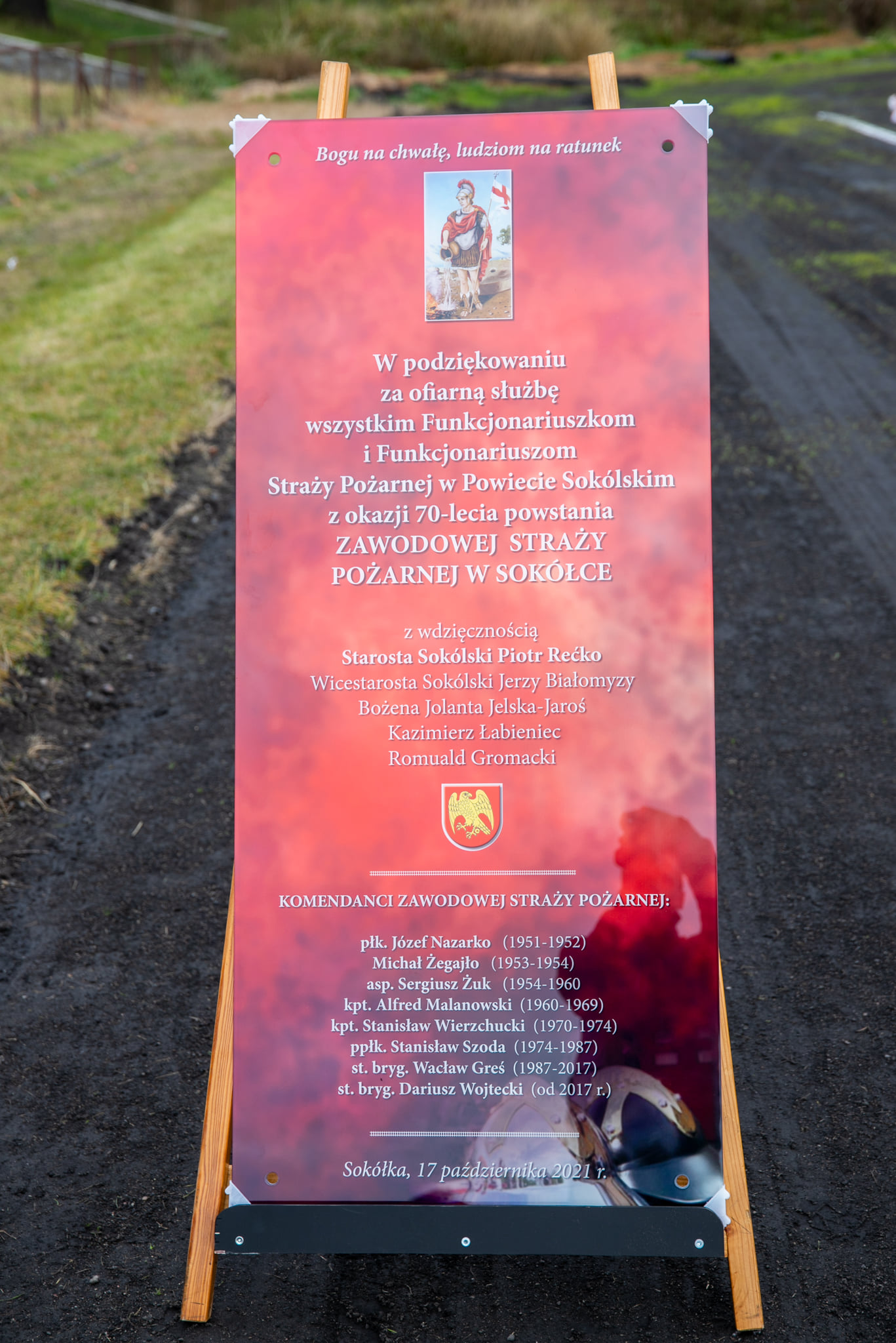 W dalszej części obchodów przekazano na ręce strażaków PSP z Jednostki Ratowniczo - Gaśniczej w Sokółce oraz Komendanta Powiatowego PSP w Sokółce pamiątkową tablicę oraz środki ochrony indywidualnej ufundowane przez Zarząd Powiatu Sokólskiego. Ich przekazania dokonał Piotr Rećko - Starosta Sokólski wraz z Jerzym Białomyzym - Wicestarostą Sokólskim oraz Bożeną Jelską-Jaroś i Romualdem Gromackim - Członkami Zarządu Powiatu Sokólskiego. Na tablicy wymienieni zostali wszyscy komendanci Zawodowej Straży Pożarnej w Sokółce - poprzez umieszczenie ich nazwisk na szklanej tablicy, Starosta Sokólski chciał uhonorować bohaterów i chronić pamięć o nich, a także podziękować wszystkim pokoleniom strażaków za ich ofiarną służbę. Starosta wręczył także na ręce Komendanta Powiatowego PSP pamiątkową grafikę, stworzoną ze współczesnych i archiwalnych zdjęć ZSP w Sokółce. Strażacy otrzymali również pamiątkowy dzwon ufundowany przez Jacka Kucharewicza - Prezesa firmy Metal-Fach w Sokółce, sprzęt sportowy od firmy BARTER S.A. w Białymstoku, a także pamiątkowe gadżety ufundowane przez Piotra Karola Bujwickiego – Prezesa Lokalnej Grupy Działania „SZLAK – TATARSKI” w Sokółce.