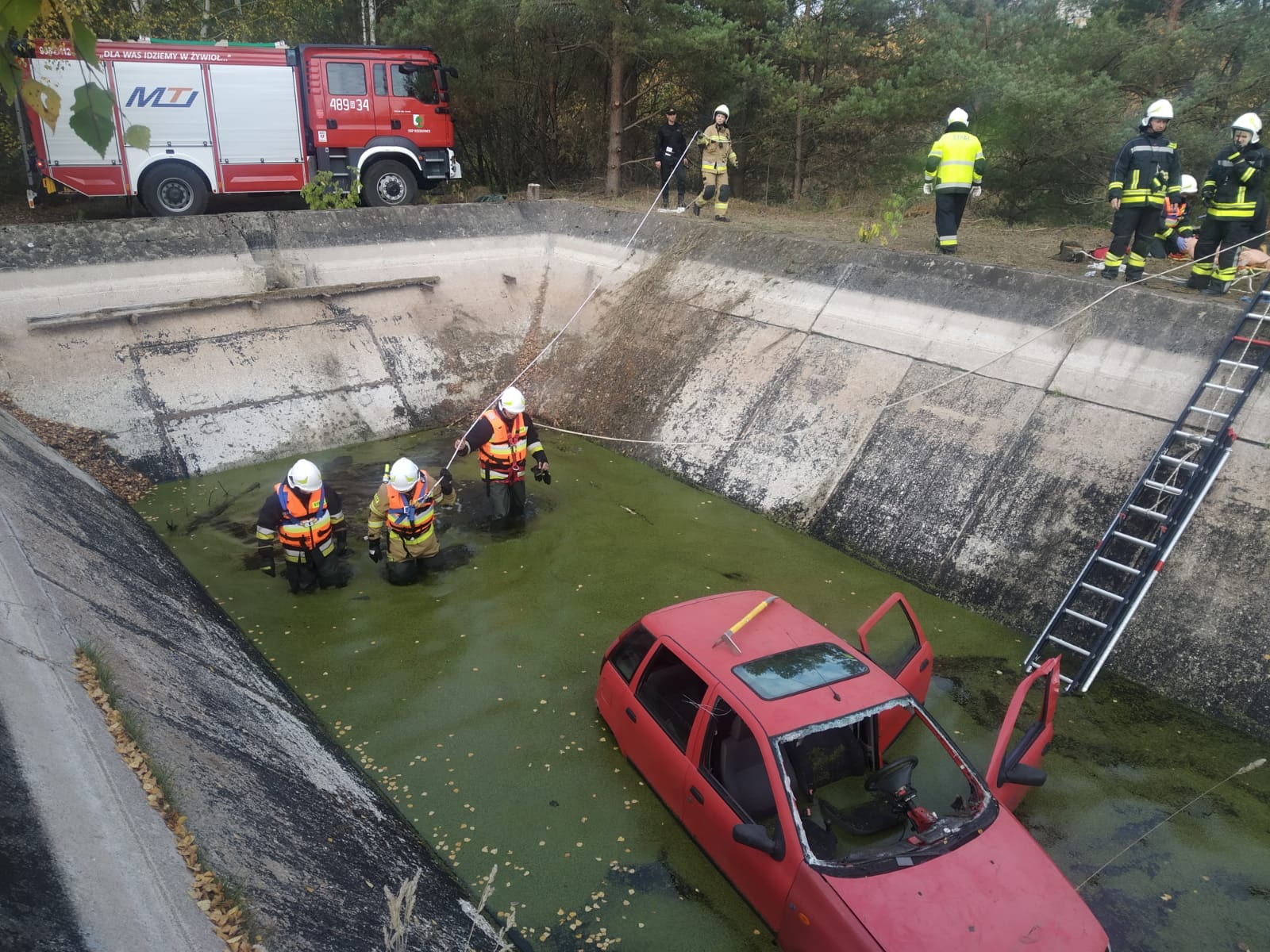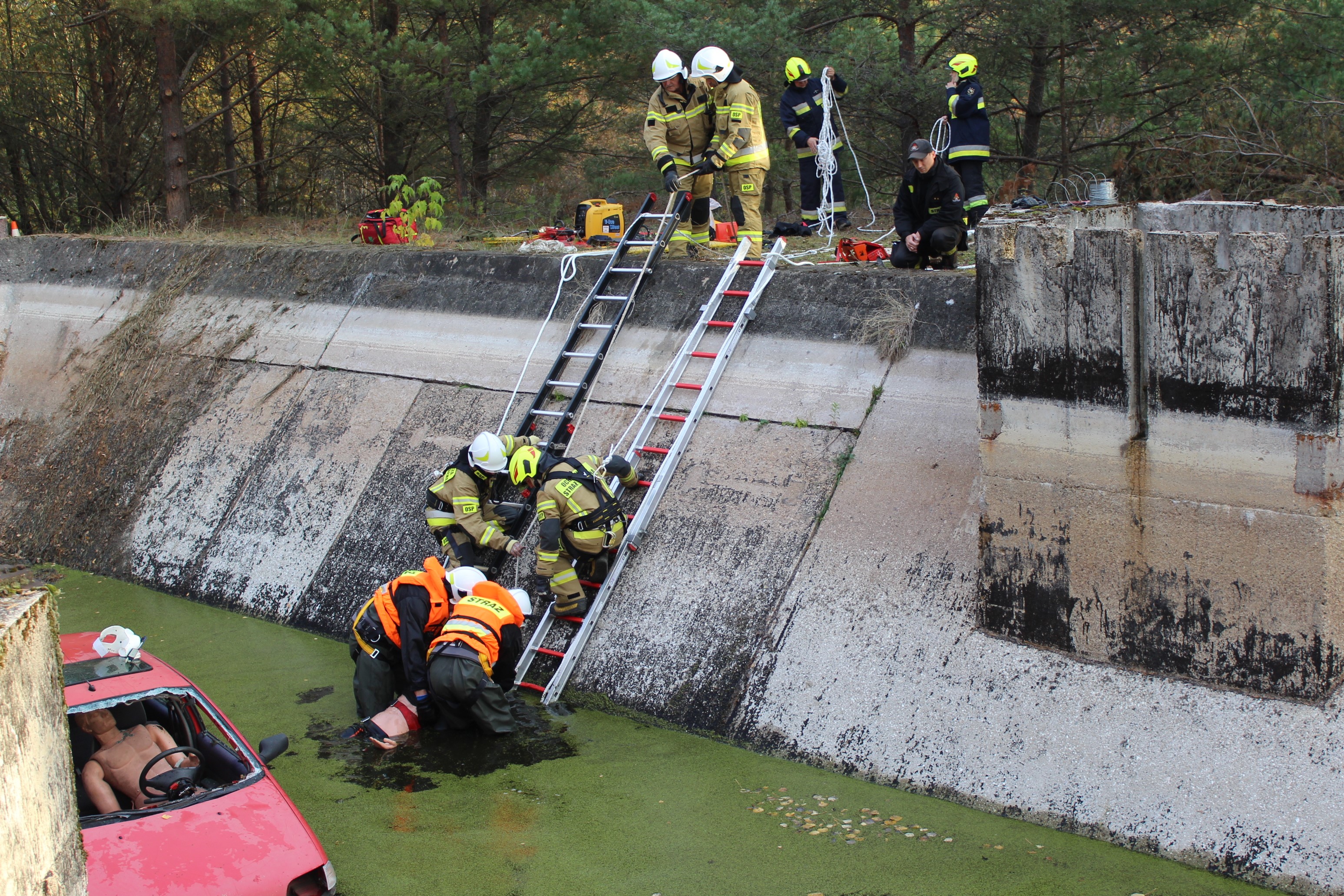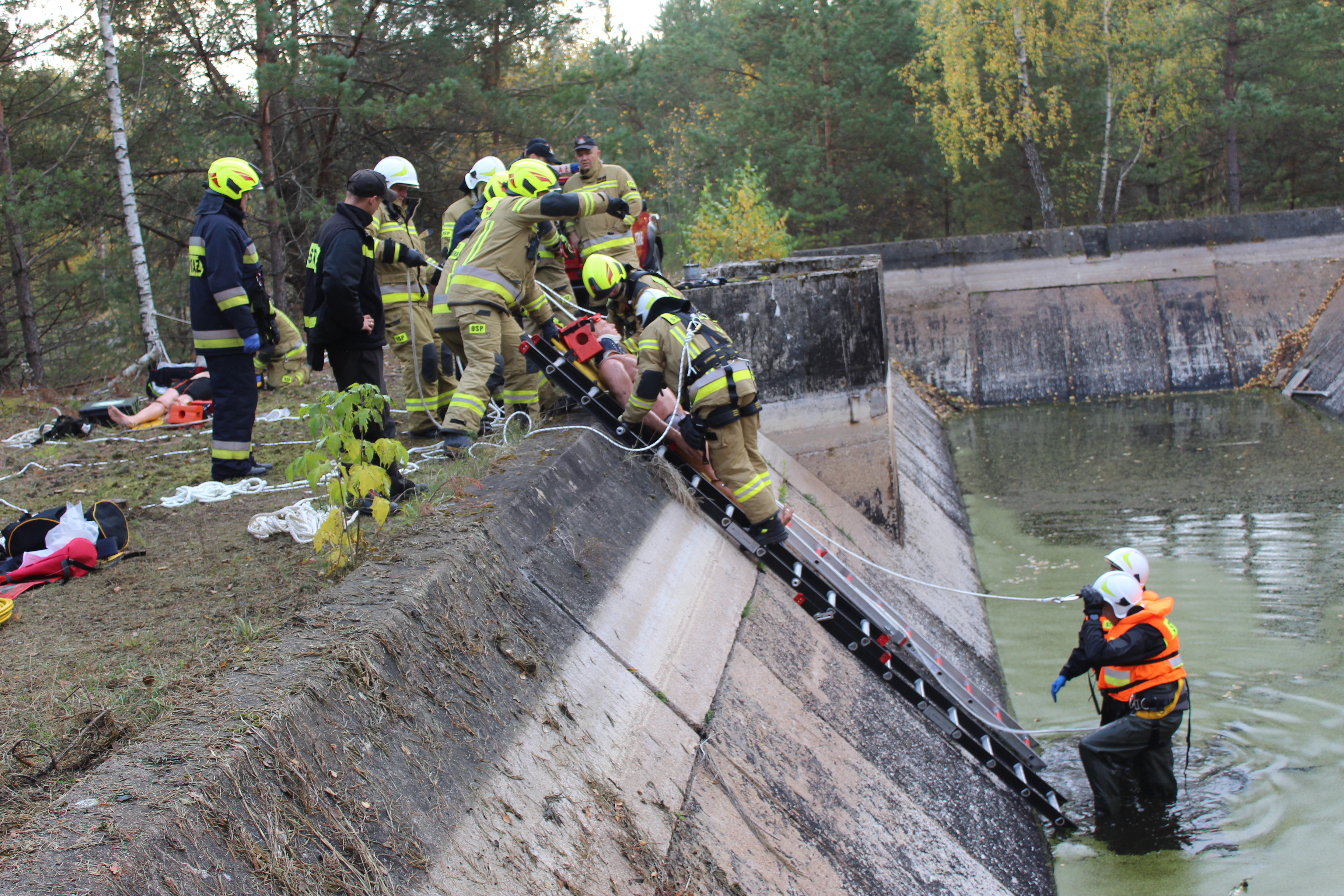 Pierwszy epizod pk. „ZBIORNIK” zakładał, że podczas przejażdżki offroadowej na terenie obszarów leśnych w pobliżu Sokółki – w wyniku nadmiernej prędkości oraz nieuwagi dochodzi do zderzenia pojazdu typu UTV ze znajdującą się tam konstrukcją betonowego zbiornika wodnego. W wyniku zdarzenia pojazd z impetem wpada do głębokiego basenu i stoi kołami na dnie. Głębokość wody wynosi około 0,5 metra. Wewnątrz pojazdu zostaje uwięziony kierowca – nie może opuścić kabiny z uwagi na zablokowane drzwi, zostaje poszkodowany w wyniku zdarzenia. Na miejscu zdarzenia znajduje się świadek (grzybiarz), który nie jest w stanie pomóc osobie poszkodowanej z uwagi na strome ściany zbiornika i brak możliwości zejścia do wody – powiadamia o zdarzeniu służby ratownicze. Nawiązuje również kontakt z półprzytomnym kierowcą i otrzymuje informację, że pojazdem podróżowała jeszcze jedna osoba – po zdarzeniu nie ma jej w kabinie. Z chwilą przybycia sił i środków JOP na miejsce zdarzenia - świadek wskazuje miejsce wpadnięcia pojazdu do wody, nie jest w stanie powiedzieć, gdzie znajduje się pasażer pojazdu. Zadaniem przybyłych na miejsce zdarzenia zespołów było bezpieczne dotarcie ratowników na dno zbiornika, dostarczenie tam niezbędnego sprzętu ratowniczego, wykonanie dostępu do poszkodowanego w pojeździe poprzez otwarcie drzwi za pomocą sprzętu specjalistycznego, przeszukanie okolic miejsca zdarzenia i dna zbiornika w celu lokalizacji zaginionego pasażera pojazdu, ewakuacja kierowcy z wnętrza pojazdu, a następnie poszkodowanych z dna zbiornika poza strefę zagrożenia po drabinach lub za pomocą technik wysokościowych z zabezpieczeniem poszkodowanych i ratowników przed upadkiem, a także udzielenie kwalifikowanej pierwszej pomocy medycznej.
