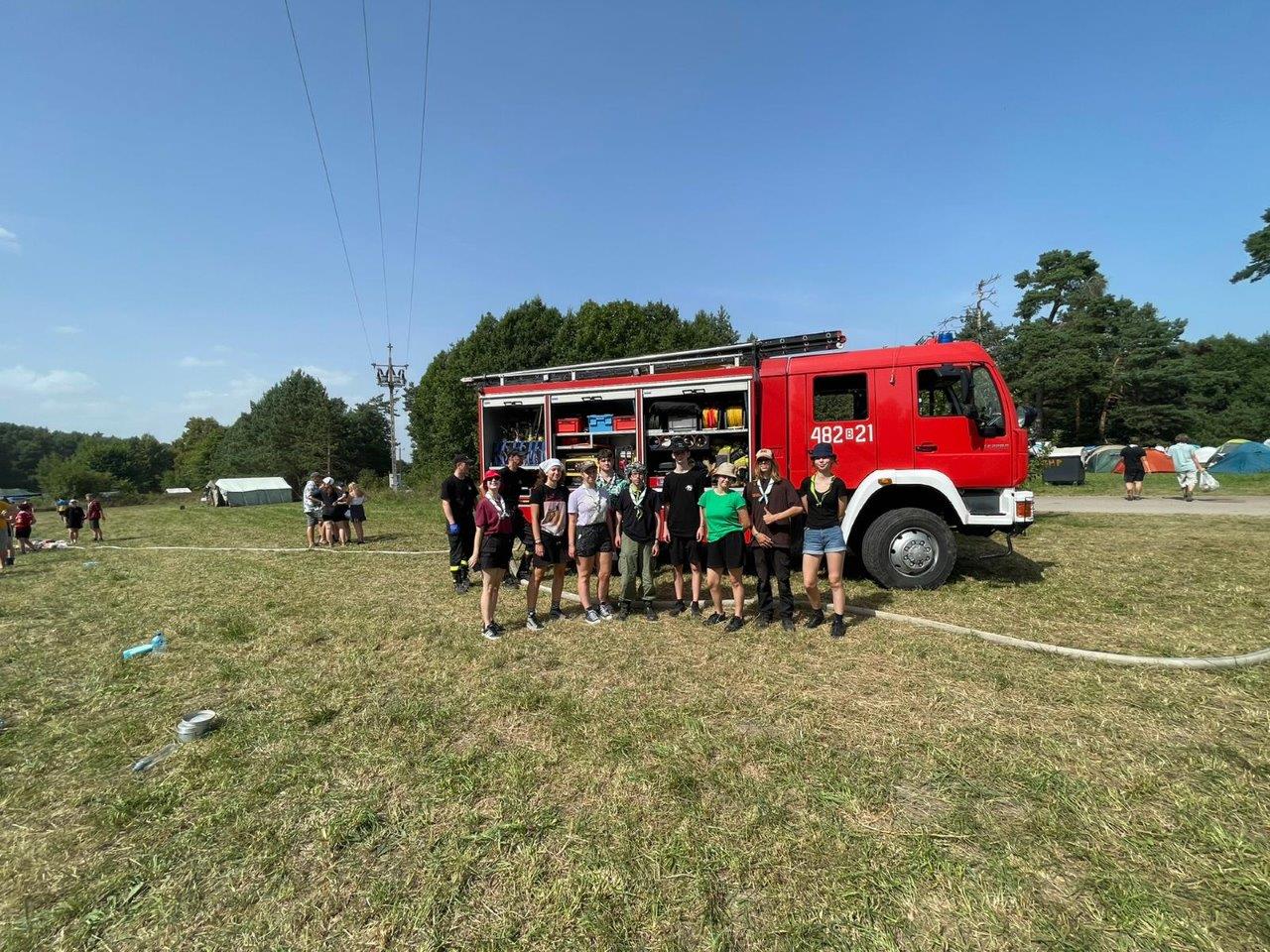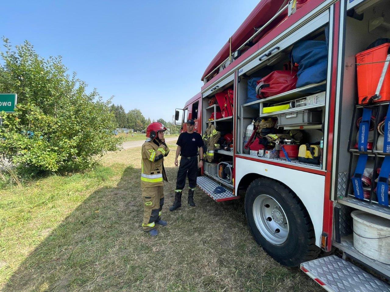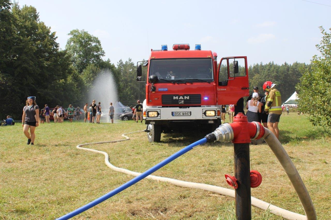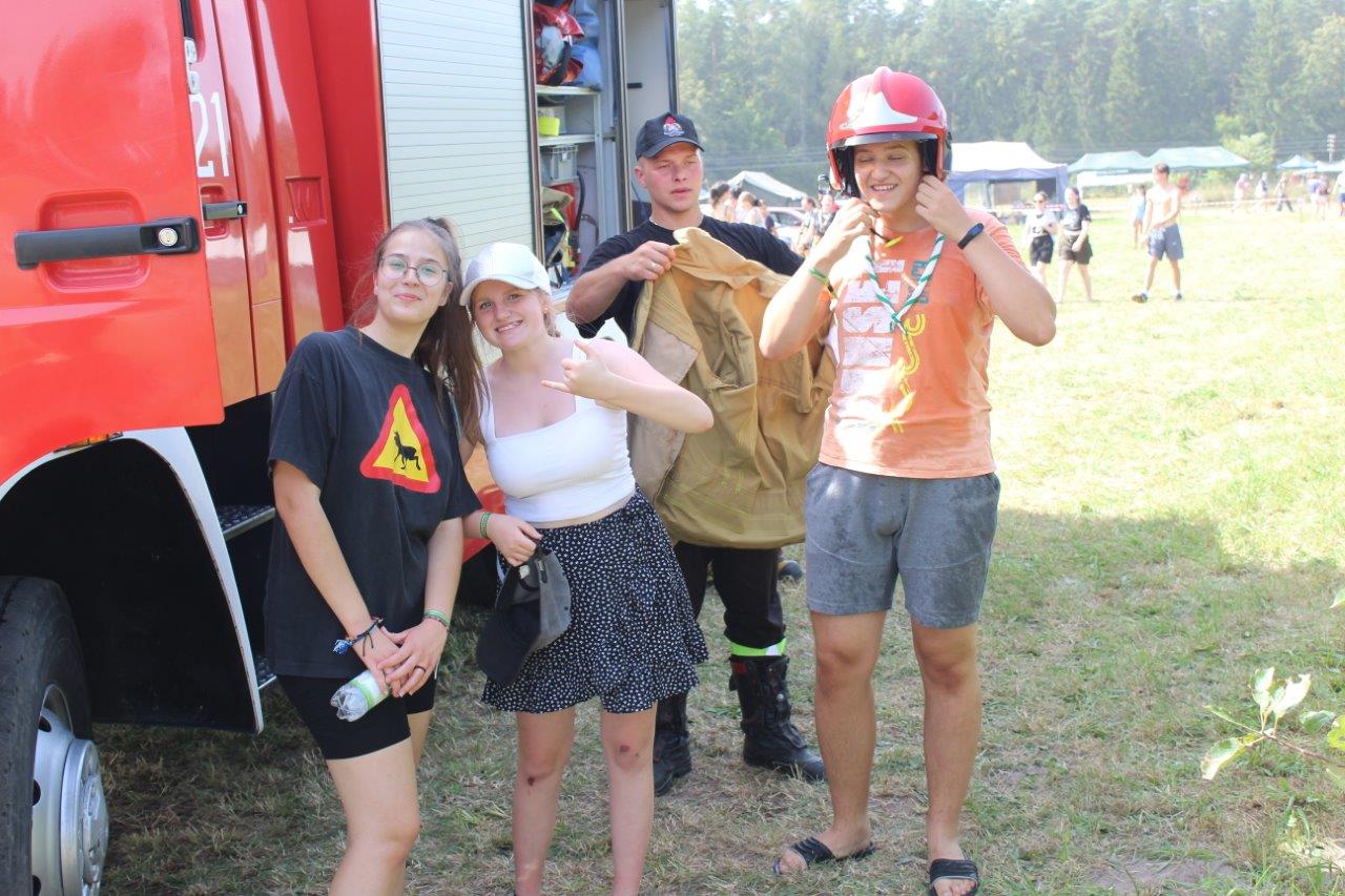 24 sierpnia 2022 r. strażacy Wydziału Operacyjnego i Przeciwdziałania Zagrożeniom Komendy Powiatowej PSP w Sokółce oraz Posterunku JRG Sokółka w Dąbrowie Białostockiej wraz z funkcjonariuszami Policji przeprowadzili wizytację obozu harcerskiego w Kamiennej Nowej.