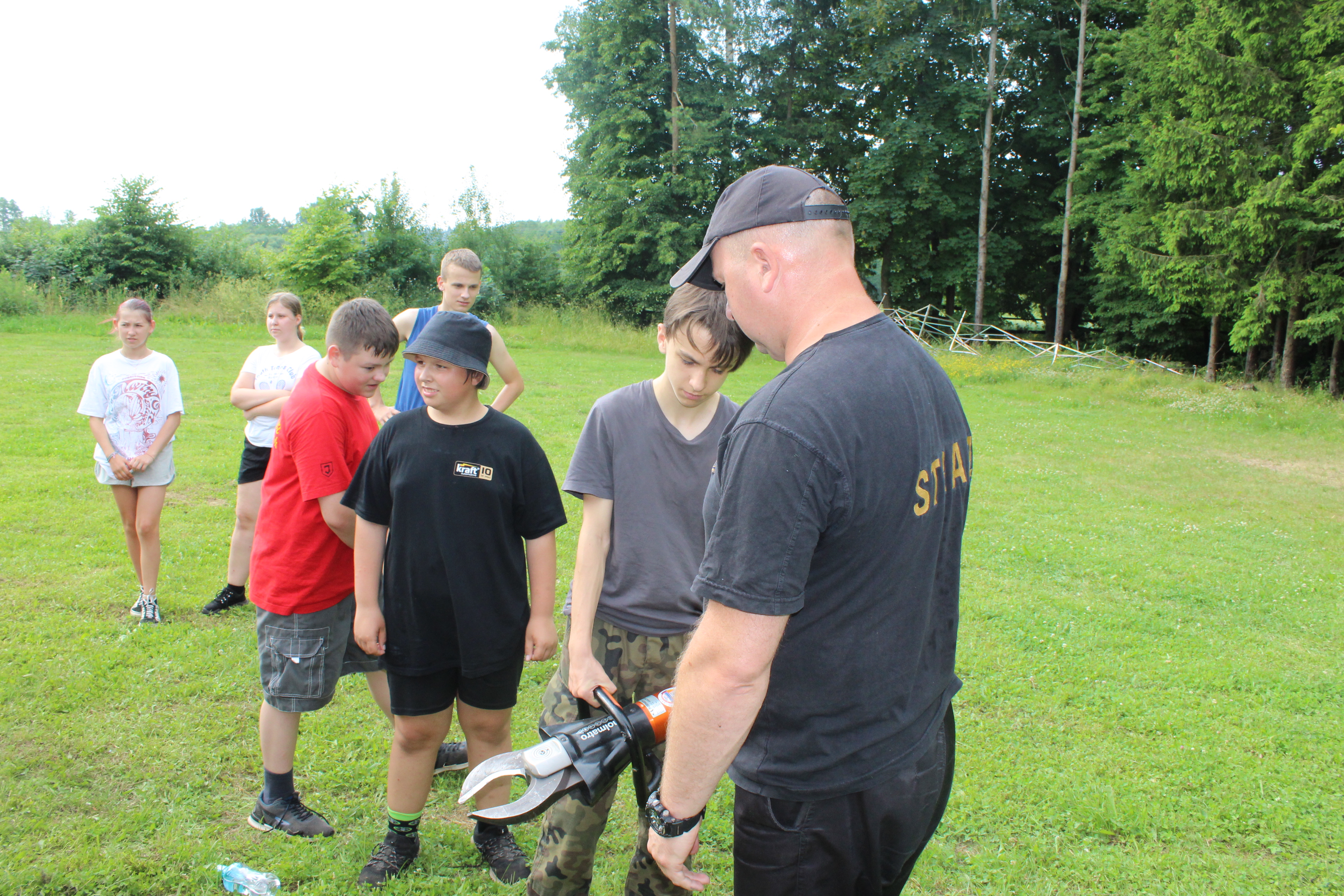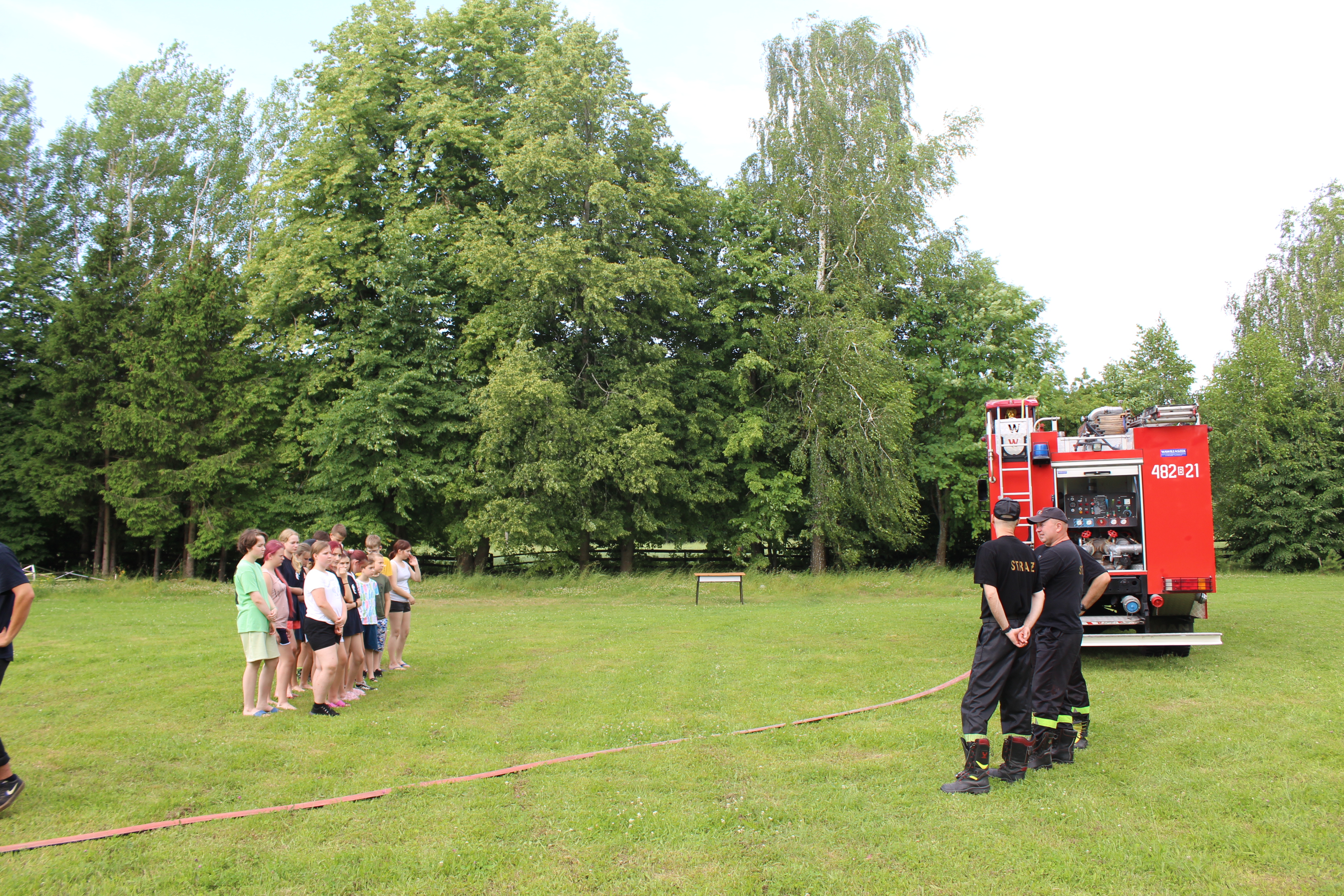 Realizując działania edukacyjne w ramach prewencji społecznej, strażacy PSP przeprowadzili również pogadankę dotyczącą zasad bezpieczeństwa podczas letniego wypoczynku nad wodą i w lesie, omówili zasady postępowania na wypadek powstania pożaru lub innego miejscowego zagrożenia na terenie obozu ze szczególnym uwzględnieniem niebezpiecznych zjawisk atmosferycznych, użycia podręcznego sprzętu gaśniczego i alarmowania służb przy wykorzystaniu numeru alarmowego 112. Zaprezentowano i omówiono również sprzęt znajdujący się na wyposażeniu wozu bojowego Posterunku JRG Sokółka w Dąbrowie Białostockiej.