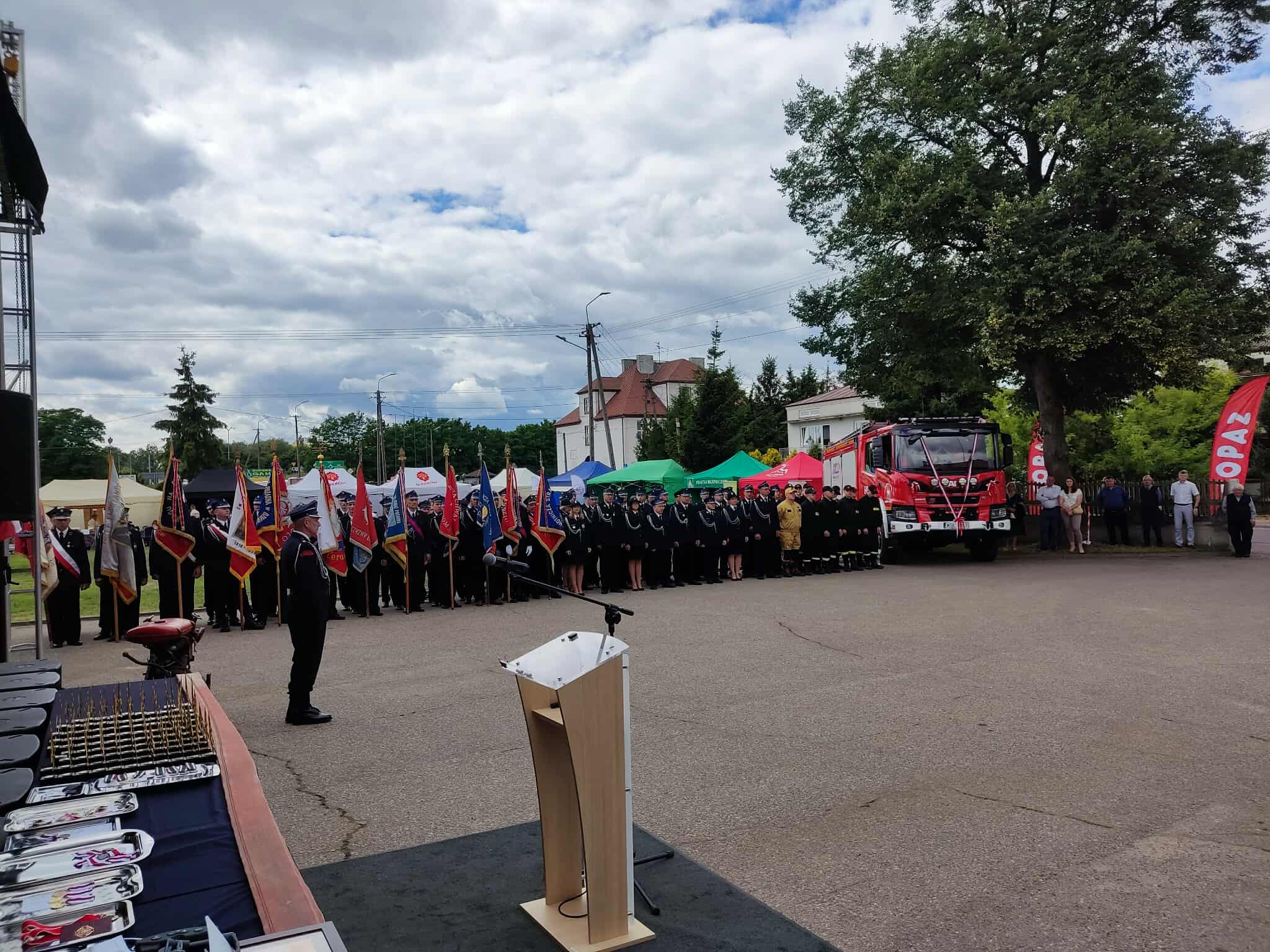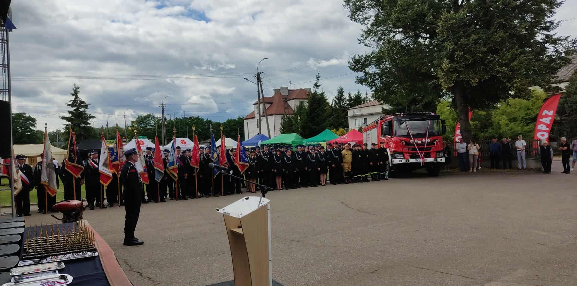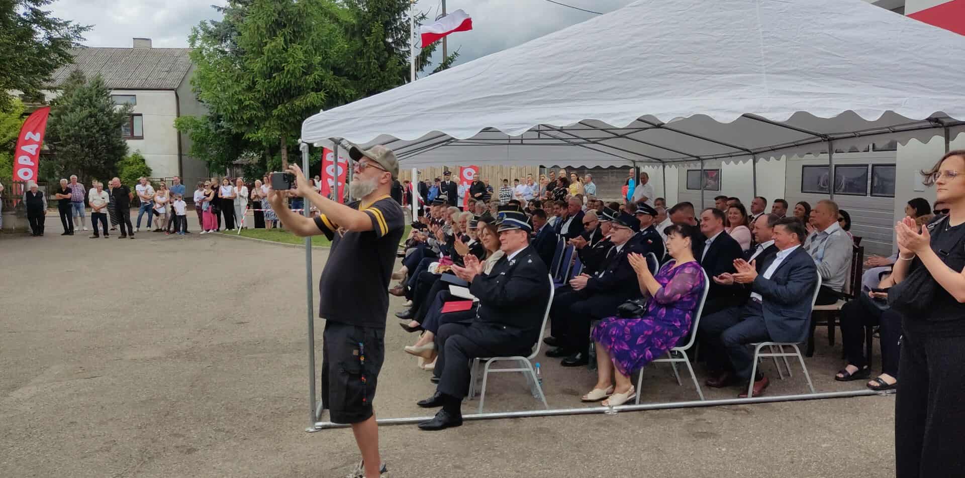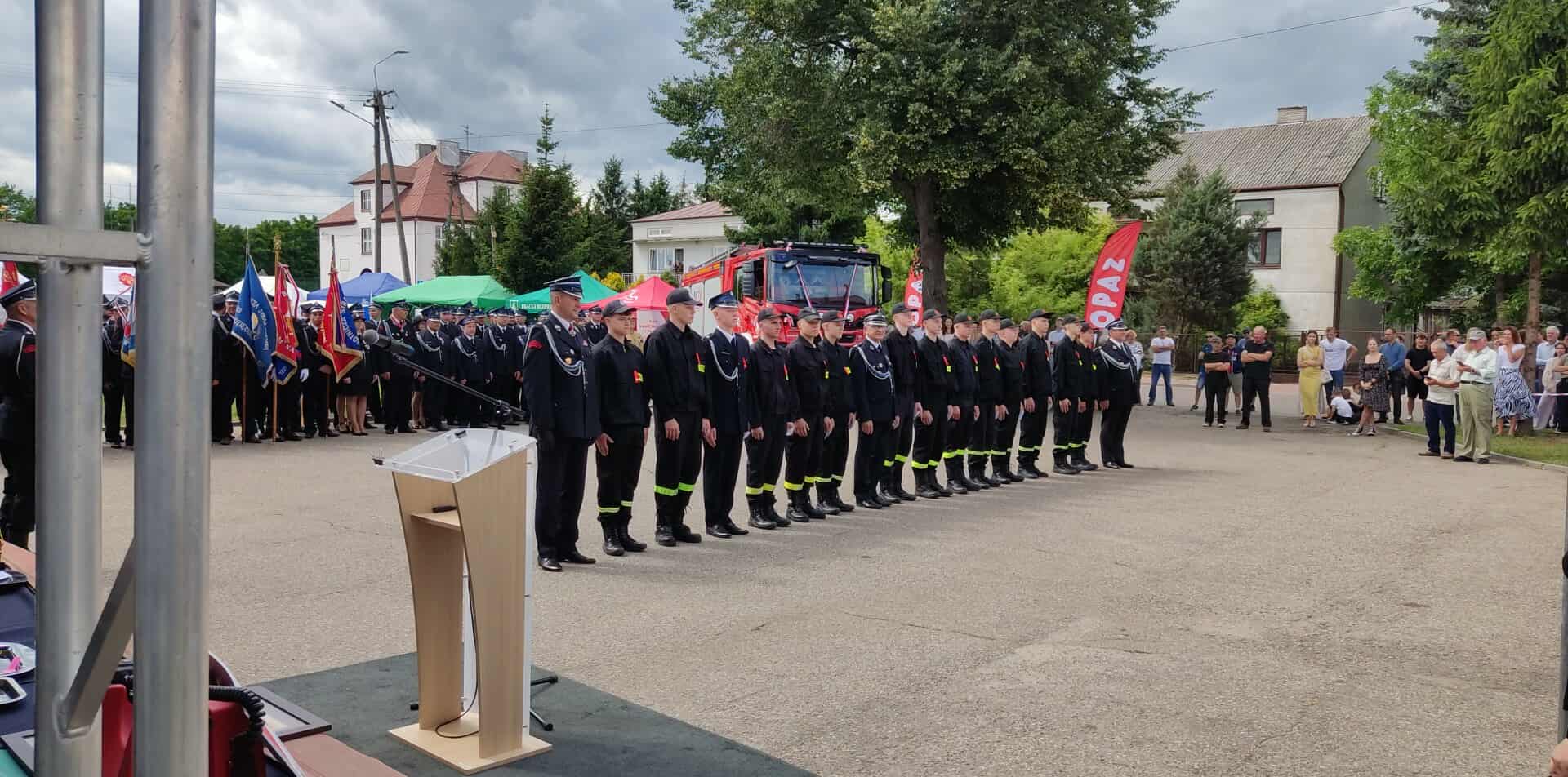Po Mszy Świętej na placu przed strażnicą rozpoczęła się oficjalna uroczystość pod dowództwem druha Krzysztofa Krakowiaka. Uroczystość uświetniła Orkiestra Dęta z Sokołowa Podlaskiego, której występ nadał wydarzeniu wyjątkowy, podniosły charakter. W wydarzeniu uczestniczyły liczne poczty sztandarowe jednostek OSP z terenu gminy i okolic. Podczas uroczystości przedstawiono rys historyczny jednostki oraz wręczono liczne odznaczenia i wyróżnienia dla druhen i druhów OSP.