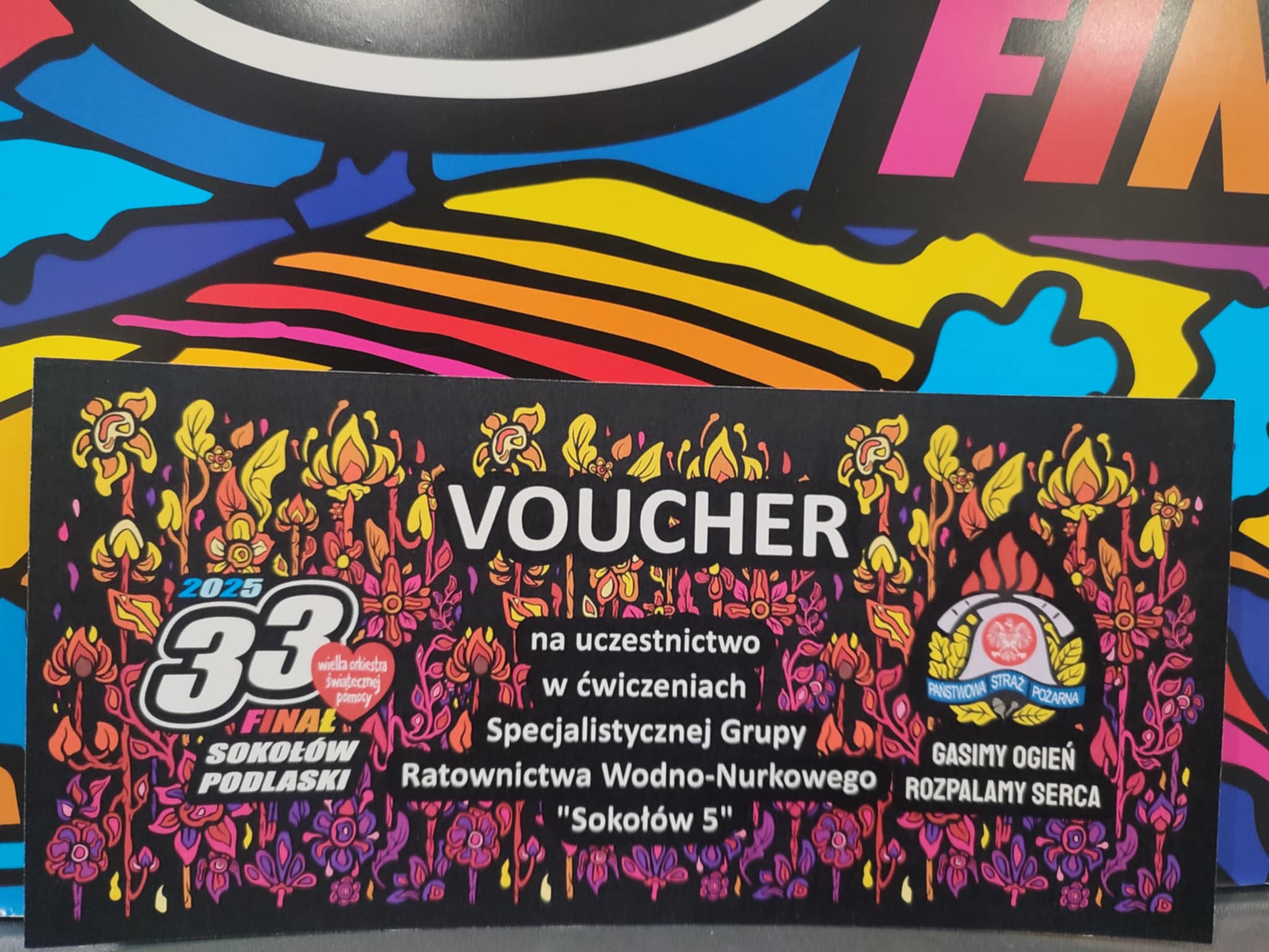 - drugi na uczestnictwo w ćwiczeniach Specjalistycznej Grupy Ratownictwa Wodno-Nurkowego „Sokołów 5”. Zwycięzca licytacji zapozna się z funkcjonowanie grupy, sprzętem oraz weźmie udział w ćwiczeniach jako obserwator. Będzie miał również możliwość przepłynąć sprzętem pływającym (łódką lub pontonem) oraz ubrać się i przepłynąć się w sprzęcie nurka po akwenie wodnym.