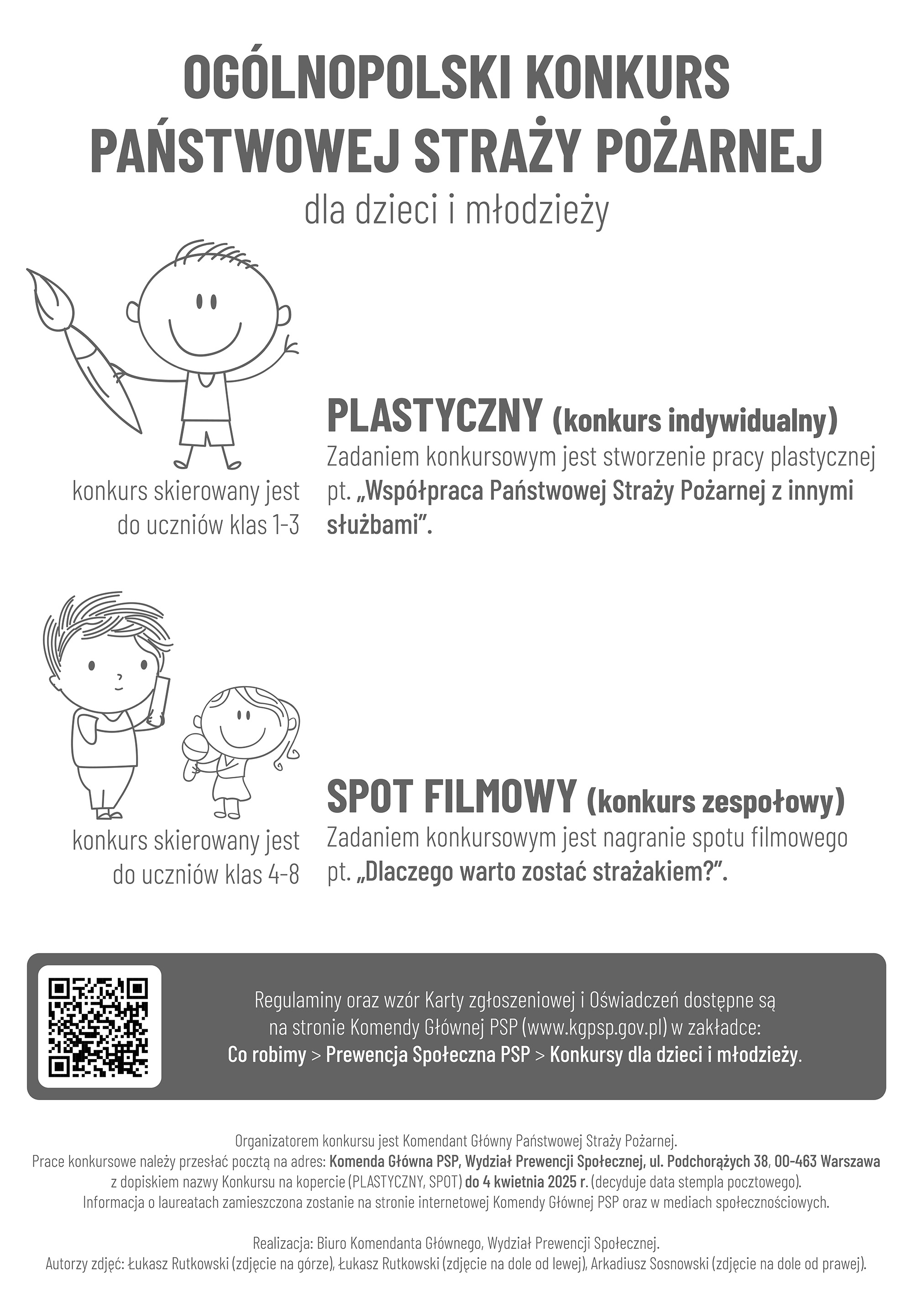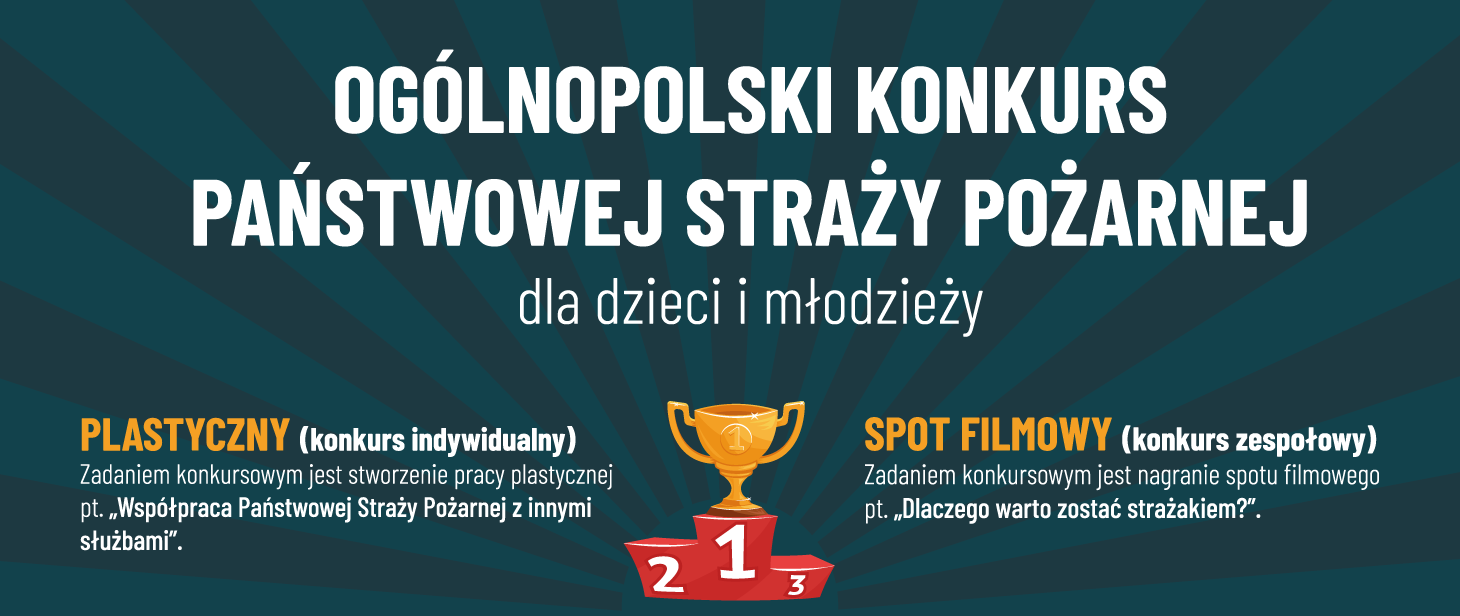 - Pierwszy z nich, to konkurs PLASTYCZNY (indywidualny). Tematem prac jest „Współpraca Państwowej Straży Pożarnej z innymi służbami”. Konkurs skierowany został do uczniów klas 1-3.