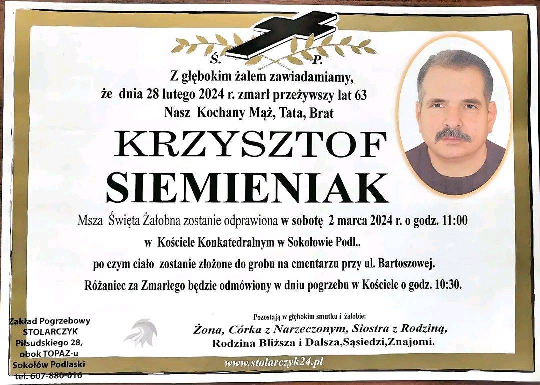 Z głębokim żalem zawiadamiamy, że w dniu 28 lutego 2024 r. zmarł st. asp. w st. spocz. Krzysztof Siemieniak, były strażak Komendy Powiatowej Państwowej Straży Pożarnej w Sokołowie Podlaskim.