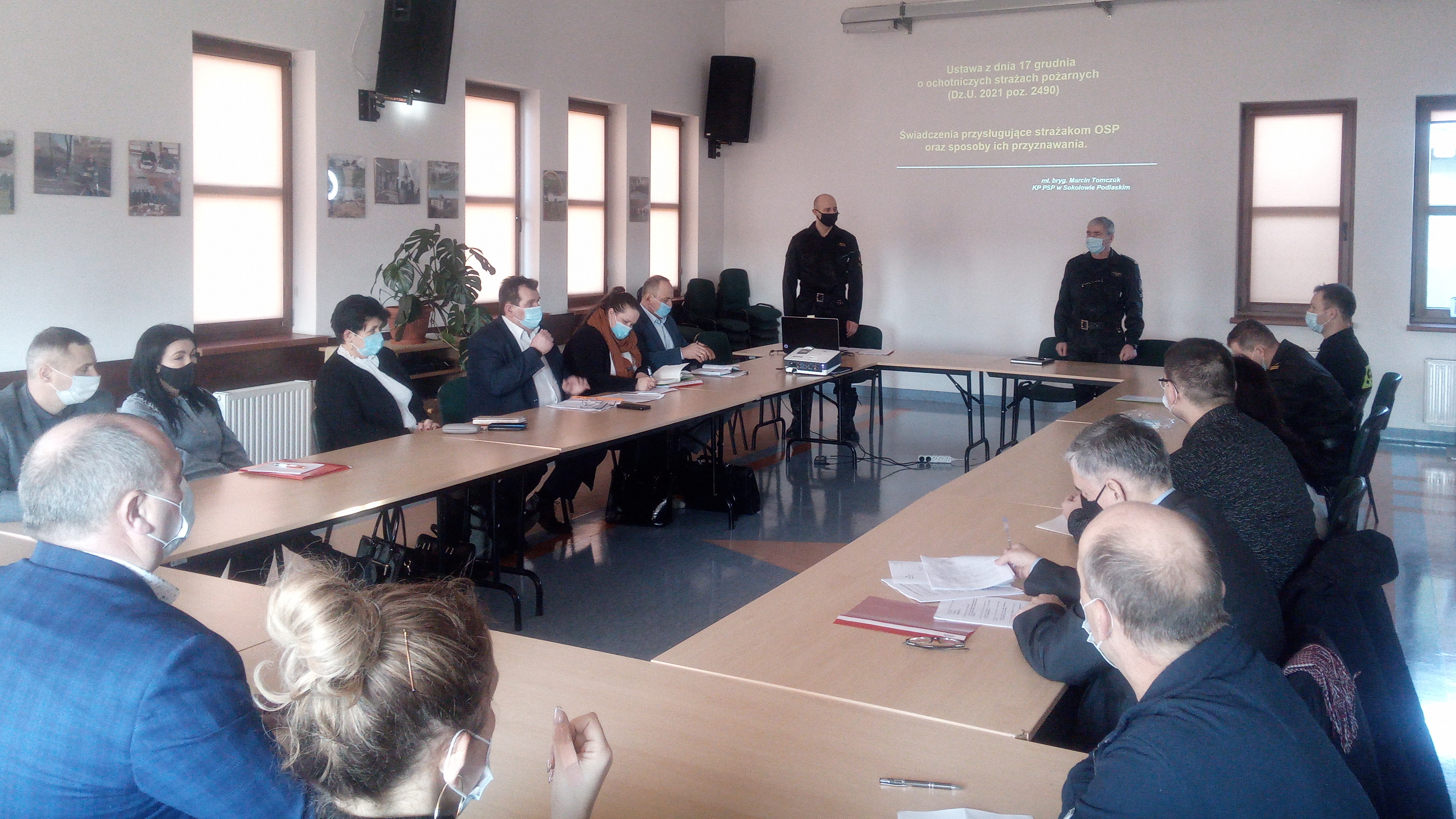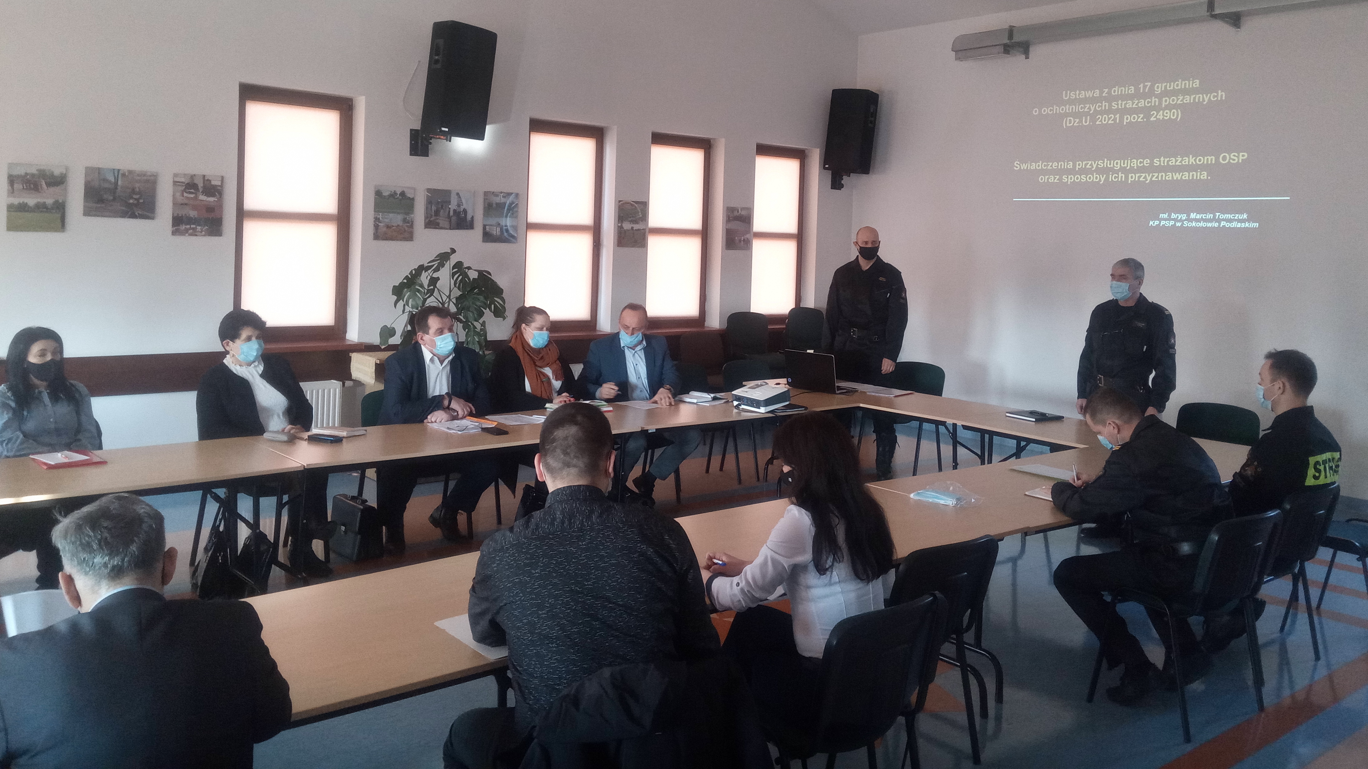 W dniu 15 lutego 2022 r. w Komendzie Powiatowej Państwowej Straży Pożarnej w Sokołowie Podlaskim miało miejsce spotkanie z wójtami/burmistrzami gmin powiatu sokołowskiego oraz pracownikami urzędów miast/gmin odpowiedzialnych za ochronę przeciwpożarową.