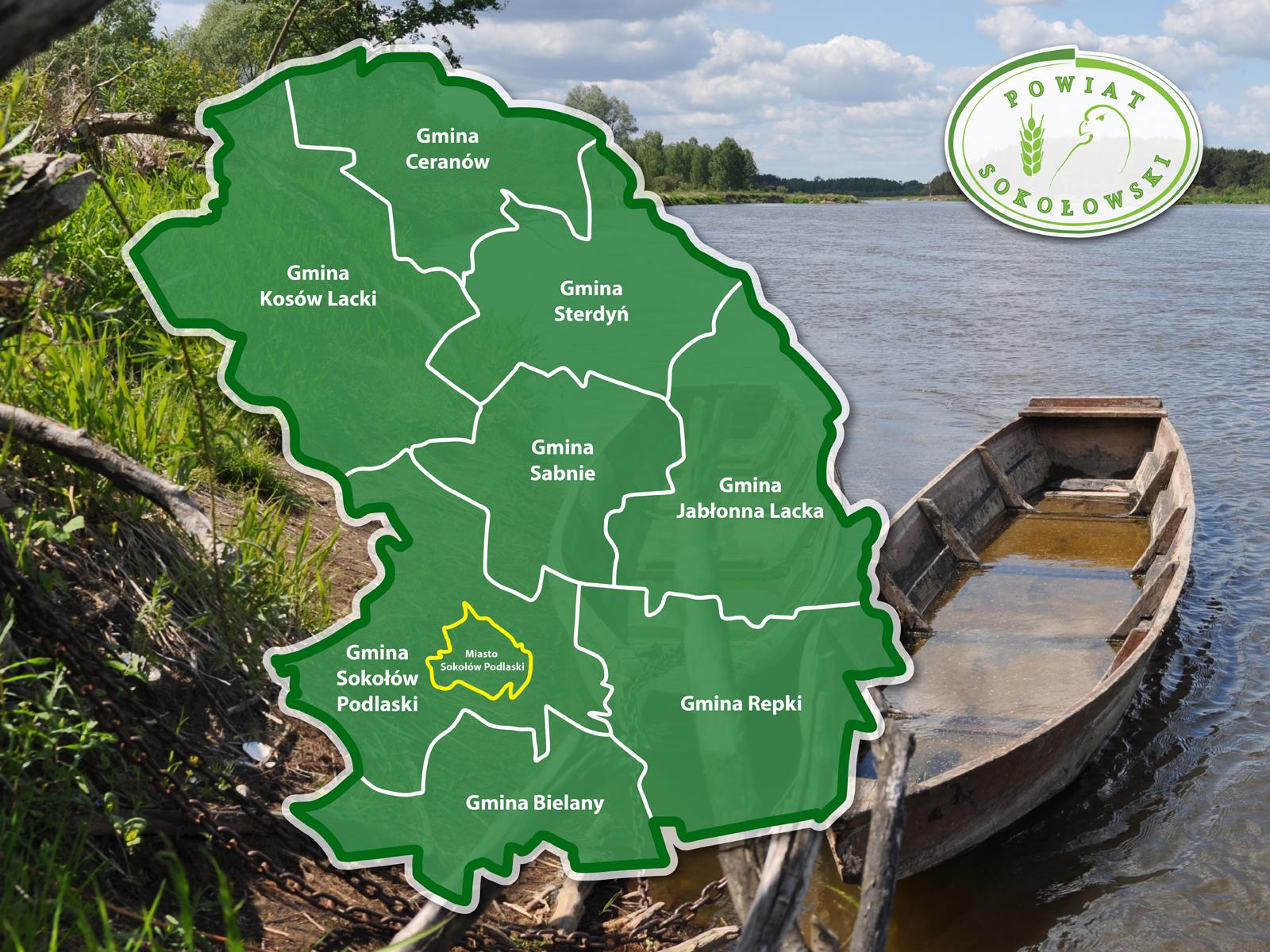 Od północy graniczy z powiatem ostrowskim, od zachodu z powiatem węgrowskim, od strony południowej z powiatem siedleckim, natomiast od strony wschodniej sąsiaduje z dwoma powiatami, które stanowią część województwa podlaskiego – wysokomazowieckim i siemiatyckim. Warto wspomnieć, iż granica północna i wschodnia wyznaczone są naturalnie, na przeszło 60-kilometrowym odcinku rzeki Bug. Pod względem struktury administracyjnej, powiat sokołowski podzielony jest na 9 gmin – 1 miejska (Sokołów Podlaski), 1 miejsko-wiejska (Kosów Lacki) oraz 7 wiejskich (Bielany, Ceranów, Jabłonna Lacka, Repki, Sabnie, Sokołów Podlaski oraz Sterdyń), które podzielone są łącznie na 233 sołectwa. Powiat sokołowski ma charakter rolniczy - 70 % ogólnej powierzchni zajmują użytki rolne, z czego 53 % stanowią grunty orne, 16 % łąki i pastwiska oraz 1% sady. Lasy w powiecie sokołowskim zajmują ponad 22%, zaś wody 1% ogólnej powierzchni.
