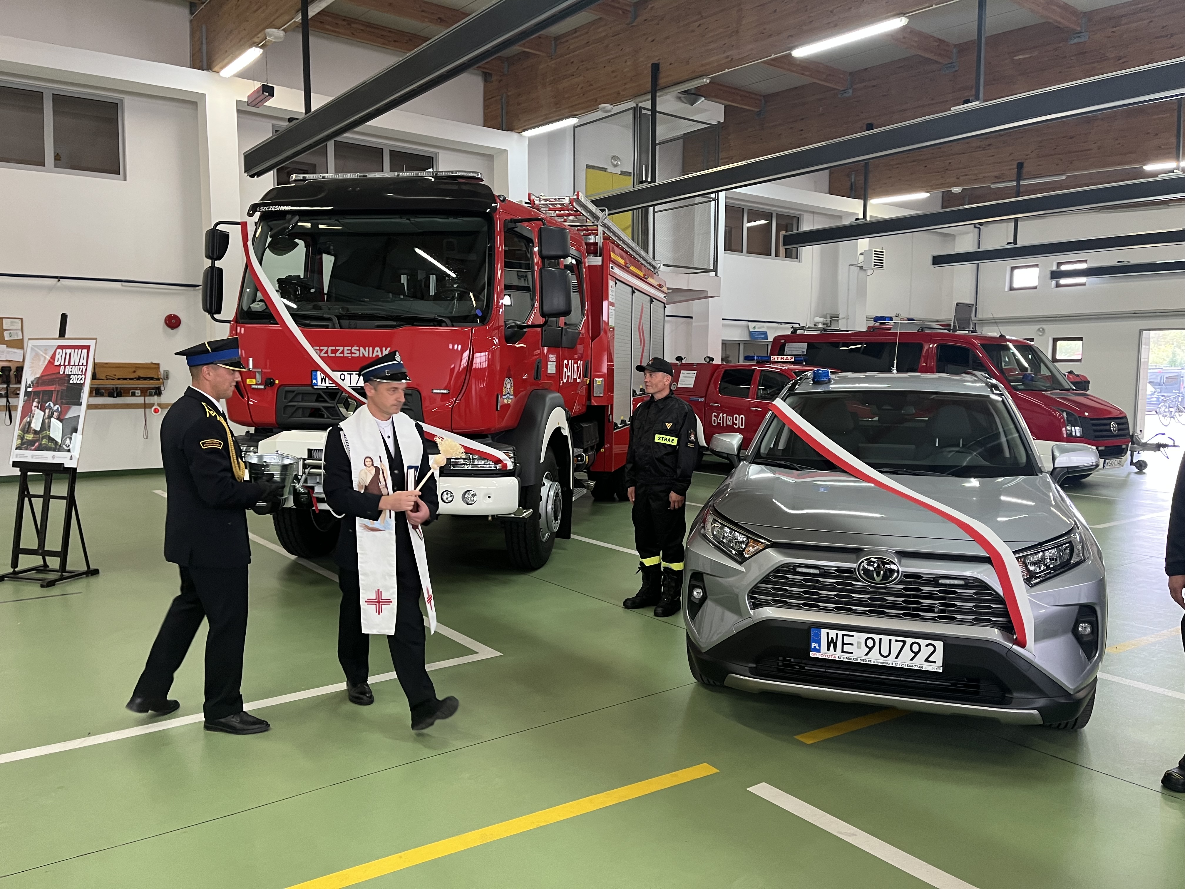 Dopełnieniem uroczystości było poświęcenie nowo przekazanych pojazdów z wyposażeniem oraz sprzętu przez ks. Jakuba Buczyńskiego – Proboszcza Parafii Św. Jana Chrzciciela w Czerwonce.