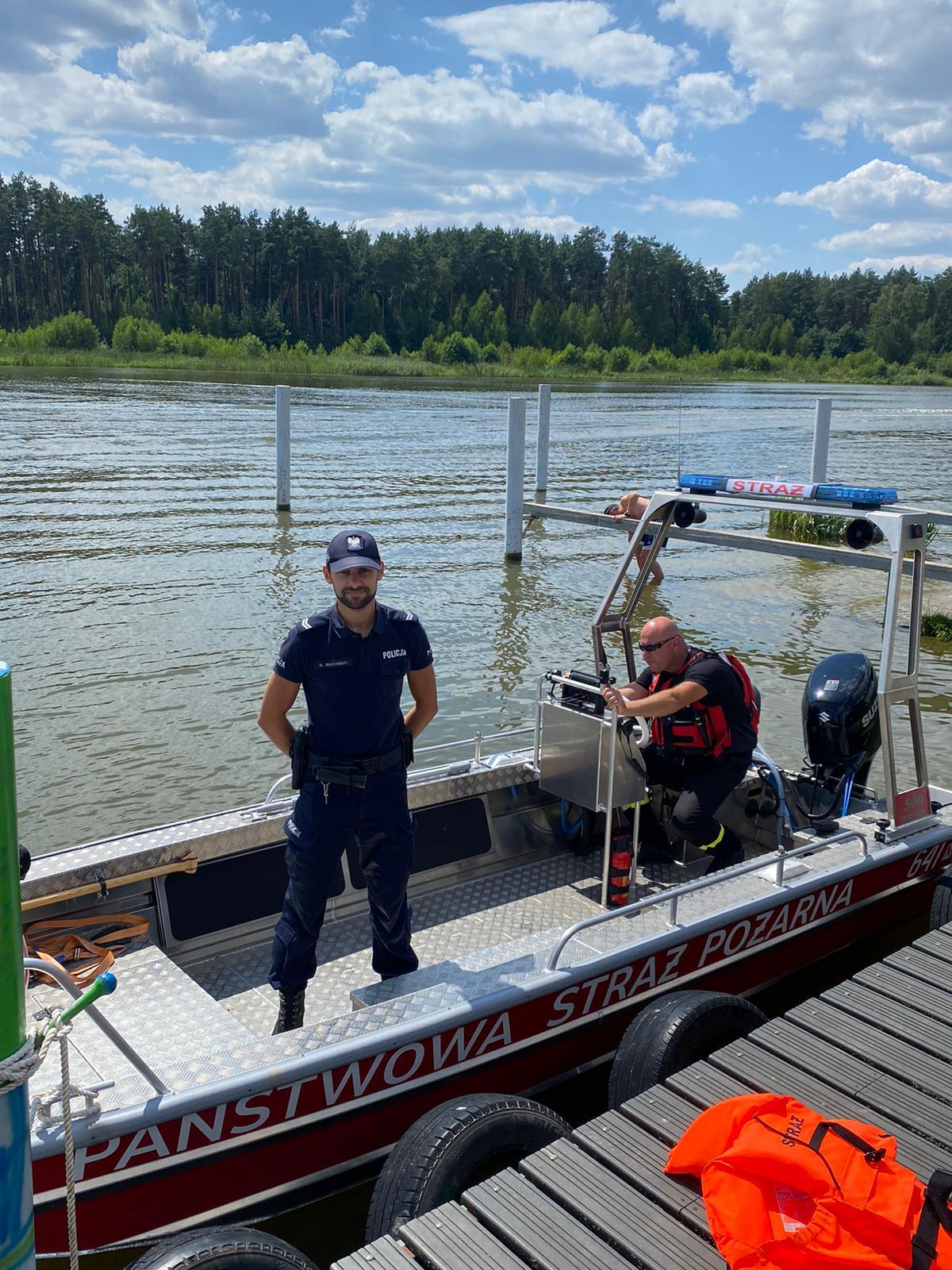 Policjanci i strażacy pojawiają się w rejonach zbiorników wodnych, by wspólnie dbać o bezpieczeństwo osób wypoczywających nad wodą.