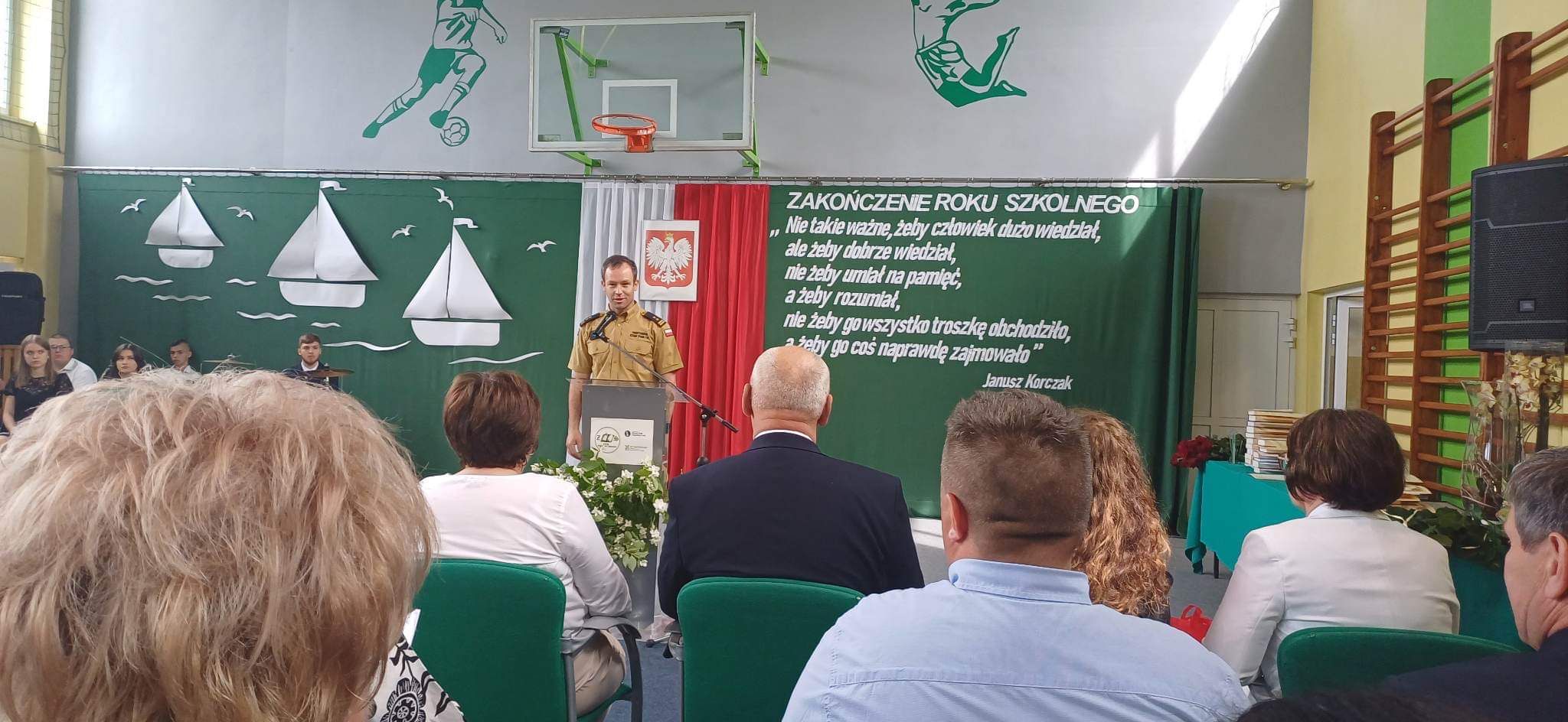 W piątek 23 czerwca br. odbyło się zakończenie roku szkolnego 2022/2023 w Zespole Szkół Centrum Kształcenia Rolniczego im. Władysława Stanisława Reymonta w Sokołowie Podlaskim. Podczas uroczystości swoją obecnością zaszczycili przedstawiciele instytucji i firm, współpracujących ze szkolą. Tutejszą komendę reprezentował bryg. Grzegorz Kuc. W swoim wystąpieniu podziękował za dotychczasową współpracę oraz przekazał informację o akcji "Bezpieczne Wakacje 2023".