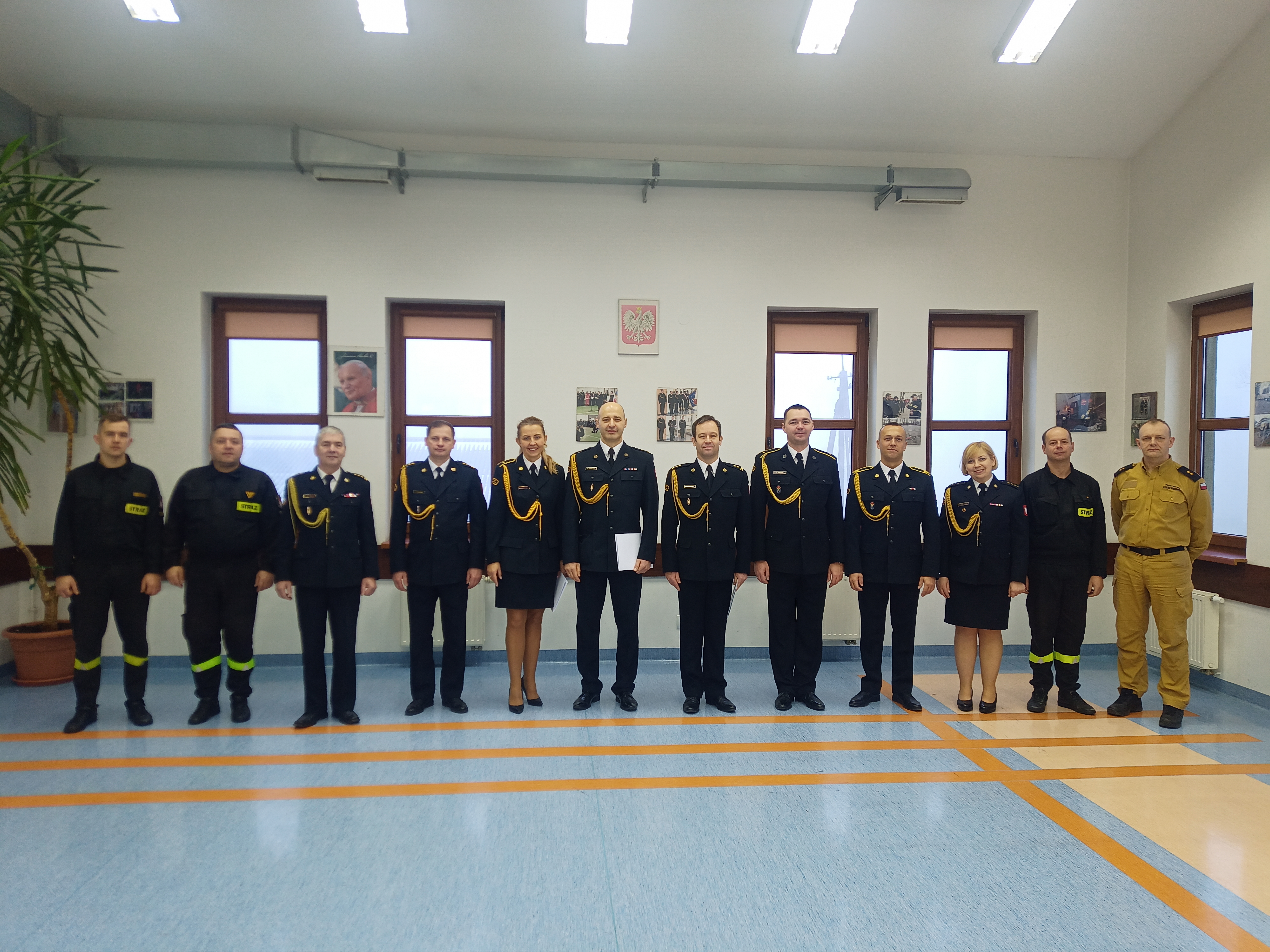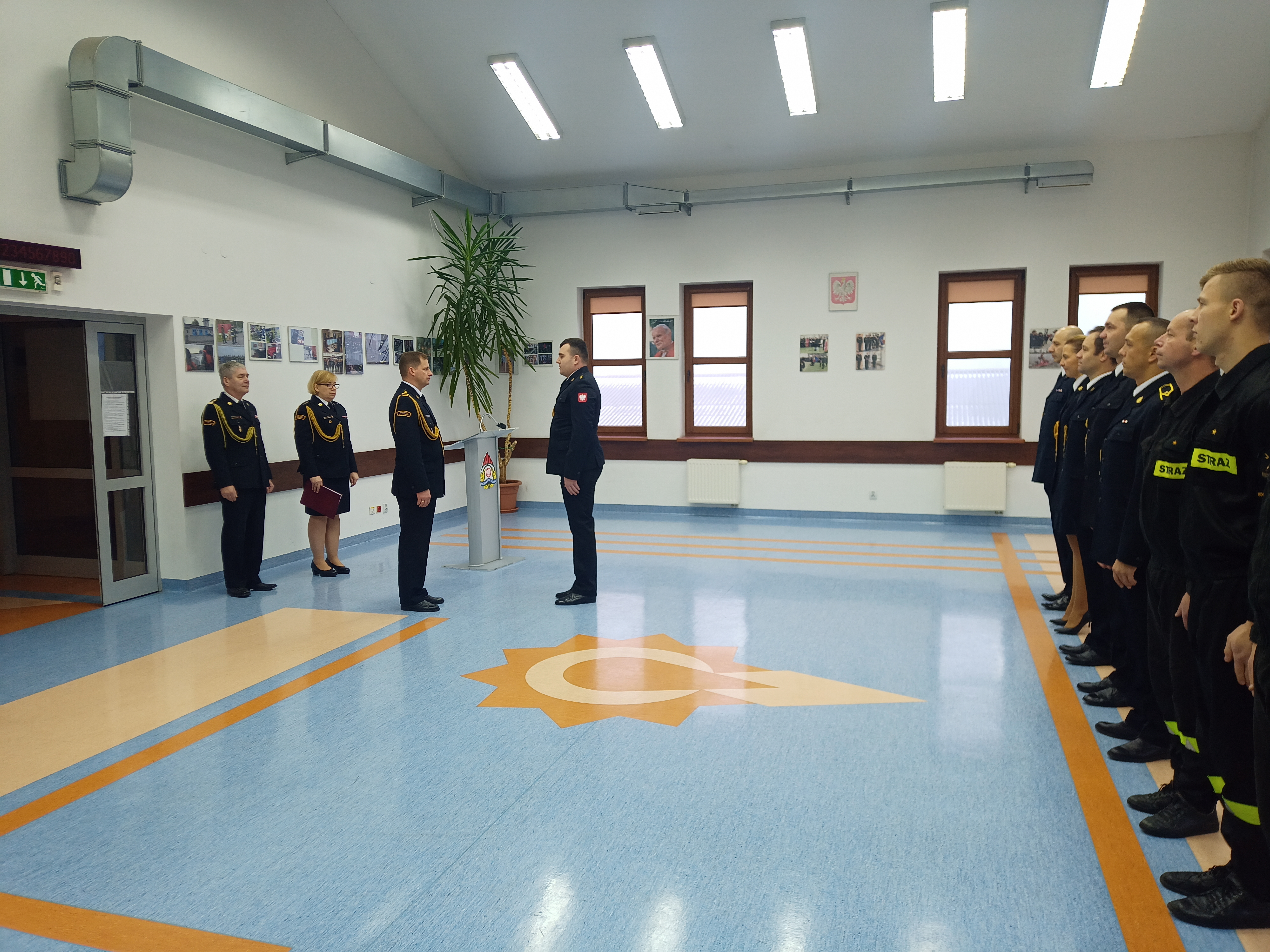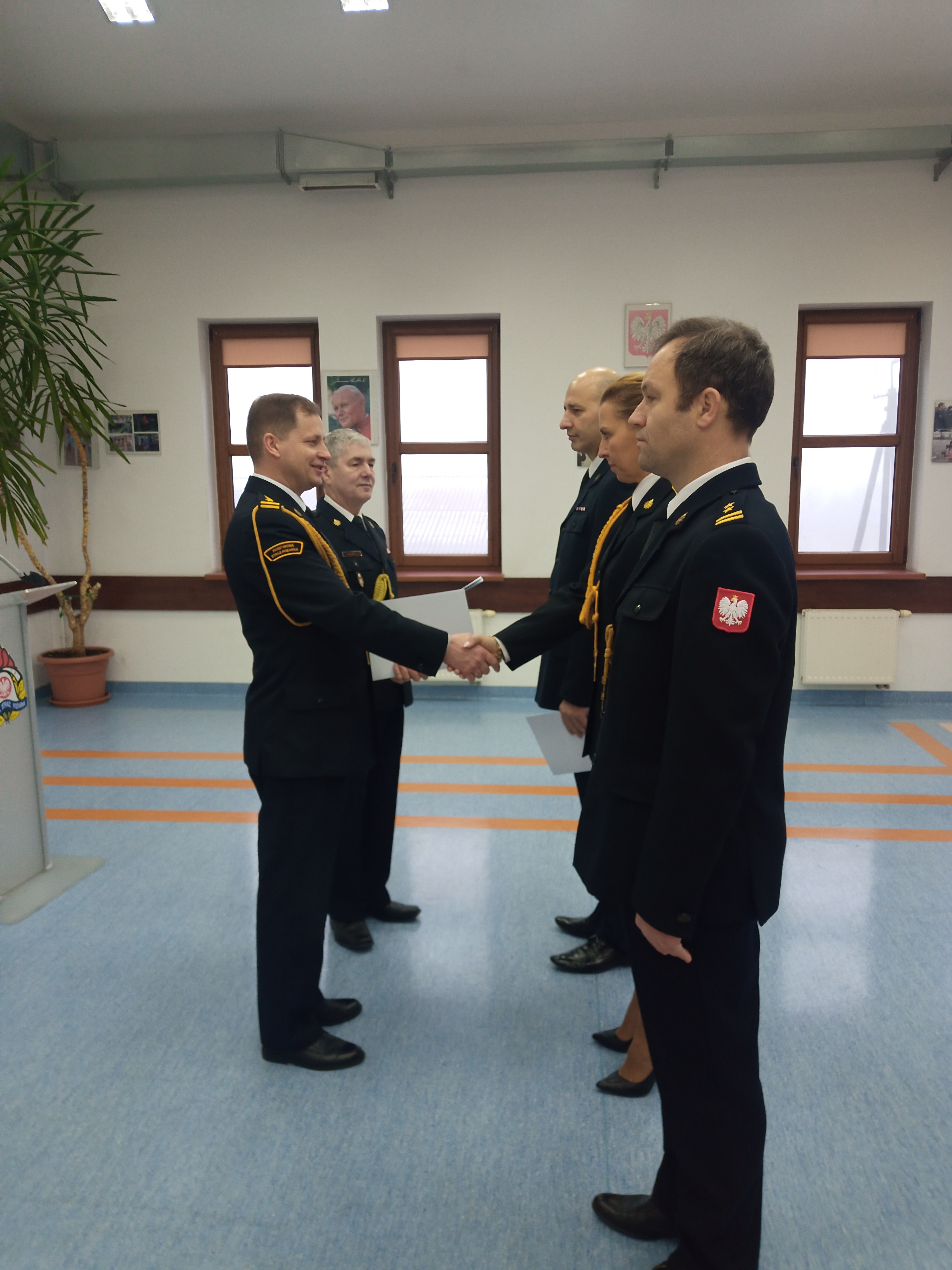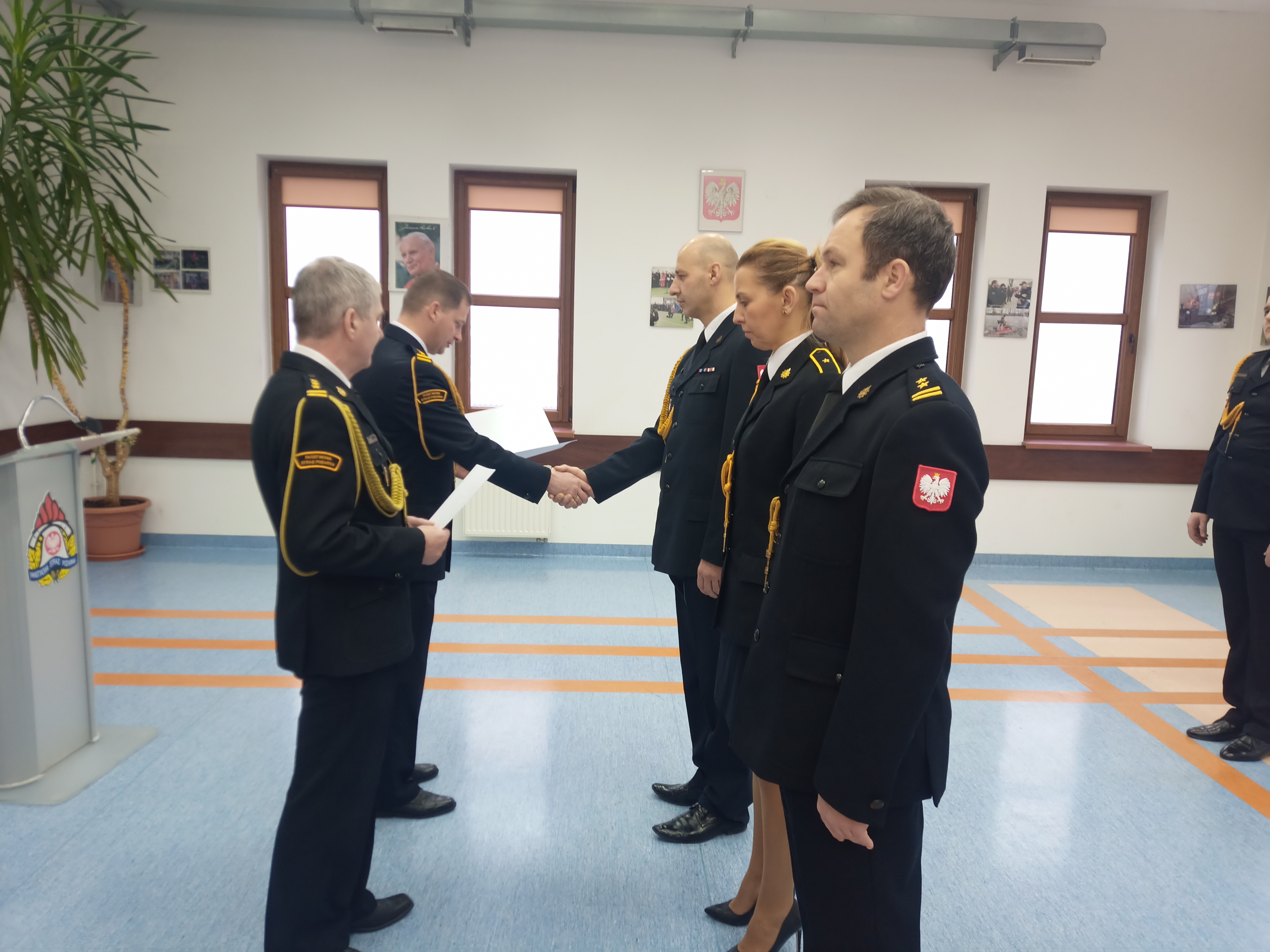 Komendant Powiatowy PSP w Sokołowie Podlaskim pogratulował także mł. kpt. Robertowi Golatowskiemu, który ukończył w Akademii Pożarniczej przeszkolenie zawodowe przygotowujące do zajmowania stanowisk związanych z kierowaniem działaniami ratowniczymi (SPK). Został on awansowany w czwartek 7 grudnia 2023 r. w siedzibie Komendy Głównej PSP. Odbyła się tam uroczysta zbiórka, podczas której komendant główny PSP gen. brygadier dr inż. Andrzej Bartkowiak dokonał aktu promocji na pierwszy stopień oficerski Państwowej Straży Pożarnej 43 strażaków, którym Minister Spraw Wewnętrznych i Administracji rozkazem personalnym z dnia 24 listopada 2023 r. nadał stopień młodszego kapitana PSP.