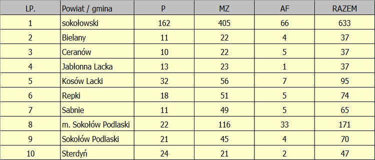Zestawienie zdarzeń w rozbiciu na podział administracyjny w powiecie sokołowskim w 2025 roku.