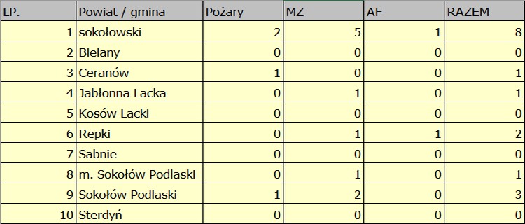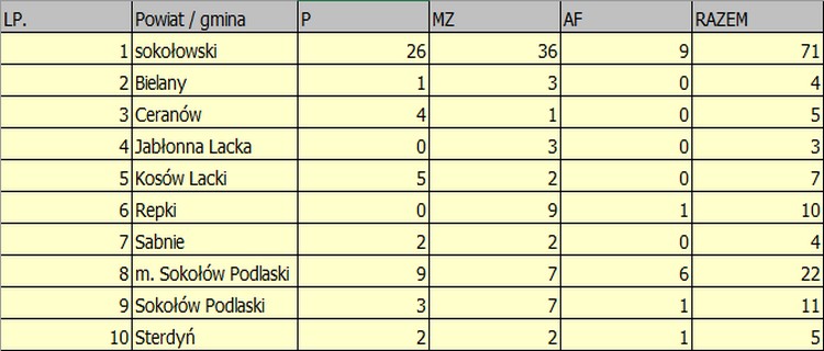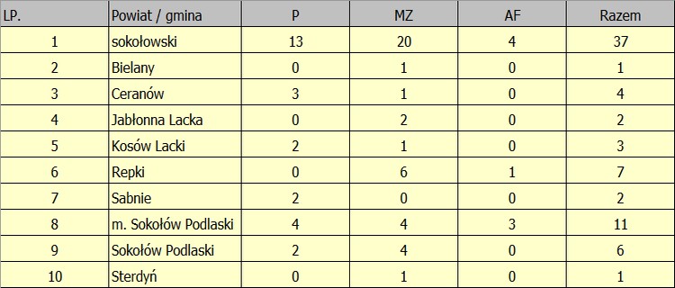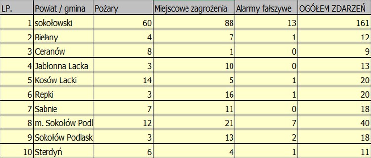 Zestawienie zdarzeń w rozbiciu na podział administracyjny w powiecie sokołowskim w 2026 roku.