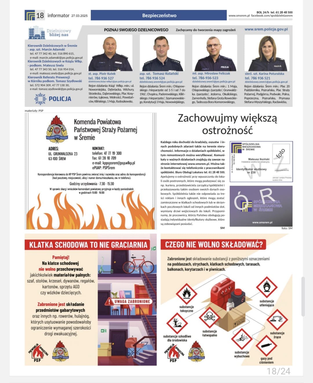 W kwartalniku tym po raz pierwszy pojawił sie materiał informacyjny Komendy Powiatowej PSP w Śremie dotyczący bezpieczeństwa. Na jego łamach będziemy mogli raz na kwartał umieszczać informacje, które przyczynia się do poprawy bezpieczeństwa w powiecie śremskim. Periodyk dociera do wszytkich mieszkań, które są w zasobie SM Śrem czyli do blisko 6tys. domostw.