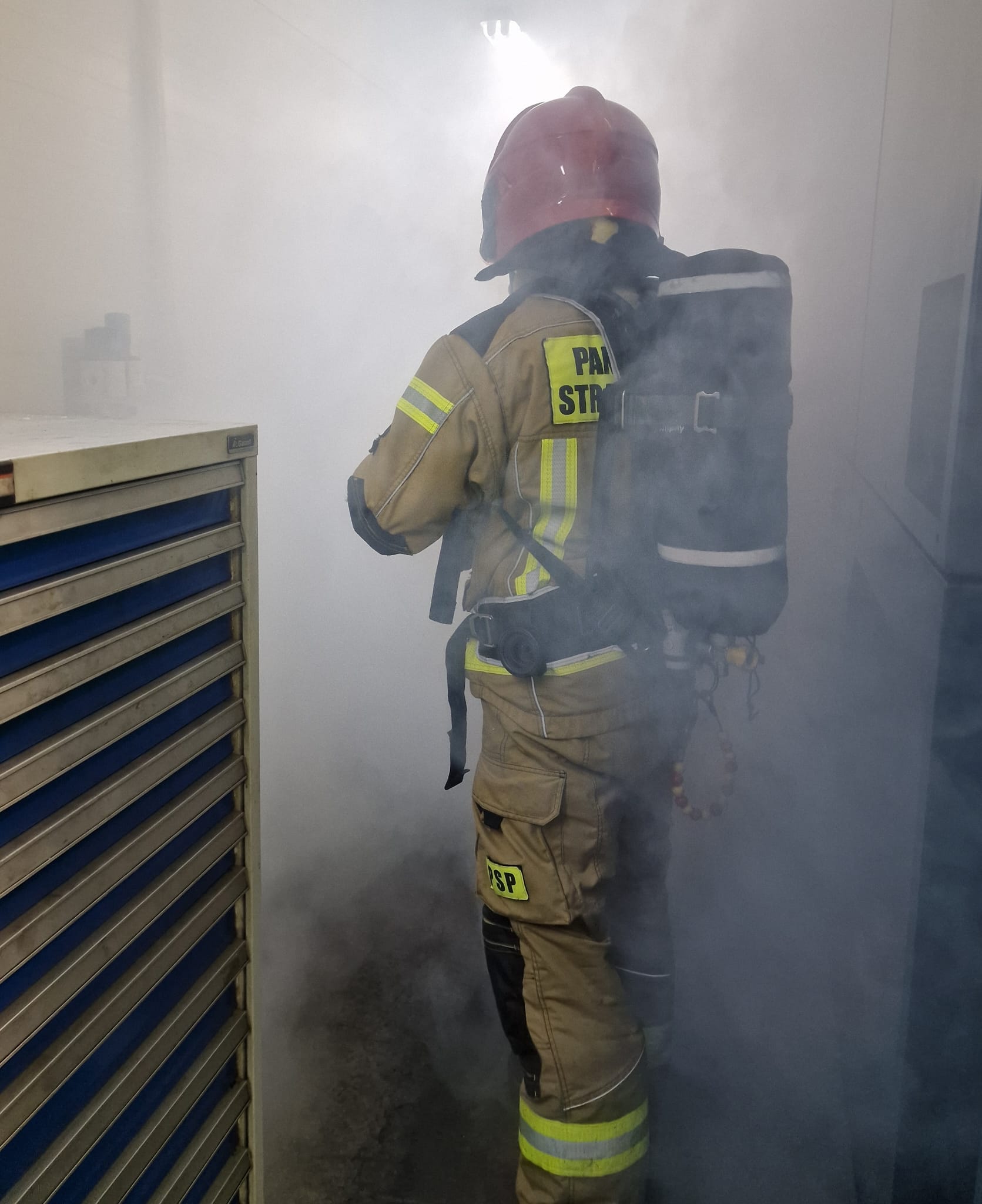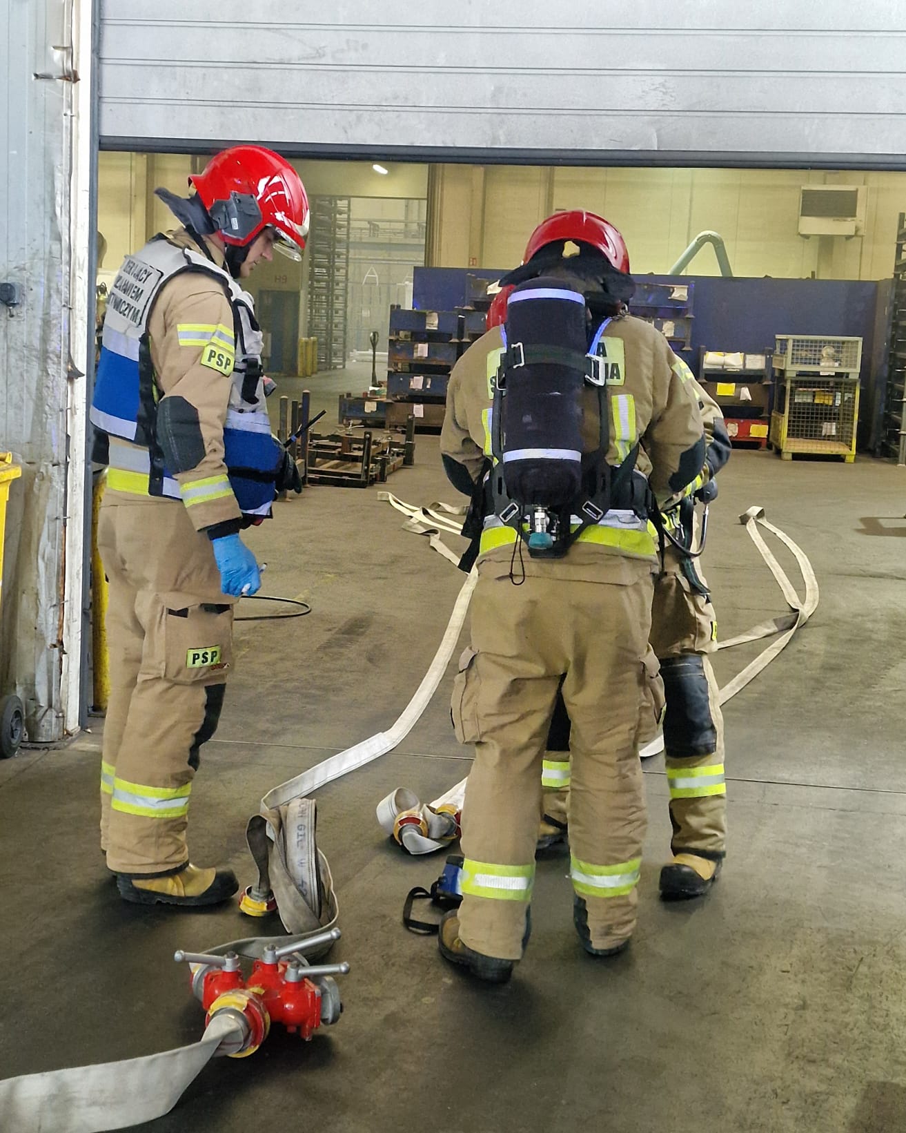 Działania JOP polegały na uwolnieniu osoby poszkodowanej i udzieleniu jej kpp oraz na lokalizacji i likwidacji pożaru wewnątrz hali.