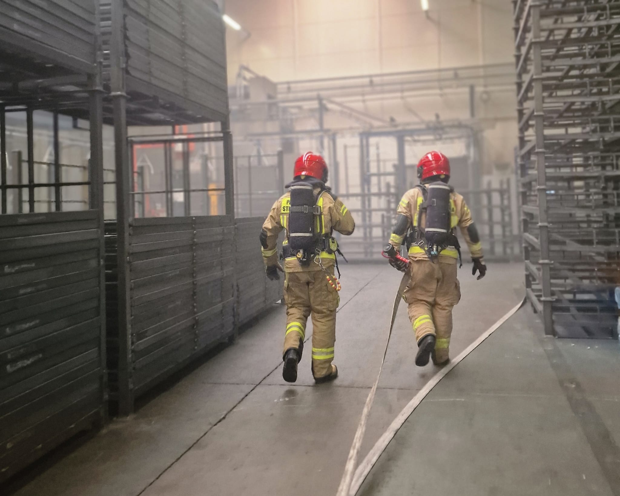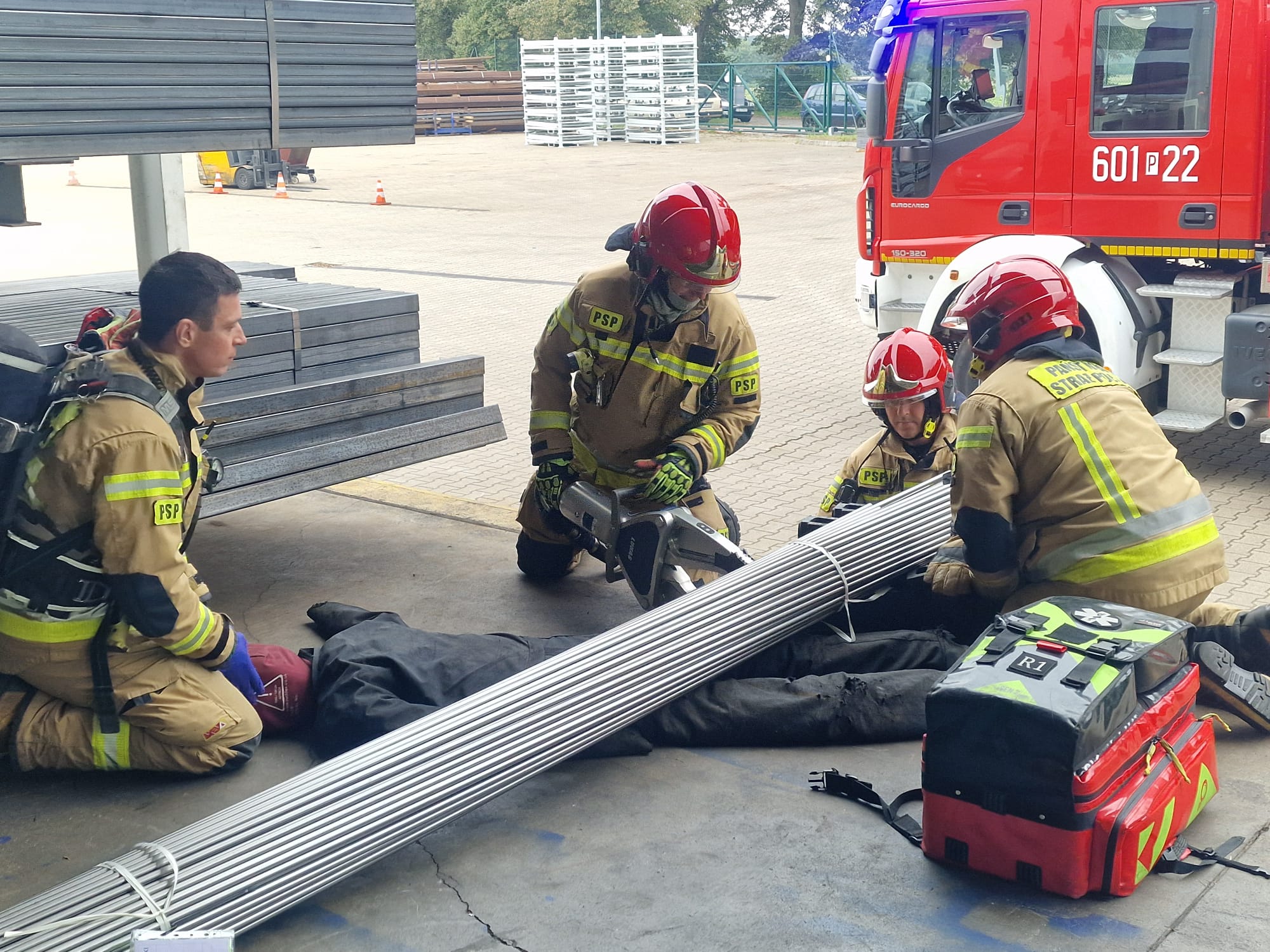 Scenariusz zakładał wypadek jednego z pracowników. Doznał on urazu kręgosłupa podczas prac załadunkowych. Elementy stalowe przygniotły go i nie mógł wydostać sie spod nich o własnych siłach. Jednocześnie na jednej z hal doszło do pożaru i silnego zadymienia. Jeszcze przed przyjazdem JOP ewakuacje przeprowadzili pracownicy firmy. Wszyscy oprócz przygnieconej przez stal osoby znaleźli sie w miejscu zbiórki.