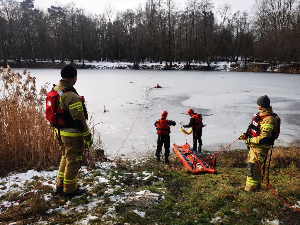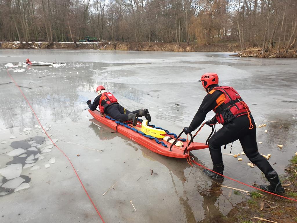 W dniach 20-21 stycznia zmiany służbowe jednostki ratowniczo – gaśniczej w Śremie przeprowadziły ćwiczenia na akwenie z ratownictwa lodowego na poziomie podstawowym przy użyciu sprzętu będącego na wyposażeniu JRG Śrem. Warunki pogodowe pozwoliły na zrealizowanie zagadnień samoratowania ratownika, pod którym załamał się lód, budowanie stanowisk asekuracyjnych dla ratownika, ewakuacji osoby z przerębla przy użyciu sprzętu do ratownictwa lodowego w zakresie podstawowym. Ćwiczenia realizowano na akwenie w Parku Powstańców Wielkopolskich w Śremie. Podsumowując ćwiczenia omówiono postępowanie podczas wystąpienia hipotermii u poszkodowanego.