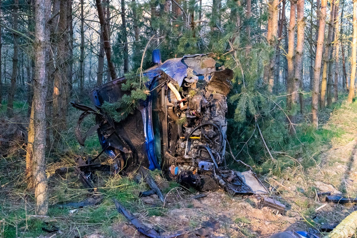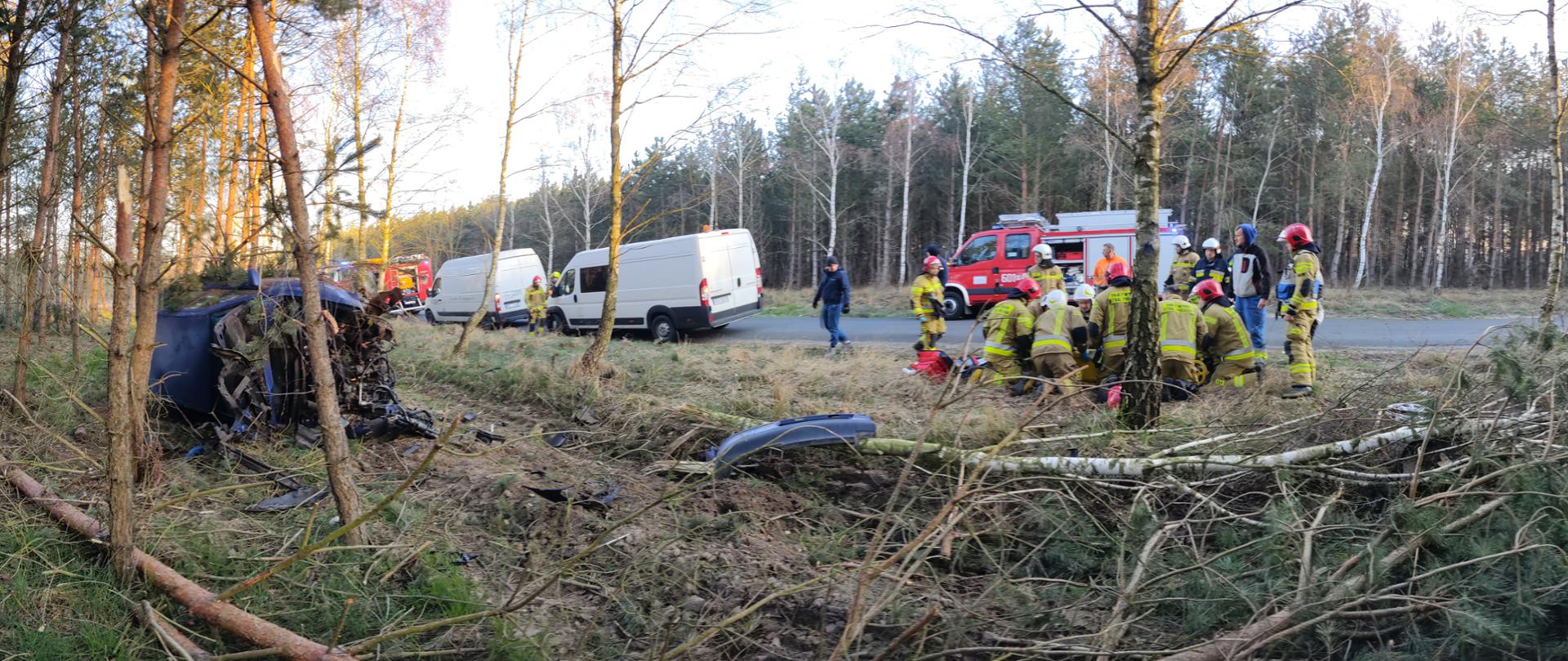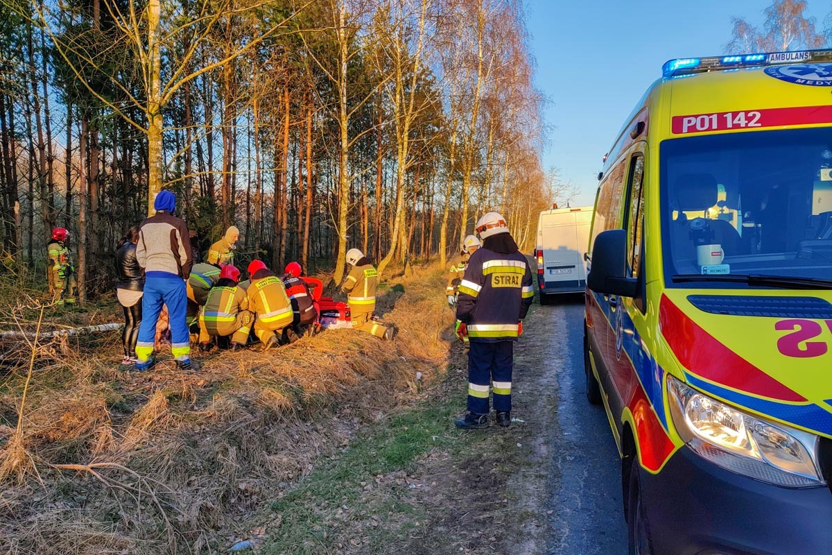 Po przyjeździe na miejsce zdarzenia JOP w rozpoznaniu ustalono, że samochód osobowy wypadł z drogi, dachował i znajduje się w lesie, 10 metrów od drogi utwardzonej. Kierujący pojazdem mężczyzna opuścił auto o własnych siłach. Działania JOP polegały na zabezpieczeniu miejsca zdarzenia oraz odłączeniu akumulatora w pojeździe. Sprawdzono auto osobowe czy kierujący pojazdem jechał sam, przeszukano teren wokół pojazdu. Kierującemu pojazdem udzielono kwalifikowanej pierwszej pomocy w postaci wsparcia psychicznego a po przybyciu ZRM przekazano poszkodowanego obsadzie karetki. Udział 6 zastępów 27 ratowników, Policja, ZRM.