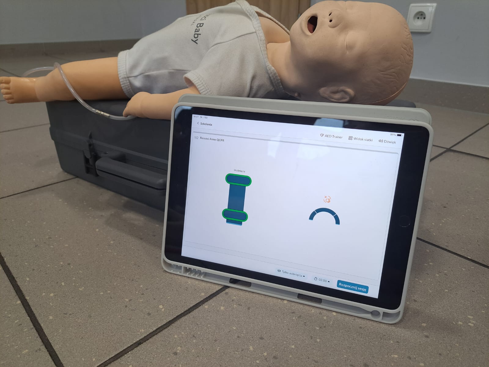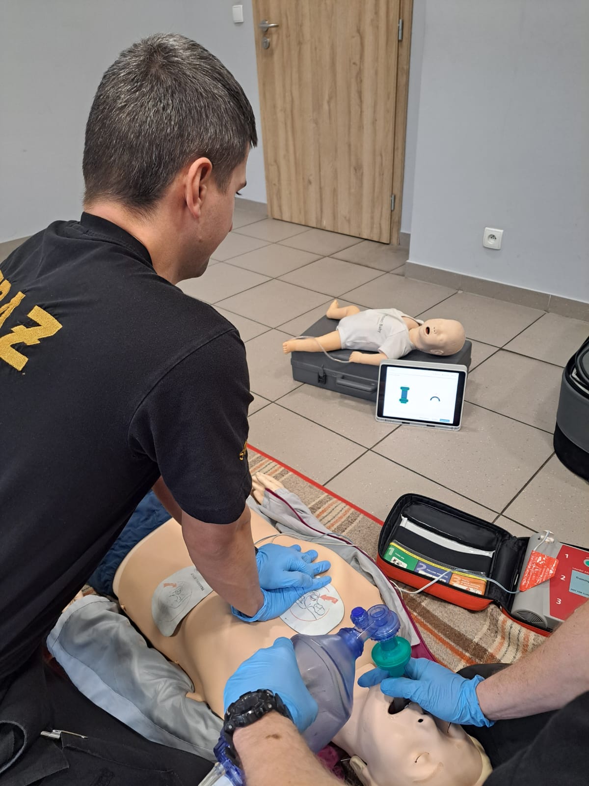 Ćwiczenia z ratownictwa medycznego przeprowadzane na nowoczesnym manekinie do resuscytacji krążeniowo oddechowej.