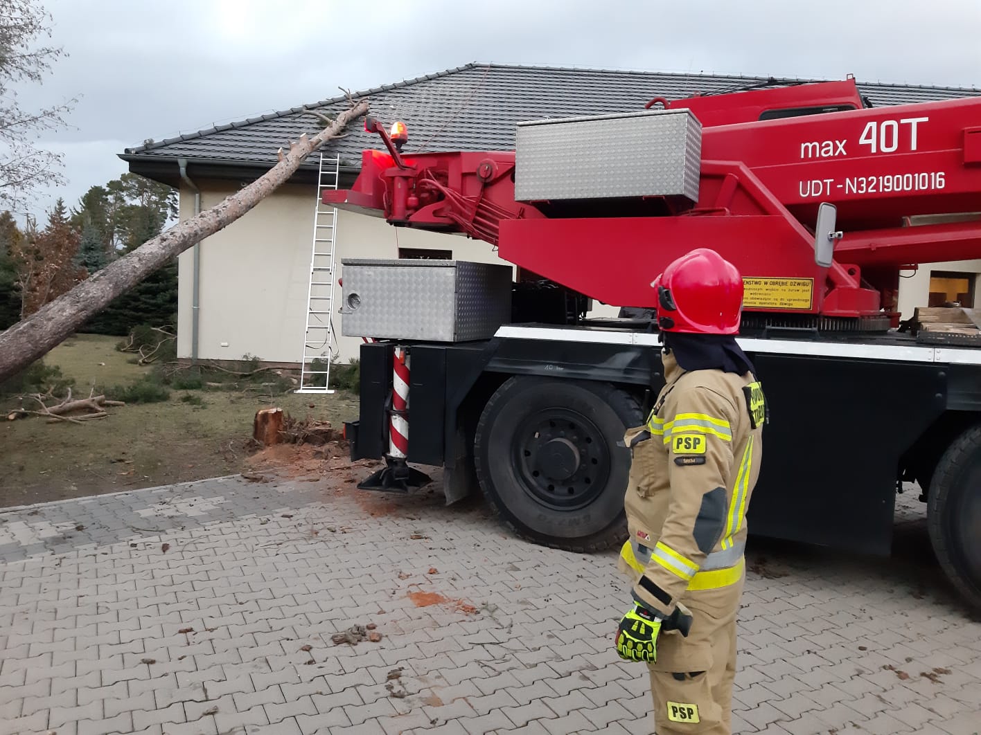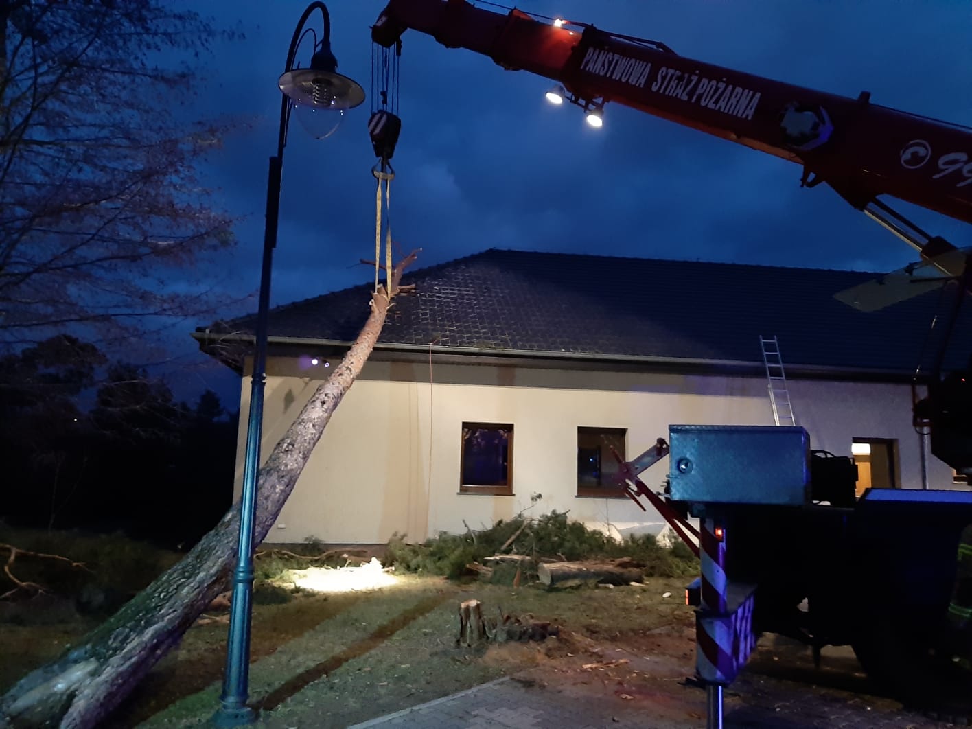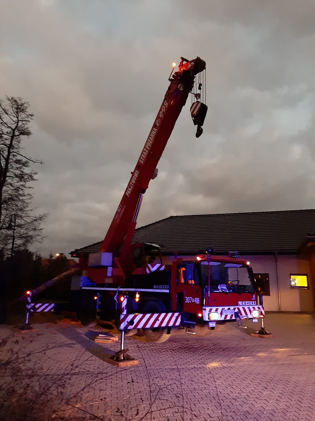 W momencie przybycia na teren akcji wsparcia z poznańskiej Komendy przystąpiono do działań, które polegały na podniesieniu obalonego drzewa przy wykorzystaniu dźwigu, oraz położenia go na ziemi, aby w sposób bezpieczny można było przeprowadzić jego pocięcie. Działania utrudniał wciąż wiejący porywisty wiatr oraz szybko zapadający zmierzch. Mimo tych przeciwności akcję udało się zakończyć pozytywnie.