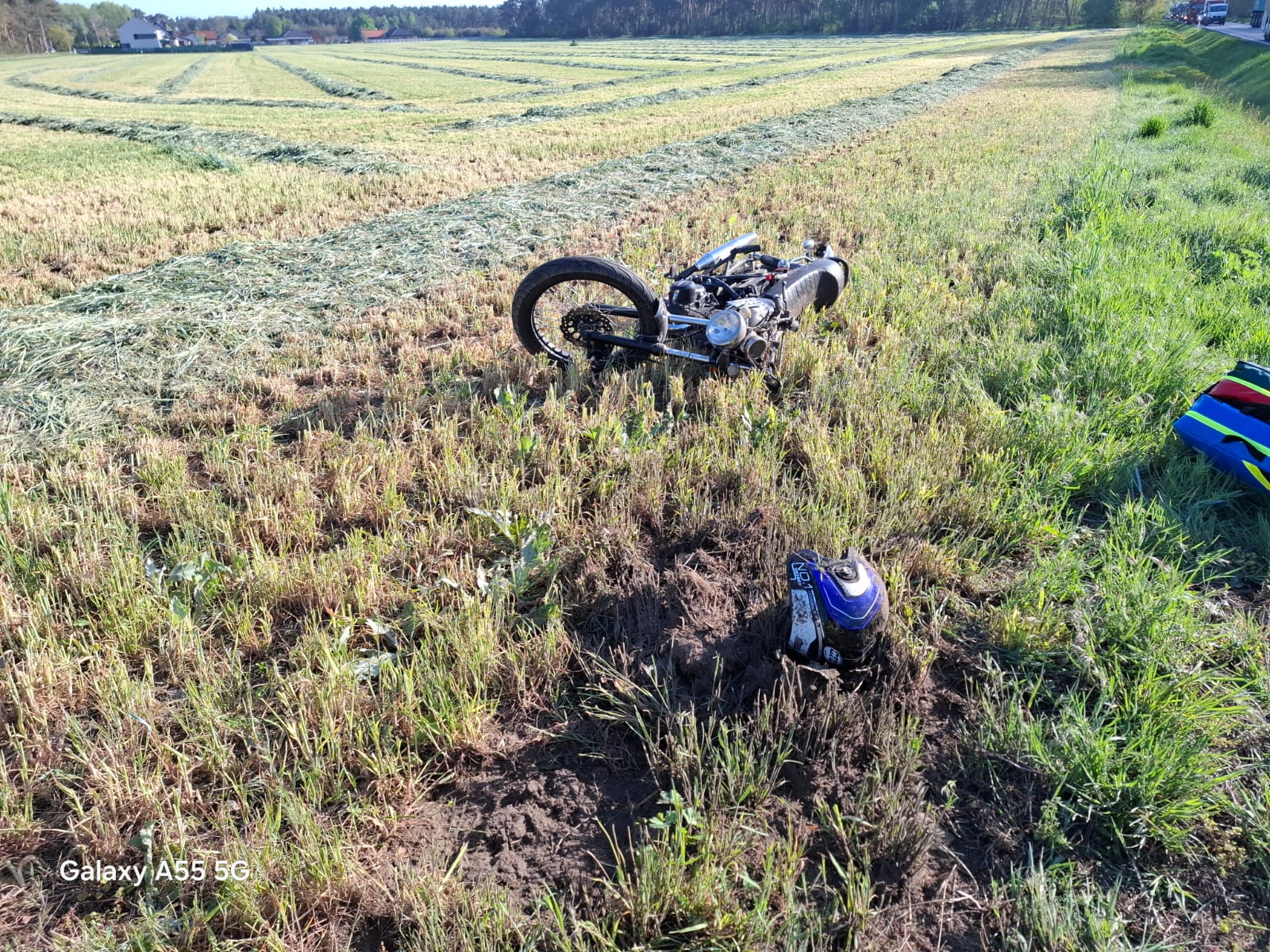 Niezwłocznie zadysponowano 2 zastępy z JRG Śrem i zastęp OSP Chrząstowo. Po przybyciu na miejsce, w rozpoznaniu ustalono, że w zdarzeniu brał udział samochód osobowy, którym podróżowała jedna osoba oraz motocykl prowadzony przez 14latka, który w wyniku zdarzenia znajdował się po przeciwnej stronie jezdni w rowie.