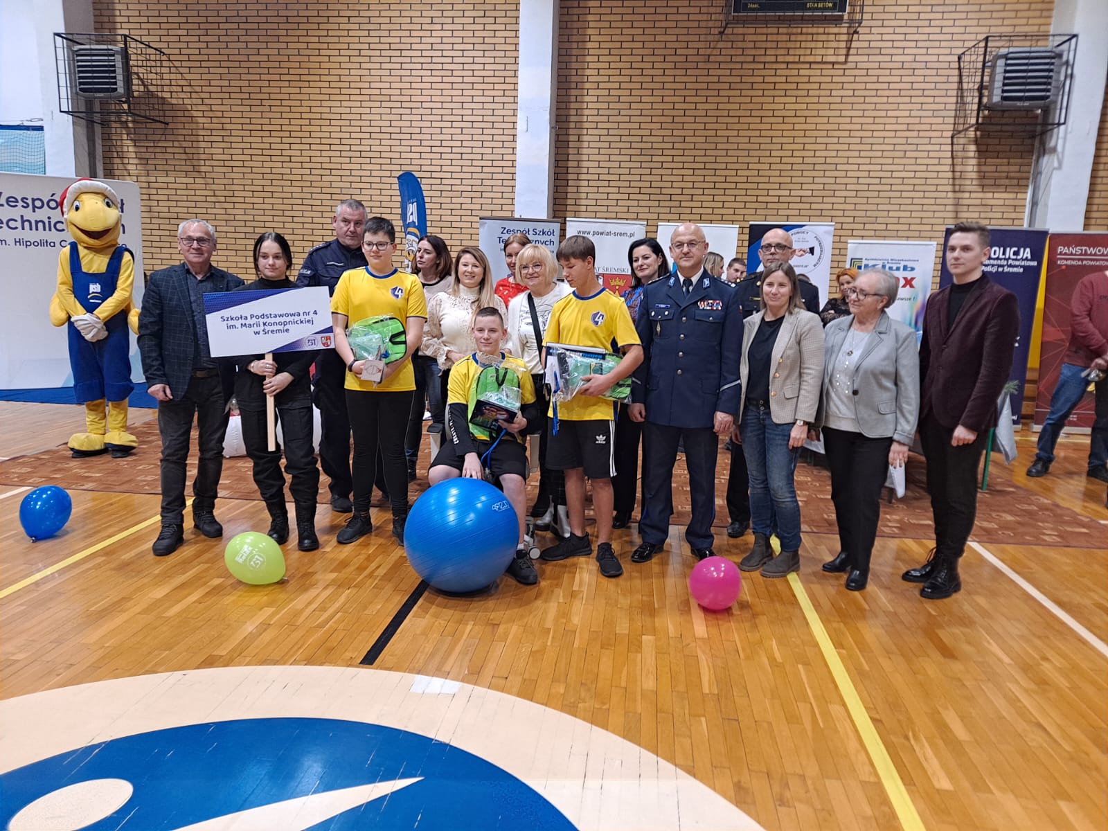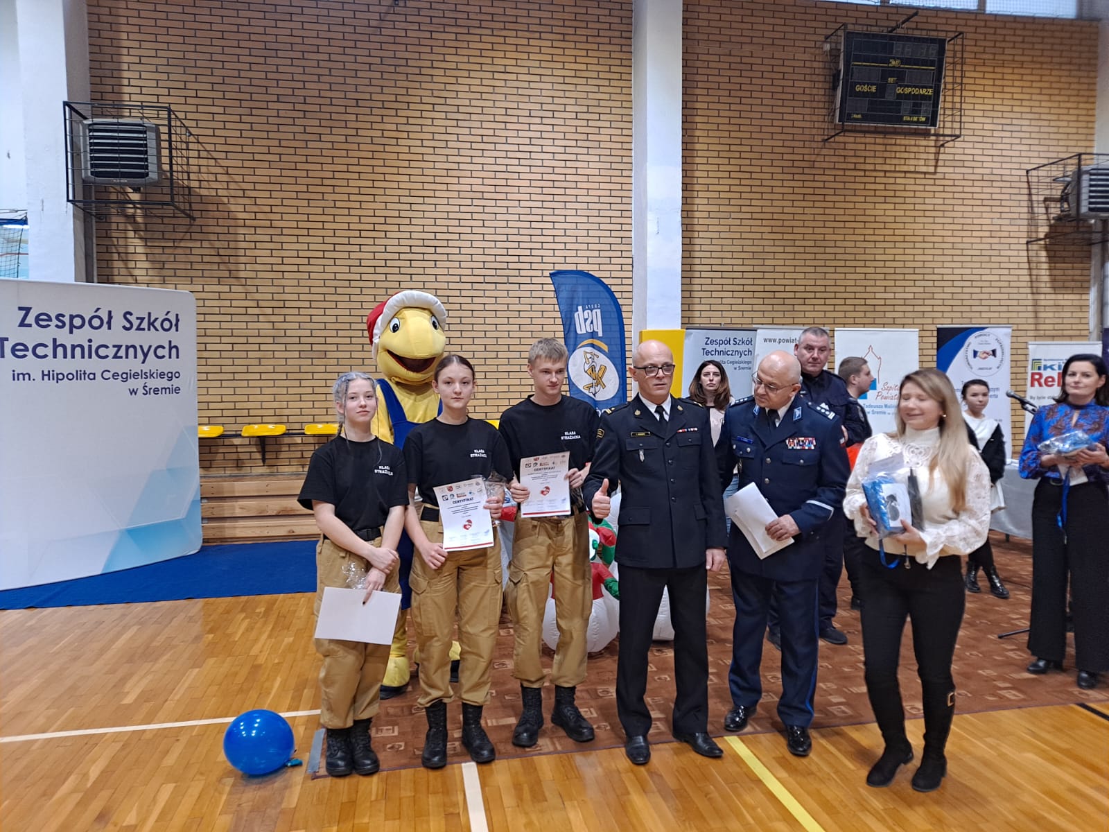 Puchary dla Szkół, które znalazły się na podium oraz nagrody dla wszystkich uczestników wręczyli Pani Maria Bychawska Dyrektor ZST im. H. Cegielskiego w Śremie, mł. bryg. Tomasz Kierzek Komendant Powiatowy PSP w Śremie, insp. Sławomir Jądrzak Komendant Powiatowy Policji w Śremie, Pani Marzena Banach przedstawiciel Szpitala Powiatowego im. T. Malińskiego w Śremie, Przedstawiciel Starostwa Powiatowego Pan Przemysław Polowczyk, Przedstawiciele Klubu Relax oraz Pani Agnieszka Komorowska – członek Rady Rodziców.