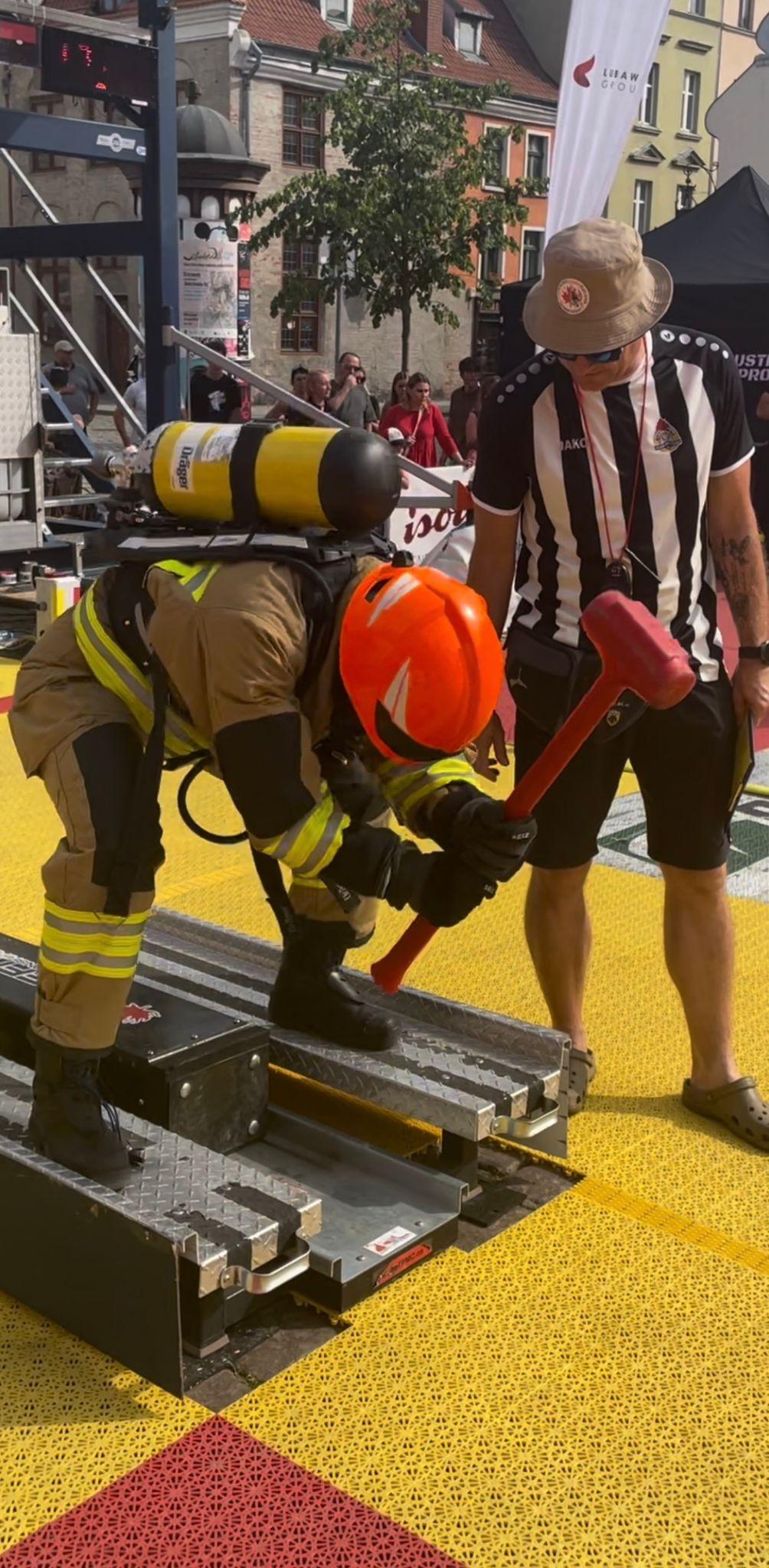3) uderzanie 3 kg młotem w ciężar o wadze 72 kg i przesunięcie go na odległość 1,5 m do wyznaczonego obszaru - jest to zadanie imitujące wyważanie drzwi,