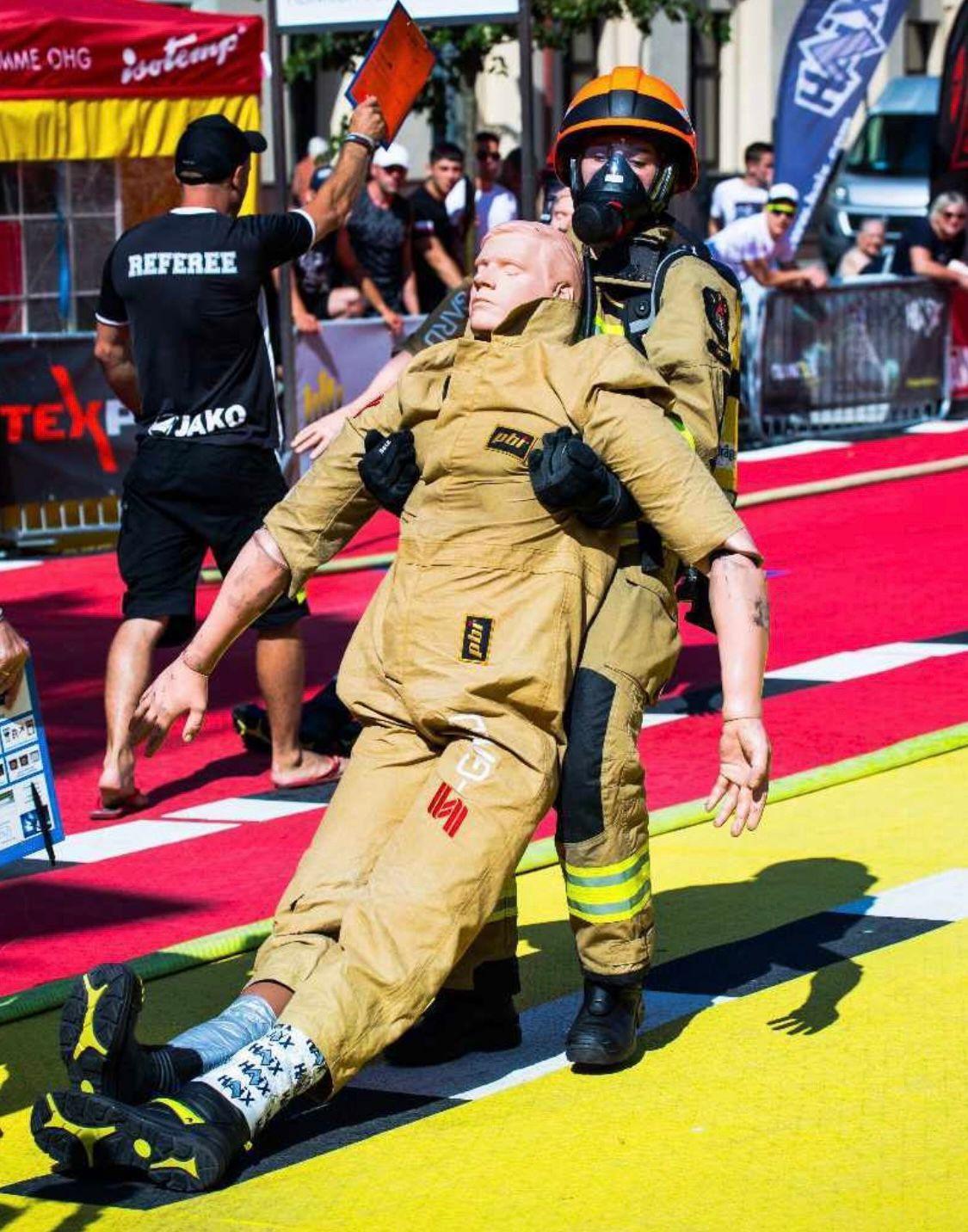 5) przeciąganie manekina o wadze 80 kg tyłem do mety na odległość 30 m, czyli ewakuacja osoby poszkodowanej. Czas zatrzymuje się w momencie pokonania linii mety przez zawodnika oraz manekina.