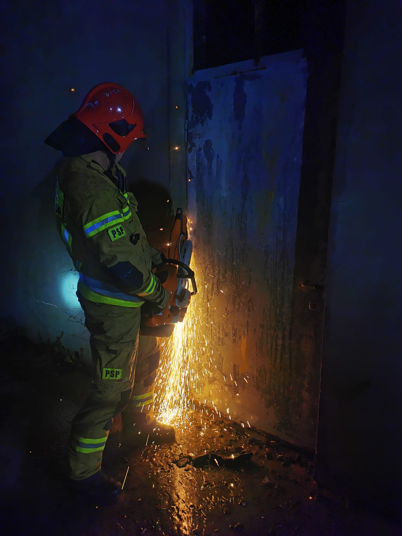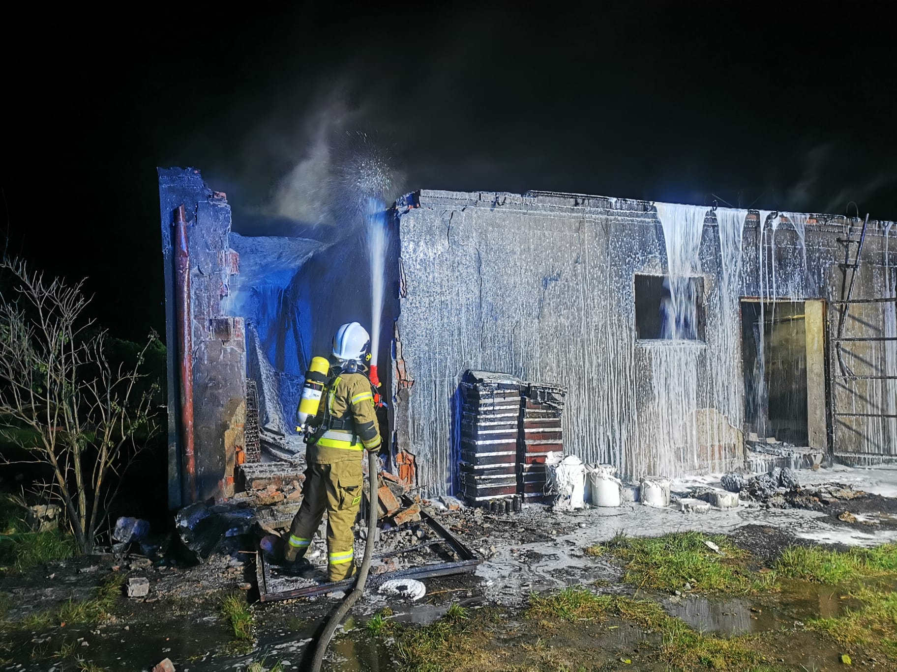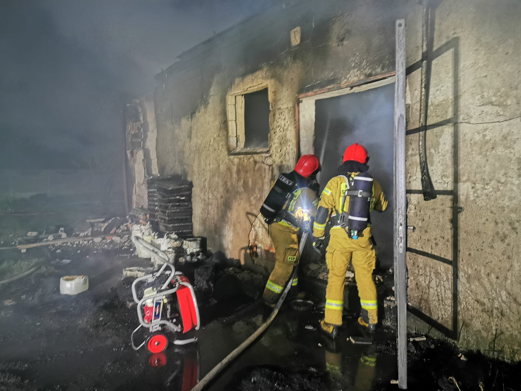 Działania SP polegały na zabezpieczeniu miejsca zdarzenia oraz na podaniu trzech prądów wody w natarciu na palący się materiał palny w budynku przez otwory okienne i drzwi. W strefie działań pracowali ratownicy w środkach ochrony indywidualnej oraz aparaty ochrony układu oddechowego. Z uwagi na widoczne liczne pęknięcia i zawalający się strop, podjęto decyzję o działaniach gaśniczych z zewnątrz. W trakcie prowadzonych działań usunięto metalowe drzwi przy pomocy piły tarczowej w celu dotarcia do źródła ognia. Podczas akcji gaśniczej podjęto decyzję o użyciu ciężkiej piany gaśniczej, która dokładnie wniknęła w tlący się materiał palny dogaszając zarzewia ognia. W trakcie działań używano wentylatorów osiowych oraz najaśnic przewoźnych i przenośnych do oświetlenia terenu akcji. Z uwagi na zagrożenie dla ratowników oraz brak informacji o potencjalnych osobach poszkodowanych w budynku odstąpiono od przeszukania części budynku objętego pożarem. Sprawdzono pomieszczenia które nie zostały naruszone. ]