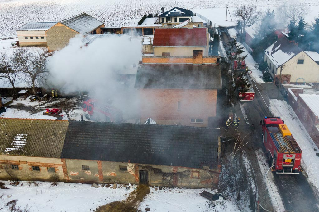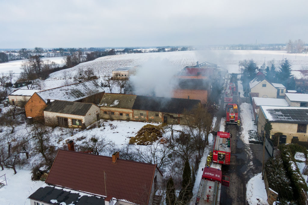 Po przybyciu zadysponowanych zastępów na miejsce zdarzenia w wyniku rozpoznania ustalono, że pali się obora całkowicie objęta pożarem. Przed przybyciem zastępów straży pożarnej właściciele wyprowadzili 16 cielaków. Działania JOP polegały na zabezpieczeniu miejsca zdarzenia, odłączeniu źródła zasilania na budynku. Na palący się budynek podano 3 prądy w natarciu i 1 prąd gaśniczy w obronie na przyległe budynki gospodarcze z czego jeden prąd gaśniczy w natarciu podawany był z drabony D10W. W trakcie działań gaśniczych udzielono pomocy jednej osobie w postaci założenia opatrunku hydrożelowego na poparzoną dłoń oraz wsparcia psychicznego.Na miejsce zadysponowano ZRM, który po przybyciu zabrał osobę poszkodowaną do szpitala celem dalszej hospitalizacji. Podczas działań gaśniczych częściowemu zawaleniu uległ dach obory. Po ugaszeniu pożaru teren działań sprawdzono przy pomocy kamery termowizyjnej - brak podwyzszonych wskazań temperatury pogorzeliska. Spaleniu uległa obora oraz dwa cielaki. Udział 8 zastępów 33 ratowników, ZRM oraz Pogotowie Energetyczne.