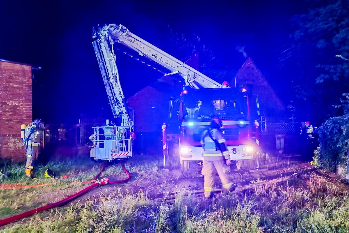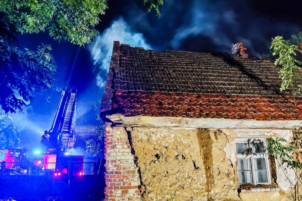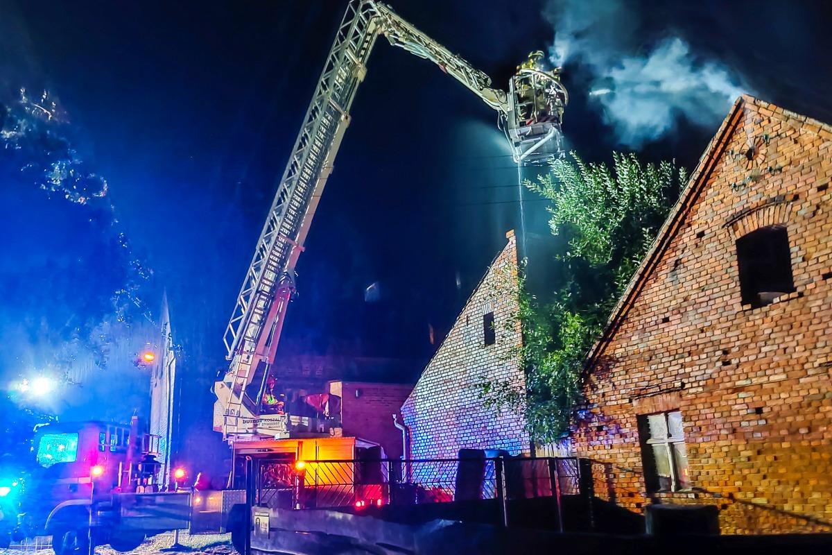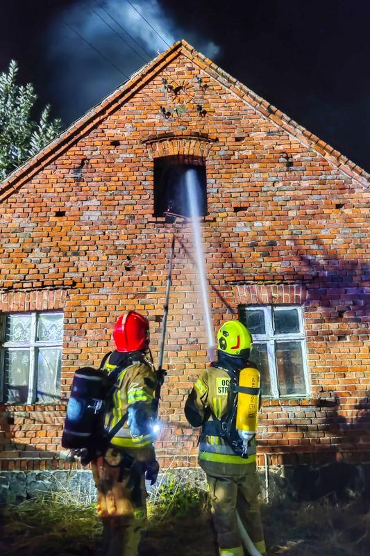 z okien. Działania polegały na podaniu prądów gaśniczych zarówno z zewnątrz na dach jak i w środku na palące się elementy wyposażenia pomieszczeń. Przed przybyciem JOP, jedna osoba opuściła budynek – brak obrażeń. Po przeszukaniu budynku nie stwierdzono innych osób poszkodowanych. Przeprowadzono drobne prace rozbiórkowe drewnianego dachu w celu dotarcia do zarzewi ognia. Na miejscu pojawili się również pracownicy energetyki w celu odłączenia energii elektrycznej. Policja równolegle do działań gaśniczych prowadziła czynności dochodzeniowe.