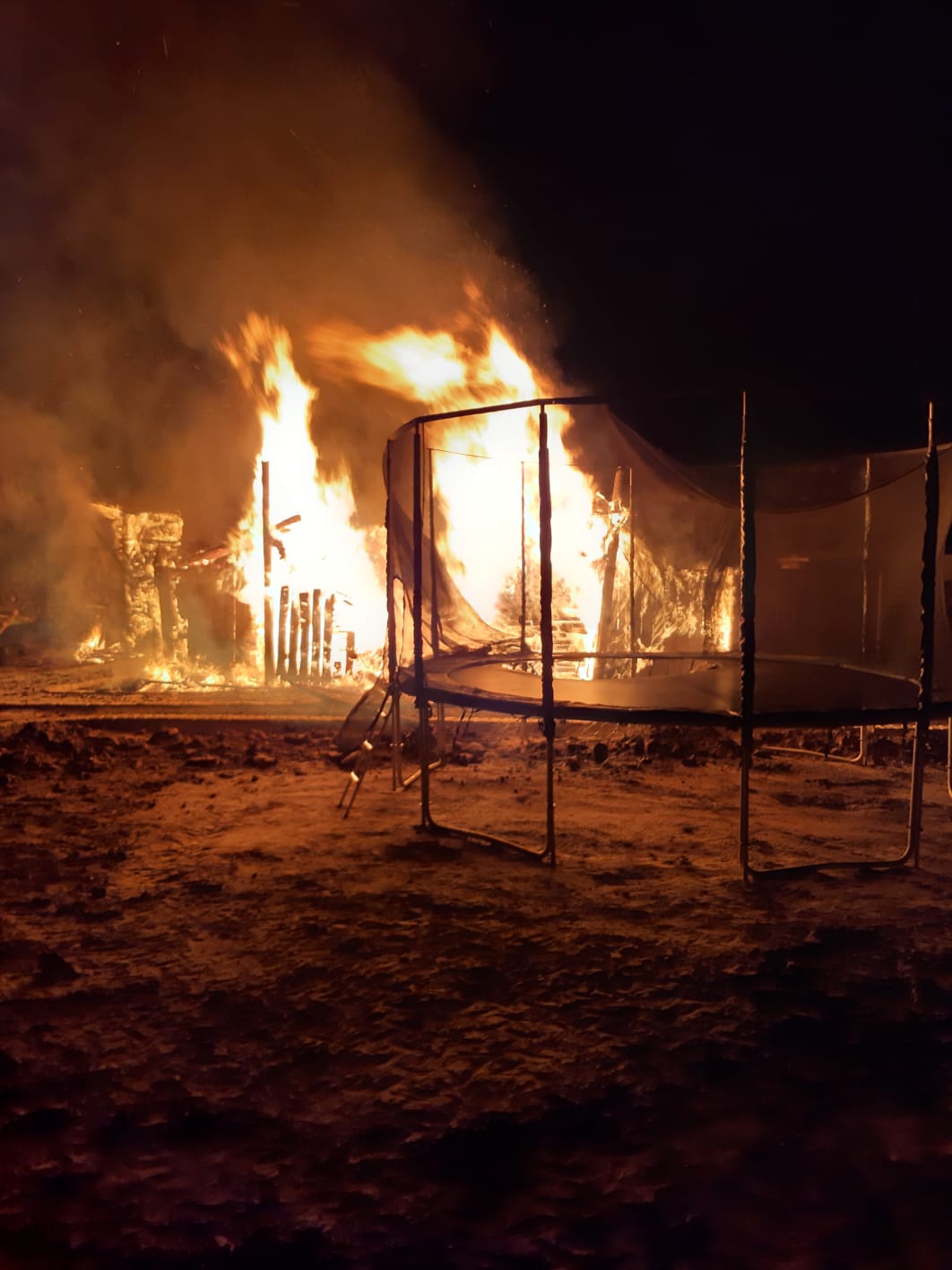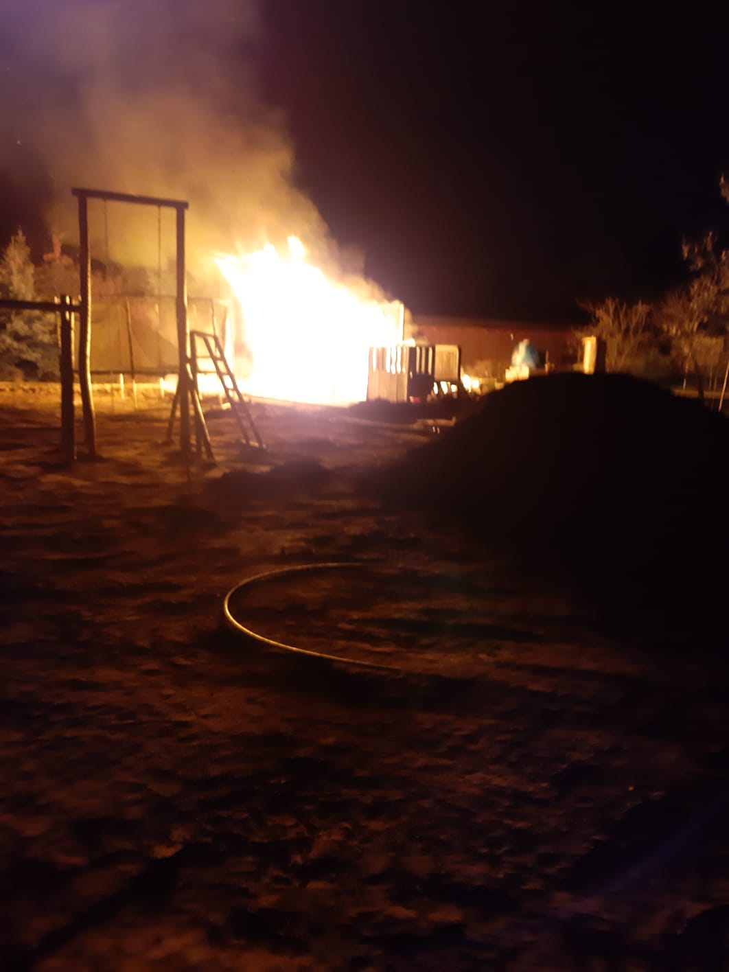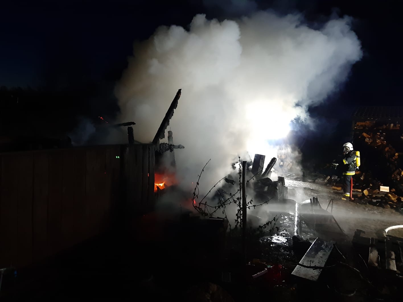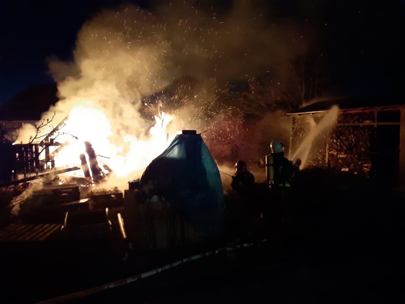 Po przybyciu zadysponowanych zastępów na miejsce zdarzenia ustalono, że pali się drewniany domek dla zabaw oraz wiata z drewnem. Brak osób poszkodowanych. Działania jednostek ochrony przeciwpożarowej polegały na zabezpieczeniu miejsca zdarzenia. Ratownicy zabezpieczeni w środki ochrony dróg oddechowych podali jeden prąd gaśniczy w natarciu na palący się domek dla dzieci oraz dwa prądy z czego jeden w obronie na palącą się wiatę z drewnem. Po ugaszeniu palącego się domku i wiaty miejsce pożaru zostału sprawdzone kamerą termowizyjną - brak miejsc z podwyższoną temperaturą. Udział 4 zastępy 20 ratowników.