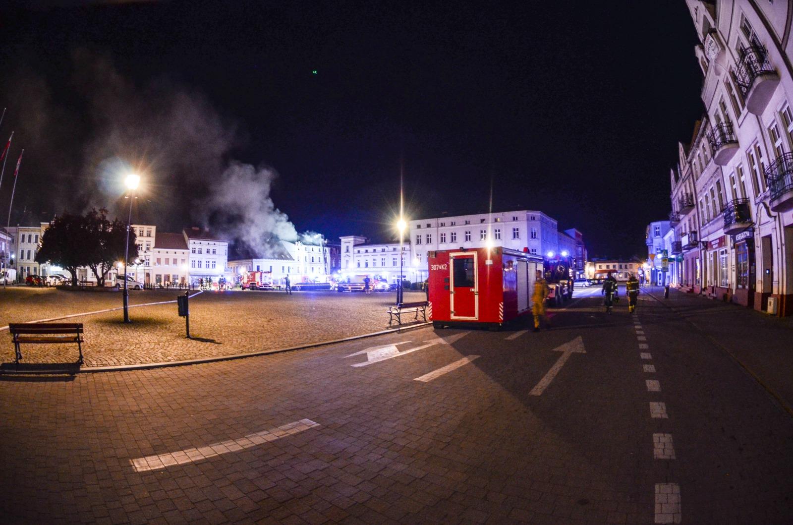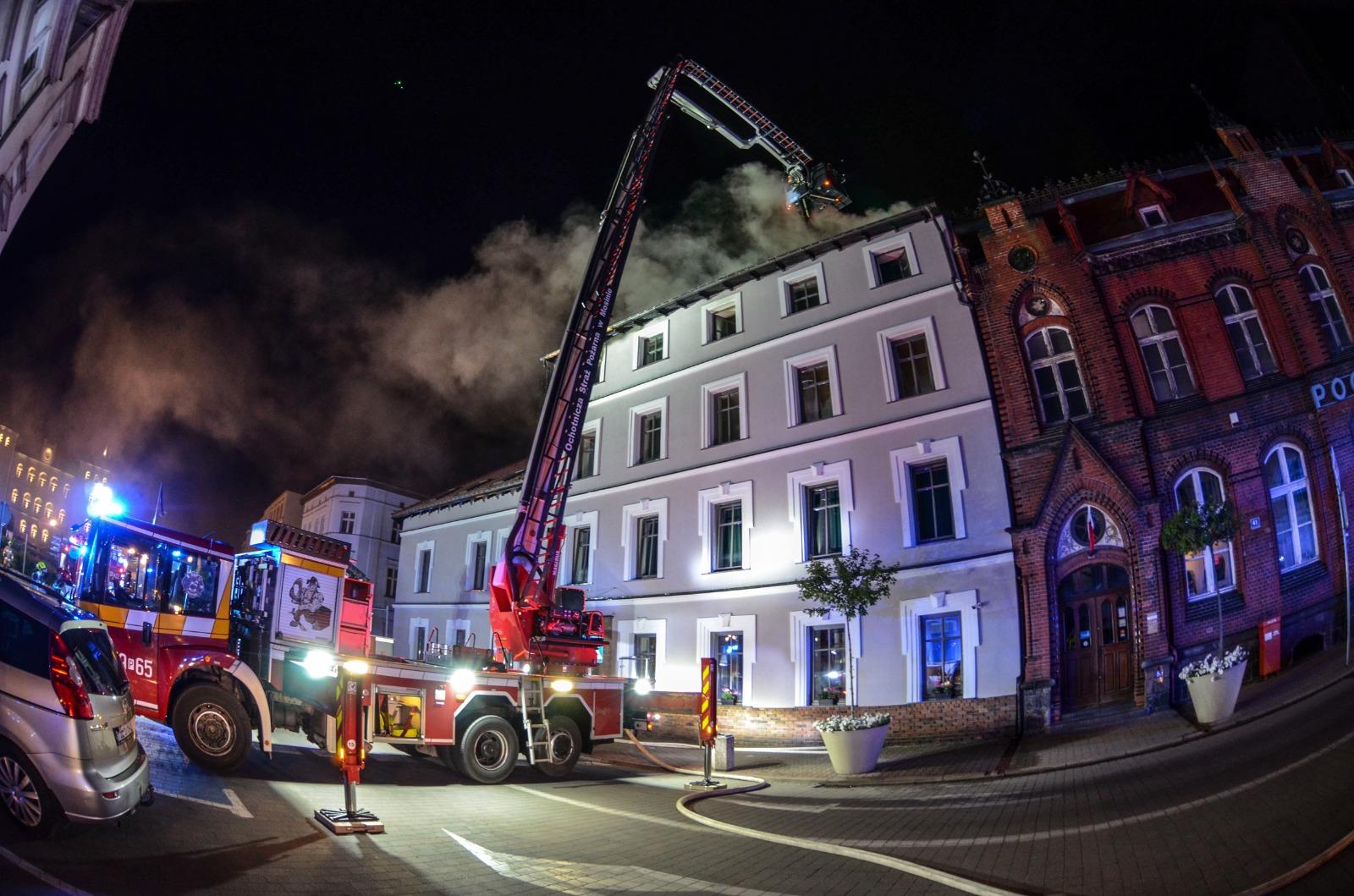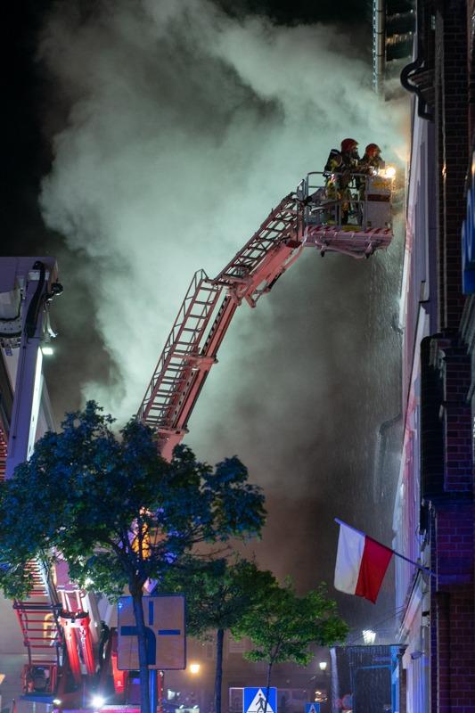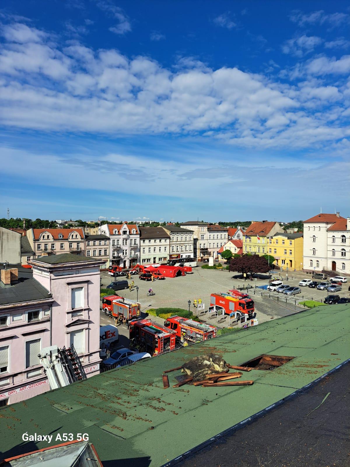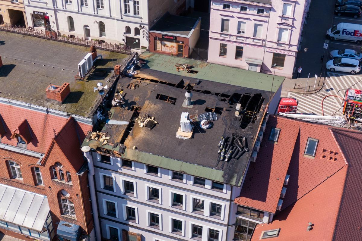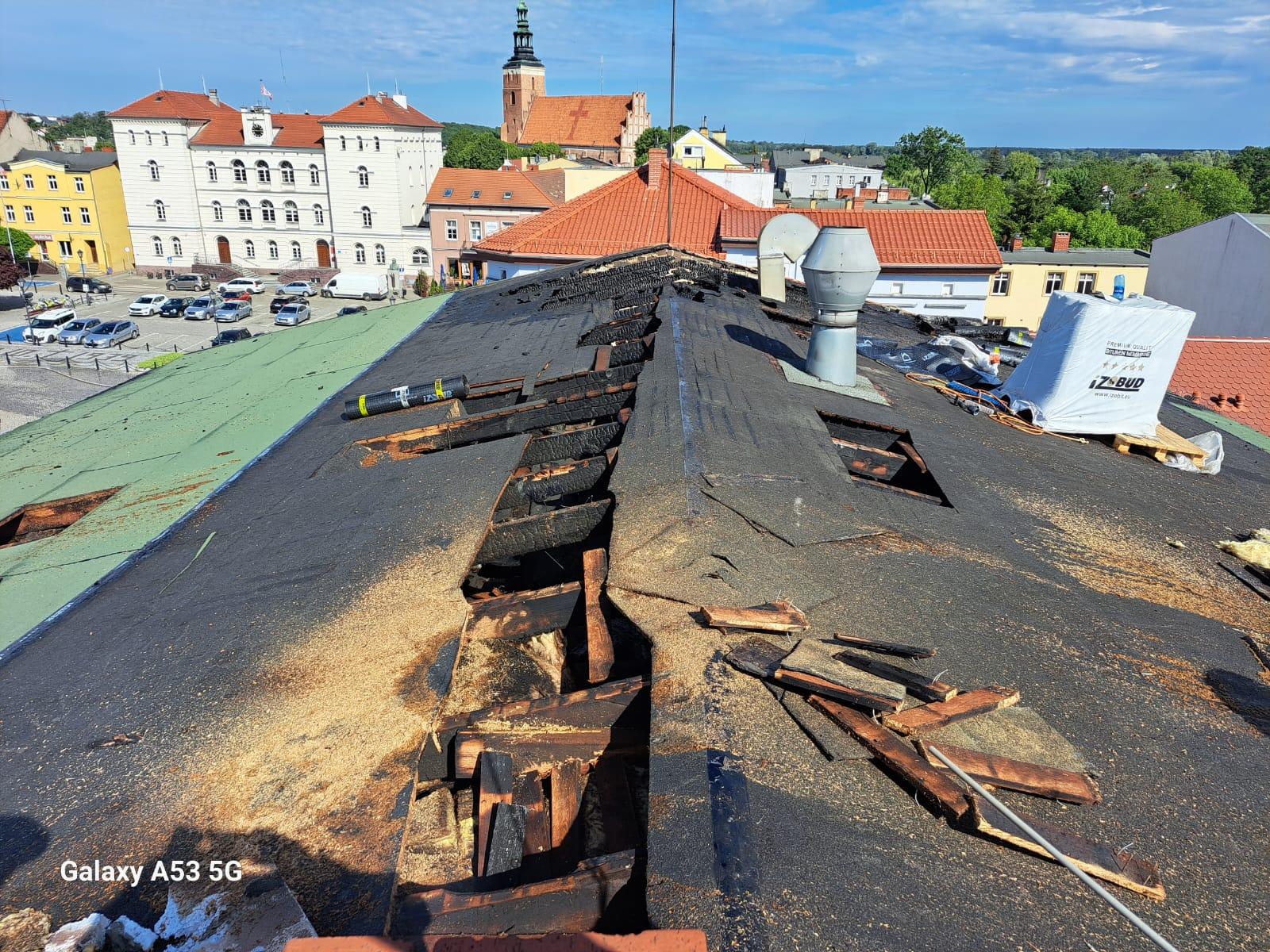 Kontrola temperatury wewnątrz pomieszczeń nie wykazała potencjalnych miejsc z podwyższoną temperaturą. Rota pracująca na dachu po wykonaniu przecięć usunęła tlącą się belkę więźby dachowej, zlokalizowaną przy ścianie z budynkiem Poczty Polskiej.