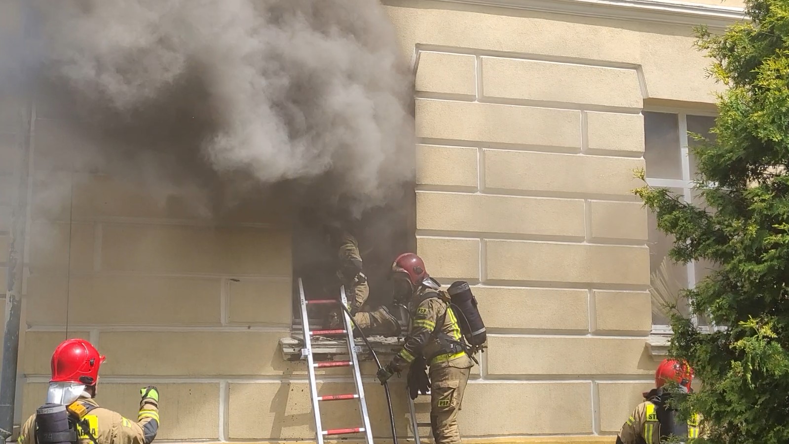Po przybyciu na miejsce zadysponowanych sił i środków i rozpoznaniu ustalono, że pali się budynek hotelowy - zabytkowy pałac, brak osób poszkodowanych. Działania JOP polegały na zabezpieczniu miejsca zdarzenia a po odłączeniu mediów podaniu trzech prądów gaśniczych w natarciu na palący się budynek. Rota zabezpieczona w OUO wyposażona w kamerę termowizyjną zlokalizowała miejsce pożaru - kuchnia na poziomie parteru. Ratownicy przystąpili do gaszenia pożaru wewnątrz budynku oraz z zewnątrz po usunięciu dwóch okiennic. Po ugaszeniu pożaru z pomieszczeń usunięto spalone elementy zlewając je wodą na zewnątrz. Kolejna rota sprawdziła pozostałe pomieszczenia na piętrze budynku pałacowego. Brak oznak przemieszczenia się pożaru. Następnie budynek został przewietrzony przy pomocy agregatów oddymiających. Sprawdzono kamerą termowizyjną miejsca w których mogłoby dojść do ewentualnego ponownego zapalenia - nie stwierdzono nieprawidłowości. Wszystkie pomieszczenia sprawdzono również pod kątem obecności tlenku węgla. Mierniki nie wskazały nieprawidłowości. Udział 9 zastępów 25 ratowników w tym grupa operacyjna KP PSP Śrem.