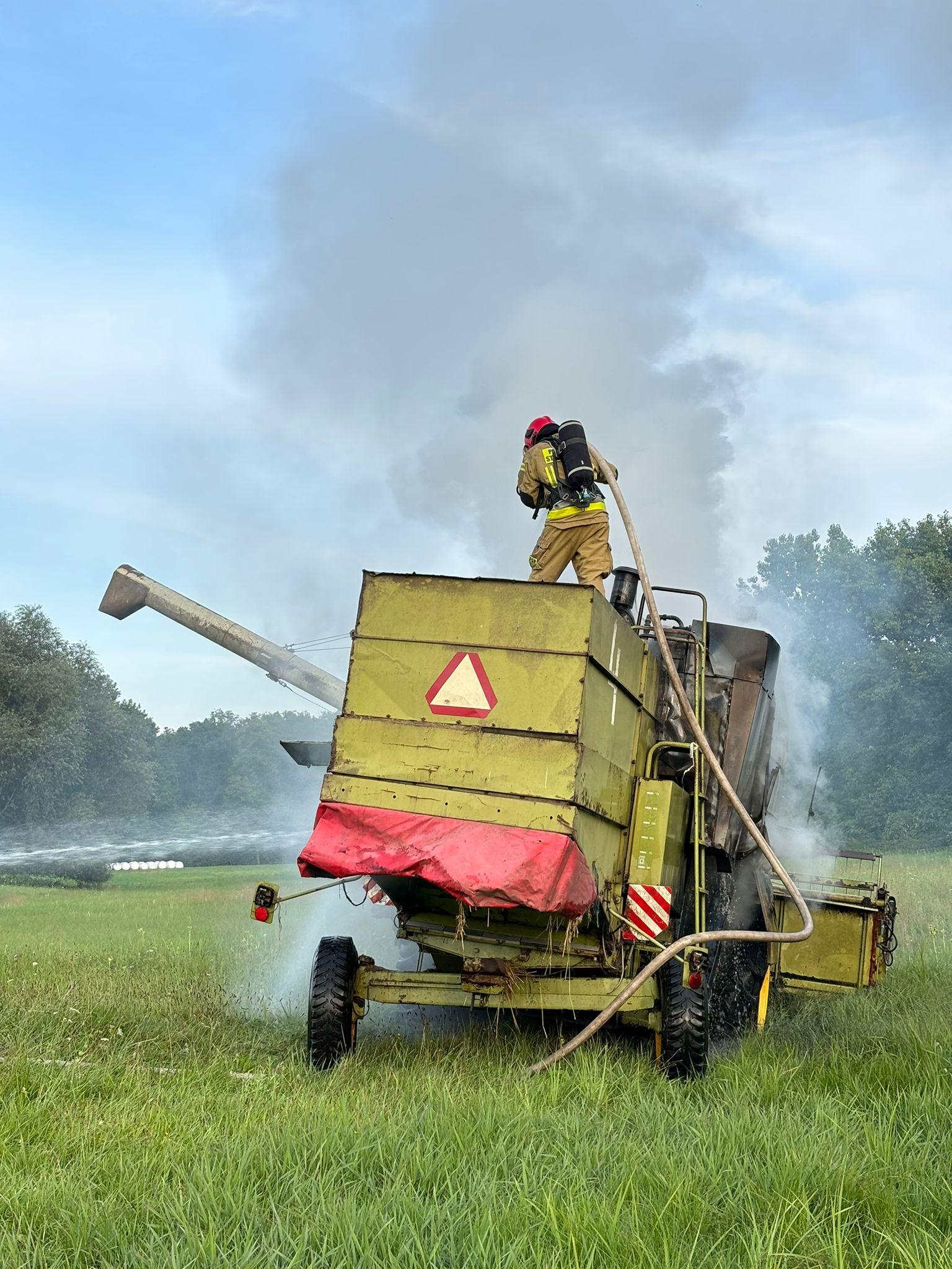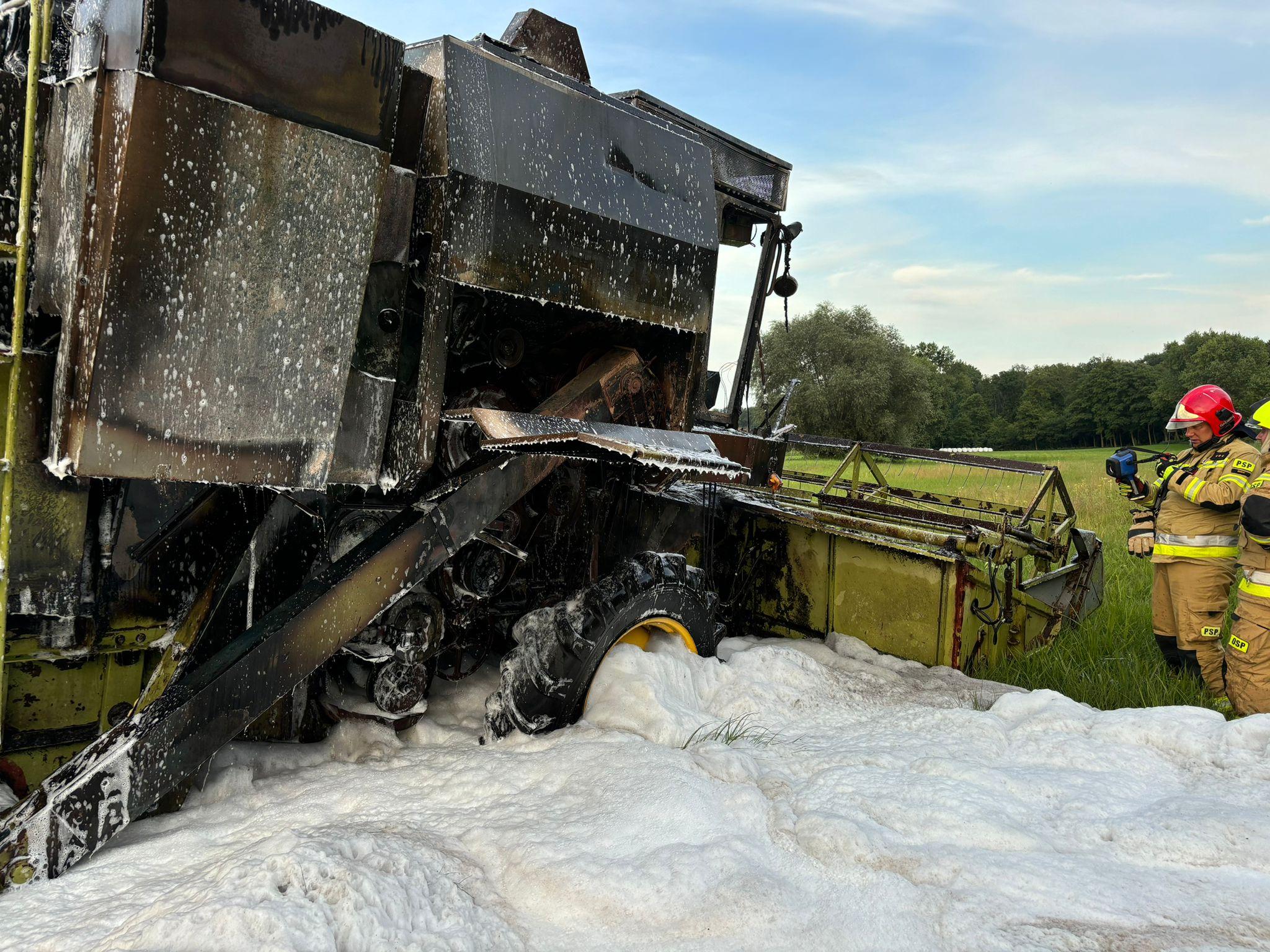 31.07.24 r. o godz. 19.00 do SKKP w Śremie wpłynęło zgłoszenie o palącym się kombajnie w miejscowości Pinka. Działania SP polegały na zabezpieczeniu miejsca zdarzenia oraz podaniu dwóch prądów piany ciężkiej na palący się sprzęt rolniczy - kombajn, przez zabezpieczonych strażaków w środki ochrony indywidualnej oraz aparaty ochrony układu oddechowego. Z relacji właściciela/operatora po zauważeniu dymu, zjechał on na pobliską łąkę, a następnie przystąpił do próby ugaszenia ognia przy pomocy dwóch gaśnic. Próba ta okazała się jednak nieskuteczna. -