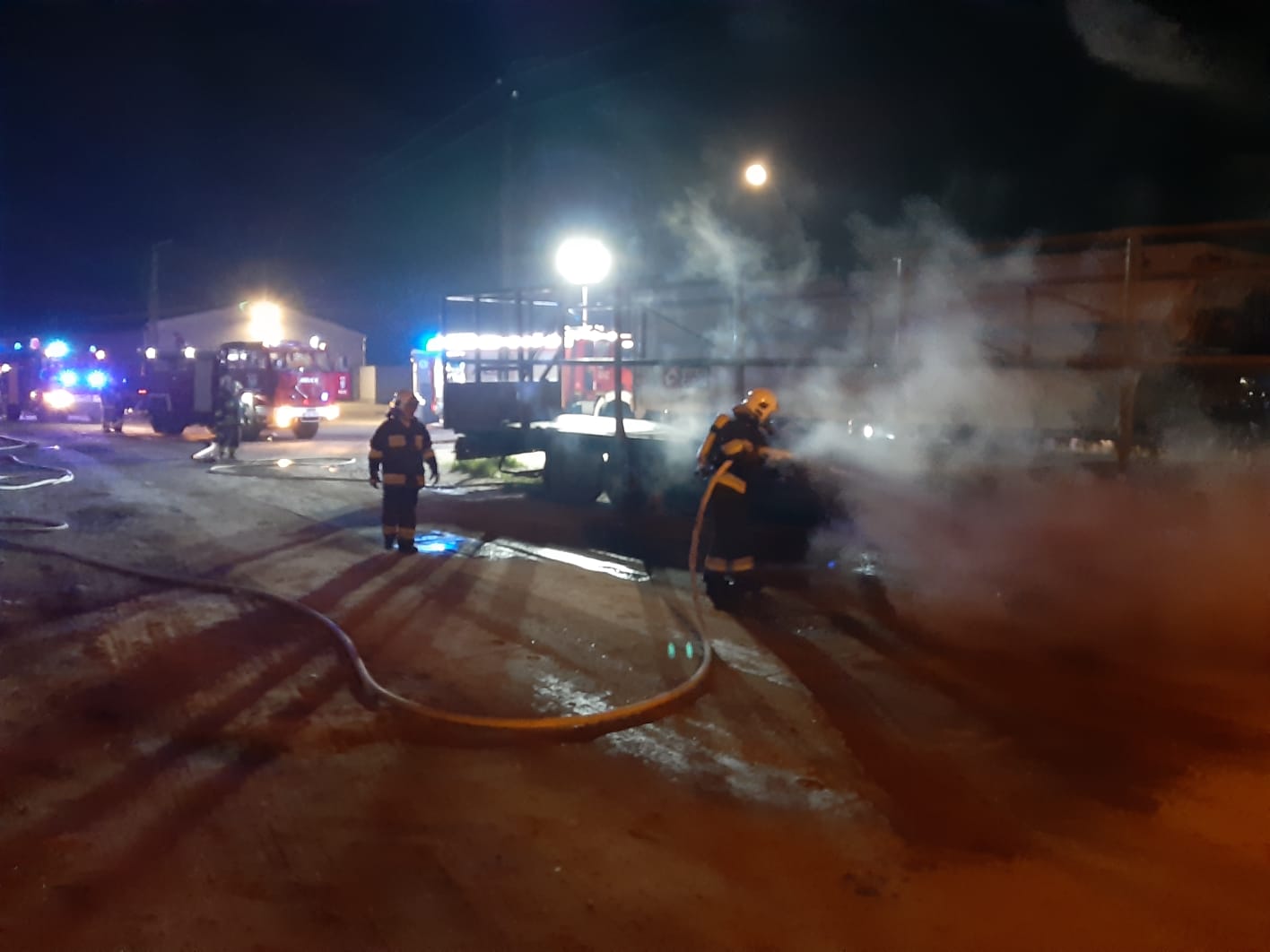 Pod wskazany adres niezwłocznie zadysponowano dwa zastępy JRG Śrem oraz po jednym zastępie OSP Dolsk i Małachowo. Po przybyciu na miejsce akcji stwierdzono, że pożarem objęta została naczepa pojazdu oraz częściowo ciągnik siodłowy marki Mercedes Actos. Działania SP polegały na zabezpieczeniu miejsca zdarzenia. Dwie roty ratowników wyposażone w sprzęt OUO podały dwa prądy gaśnicze w natarciu na palącą się naczepę ciągnika siodłowego jak również sam ciągnik siodłowy.Całość sprawdzono kamerą termowizyjną Drager UFC9000, pomiary nie wskazywały nieprawidłowości. Udział 4 zastępy 21 ratowników w tym dowódca JRG Śrem.
