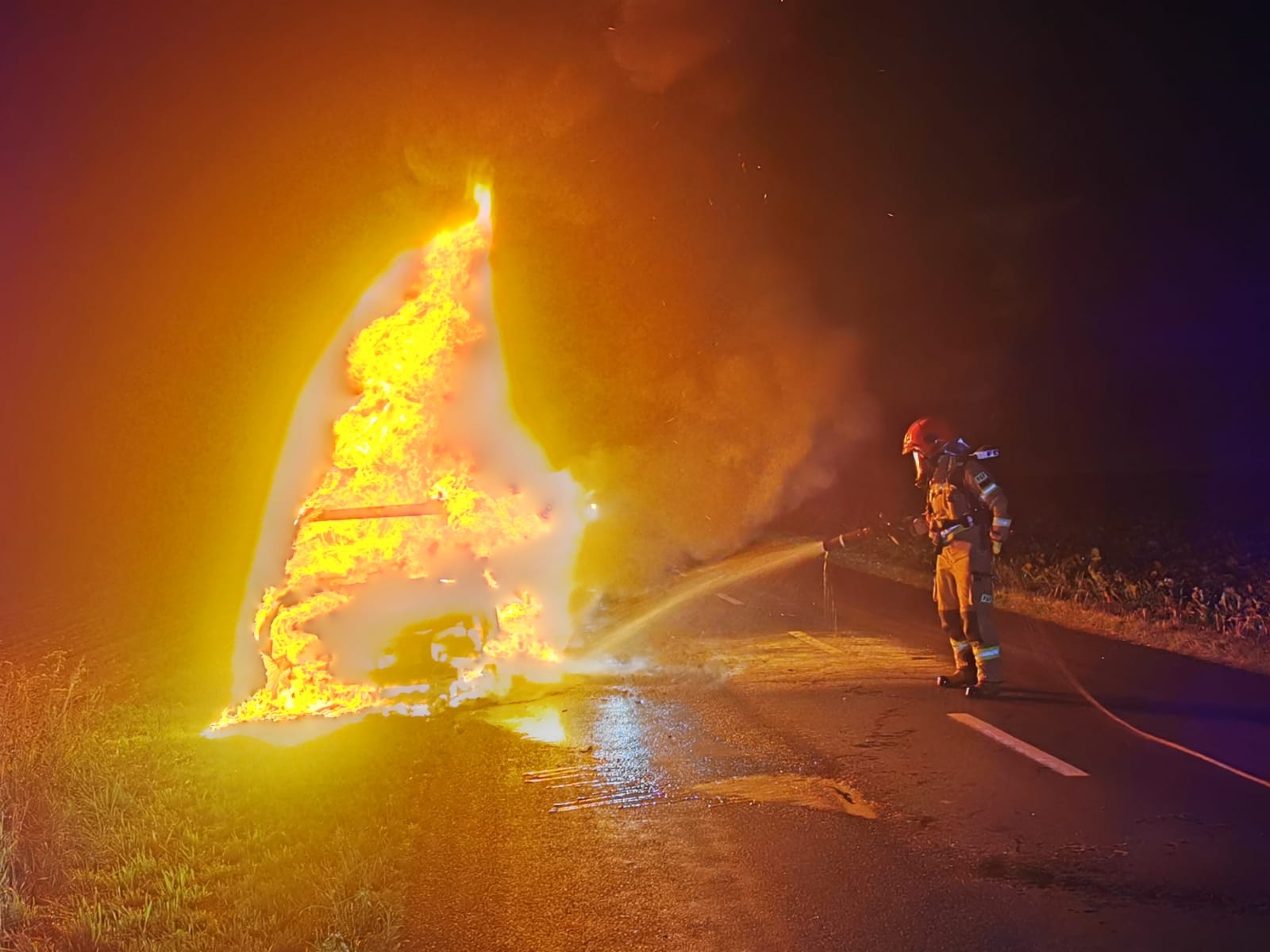 Po przybyciu zadysponowanych zastępów na miejsce zdarzenia ustalono, że pali się samochód osobowy, cały objęty ogniem. Działania JOP polegały na zabezpieczeniu miejsca zdarzenia, podaniu dwóch prądów gaśniczych w natarciu przez zabezpieczonych w ODO ratowników. Po ugaszeniu pojazdu został on sprawdzony przy pomocy kamery termowizyjnej, który następnie został przekazany właścicielowi. Udział 3 zastepy JOP 15 ratowników.